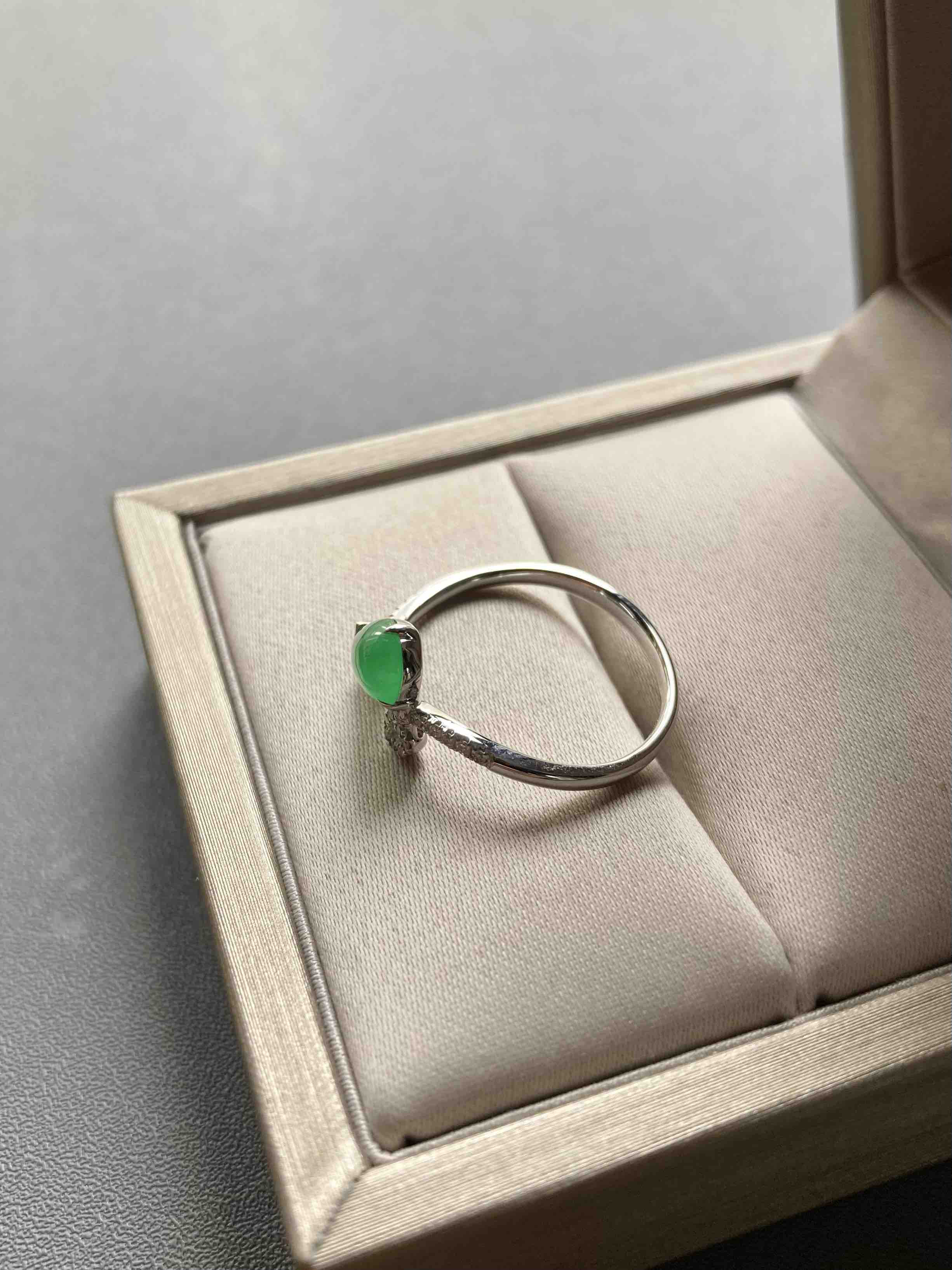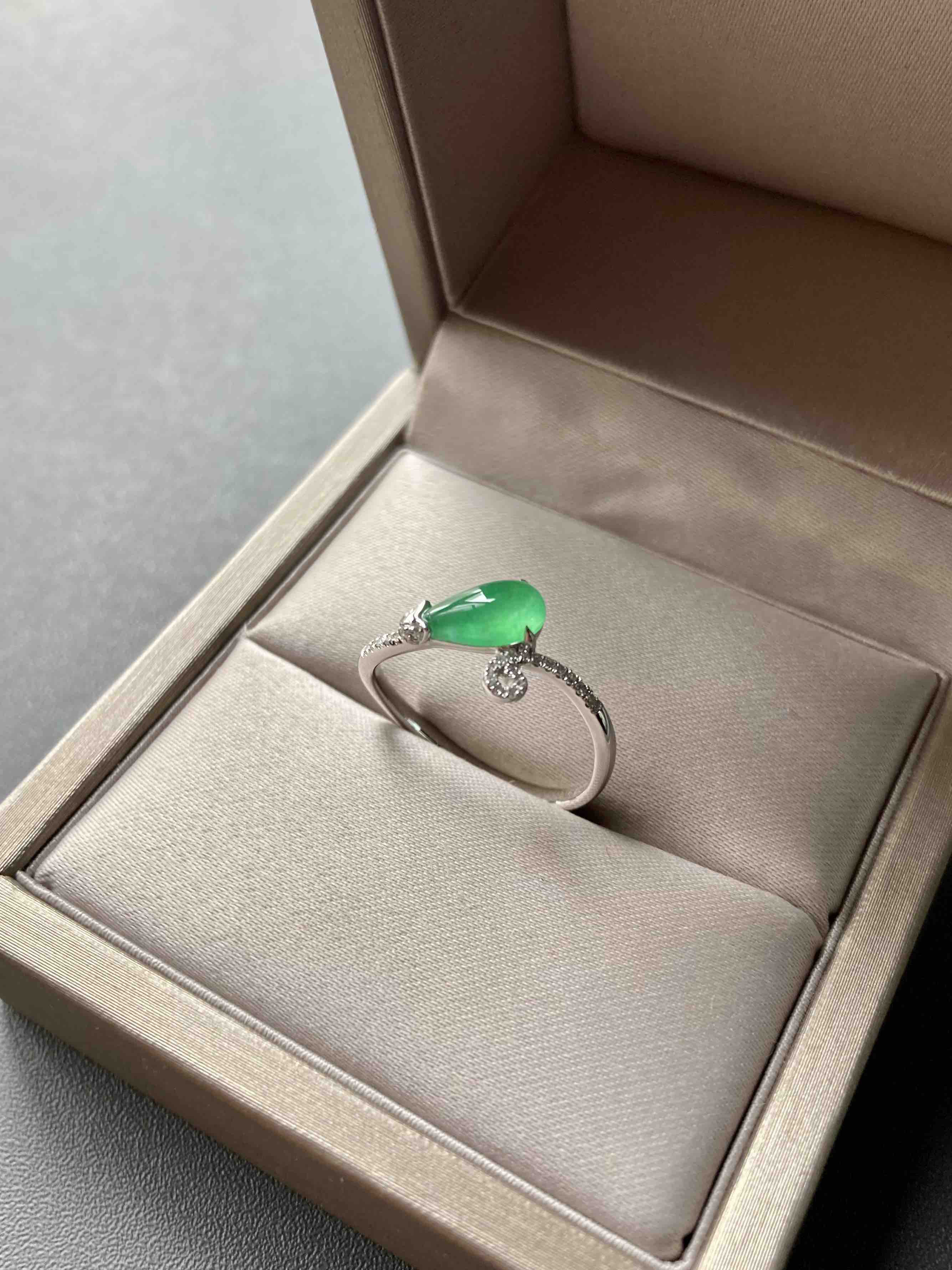 一抹鲜绿,这颜色也太仙了,高冰种阳绿翡翠水滴戒指,阳绿艳丽,荧光四射,就像一个会发光的灯泡一样,18k白金钻石镶嵌,上手太美啦,上新优惠别错过哦,机不可失,水滴9.7×5.2×2.2mm,圈号13可改大小