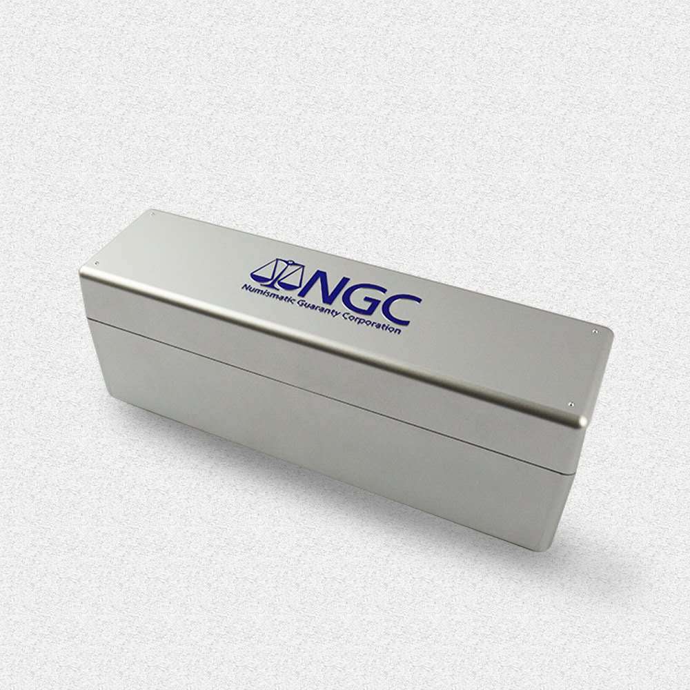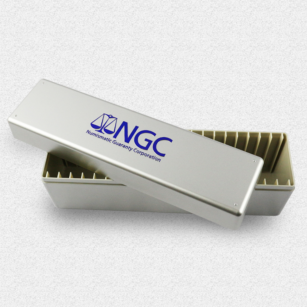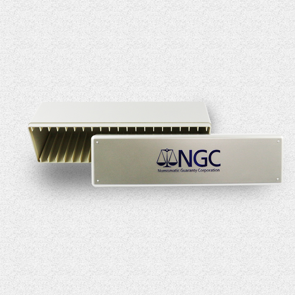 NGC收纳盒由耐用塑料制成,非常适用于存储和运输NGC评级币,且便于存放在保险柜中或是打包装进袋子或盒子中。储币盒尺寸为25.5cm x 6.5cm x 8.5cm 。