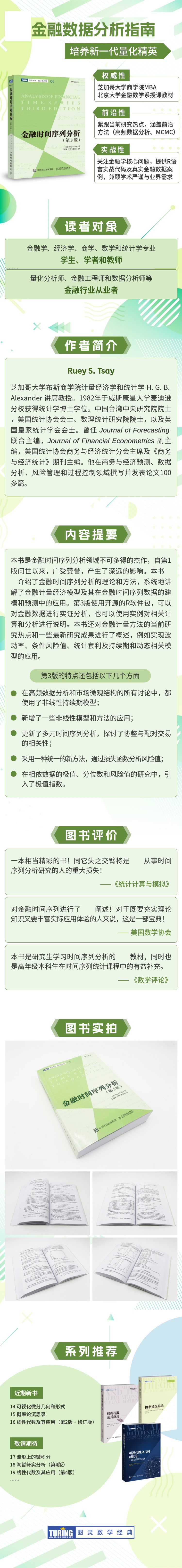 本书*阐述了金融时间序列,并主要介绍了金融时间序列理论和方法的当前研究热点和一些**新研究成果,尤其是风险值计算、高频数据分析、随机波动率建模和马尔可夫链蒙特卡罗方法等方面。此外,本书还系统阐述了金融计量经济模型及其在金融时间序列数据和建模中的应用,所有模型和方法的运用均采用实际金融数据,并给出了所用计算机软件的命令。较之第 2版,本版不仅更新了上一版中使用的数据,而且还给出了R命令和实例,从而使其成为理解重要统计方法和技术的奠基石. 本书可作为时间序列分析的教材,也适用于商学、经济学、数学和统计学专业对金融的计量经济学感兴趣的高年级本科生和研究生,同时,也可作为商业、金融、保险等领域专业人士的参考用书。