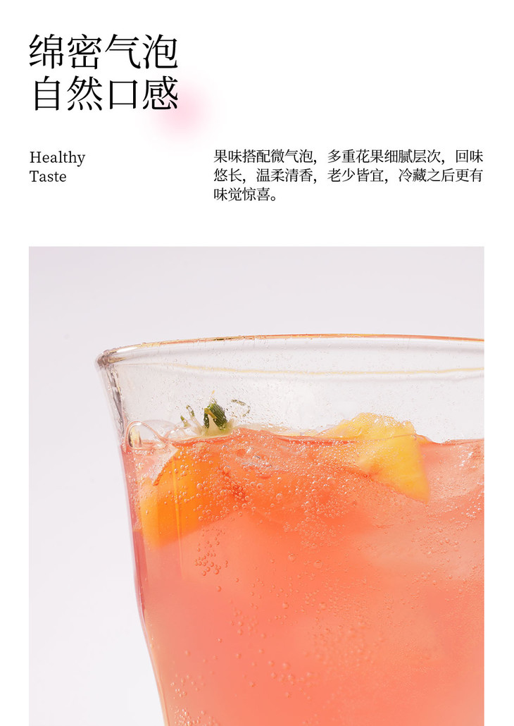 望桃花(希望你收获甜蜜爱情),原料以白桃原汁、茉莉花、玫瑰茄、金银花、水和冰糖为主,甜甜的白桃味,一口就能爱上,喝起来仿佛能感受到桃桃果肉的存在,桃味配上茉莉玫瑰,鼻腔会有淡淡花香。