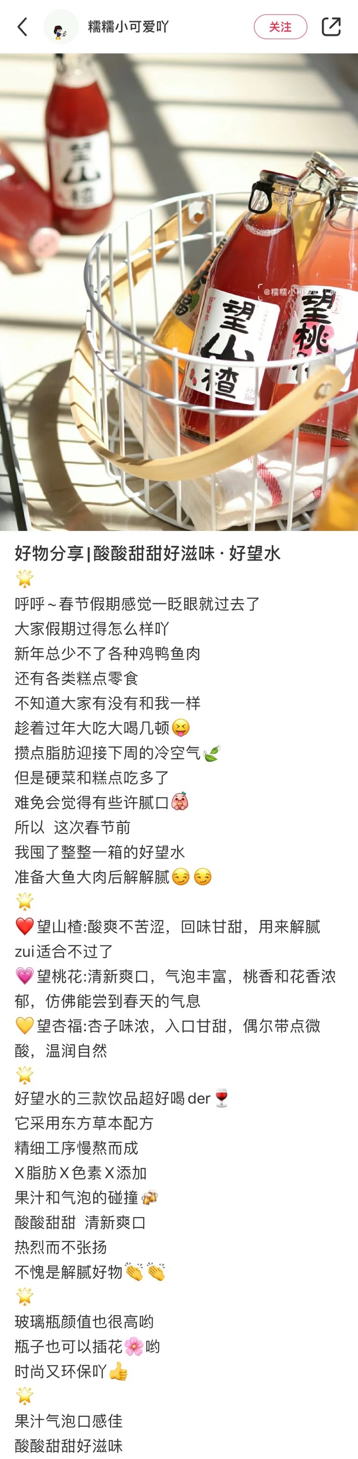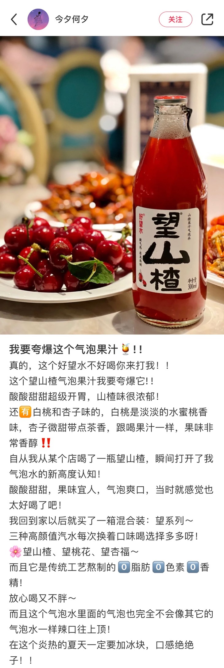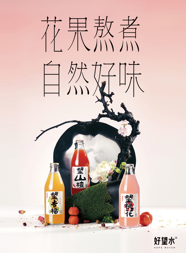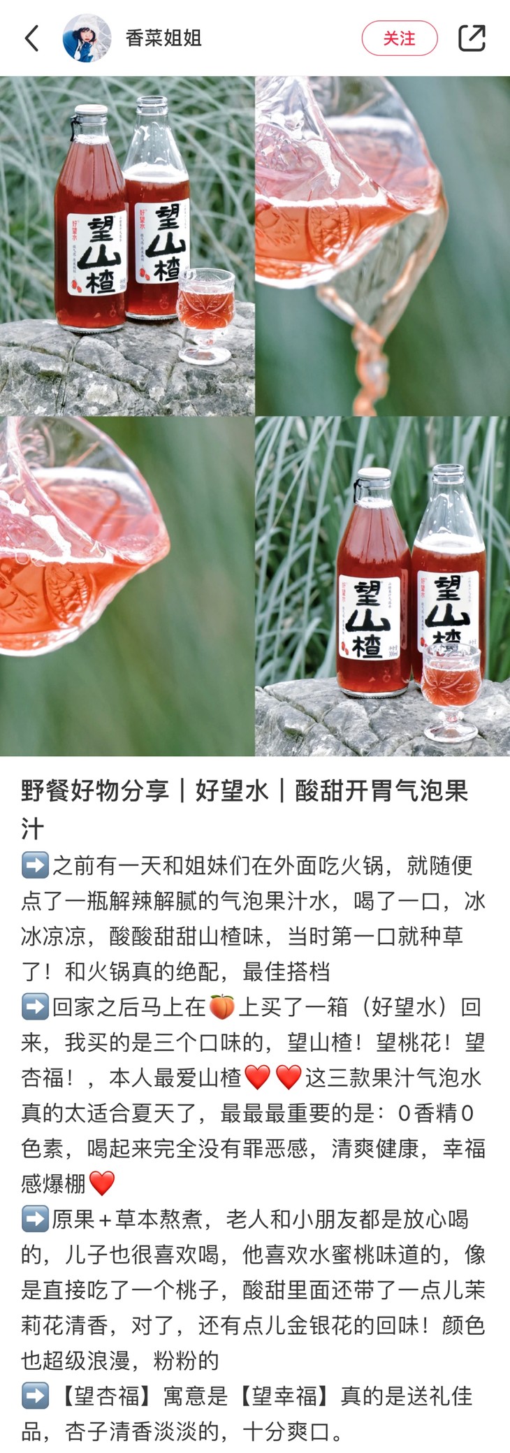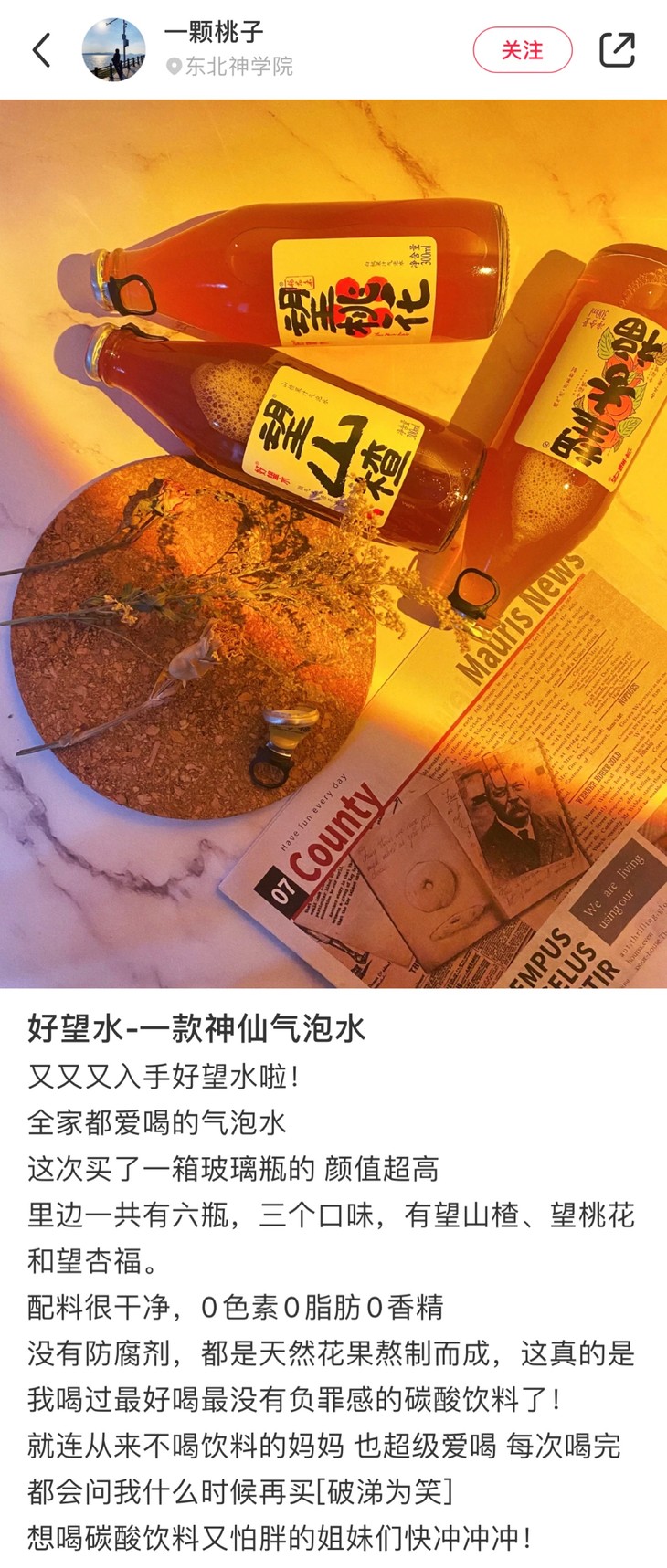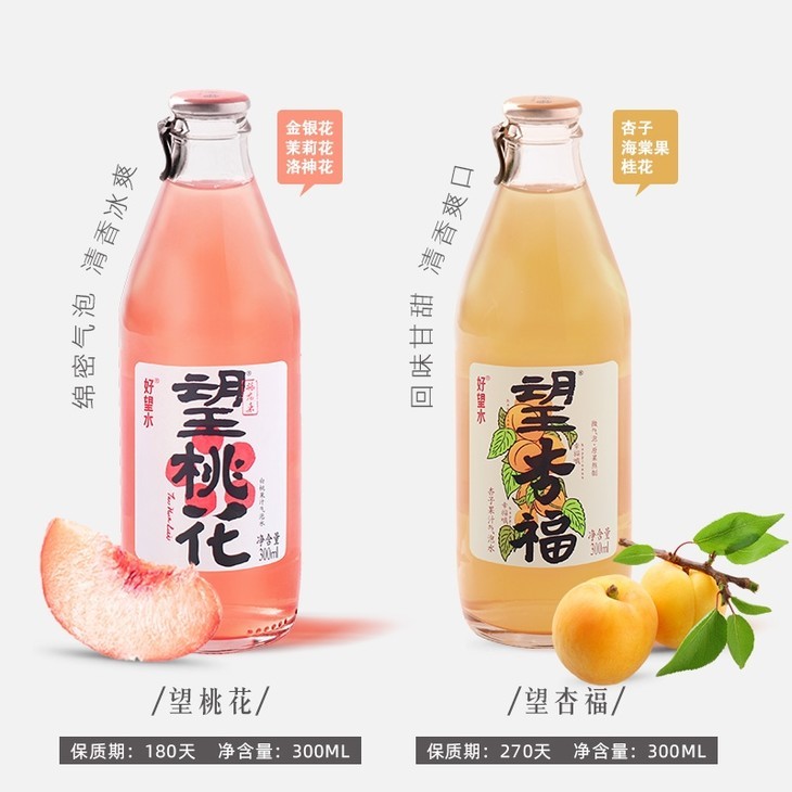 也许大家听到“好望水”会有点陌生,但如果提到它家的王牌“望山楂”,就算没喝过,也有所耳闻,因为它实在太火了!!!好望水,作为新草本熬制气泡果汁品牌,从产品诞生开始,就专注于将中国地方传统特色果子草本进行组合与创新,借用精酿啤酒的设备与工艺,将山间好物进行分段熬制。保留营养成分的同时,无额外添加防腐剂,满瓶真诚。面世短短3年,各大线下商超销量“嗖嗖”暴涨,网红、博主也没躲过这阵狂风,在各类社交平台打call种草,名副其实的新一代“国潮饮品”!好望水在果子的选择上,多采用中国本土的温带水果(杏子、桃子、山楂),再加入一些有本土特色的食材加以调配,酸甜多汁、果味真实、健康好喝,绝对是“快乐肥宅水”的完美替代,而且非常出片!如今好望水家族有4款口味:望山楂、望杏福、望桃花、望梅好!