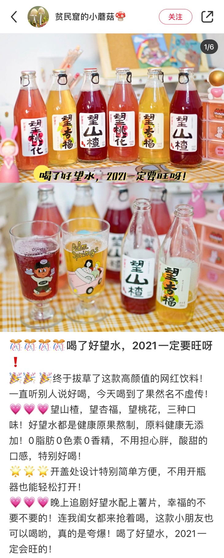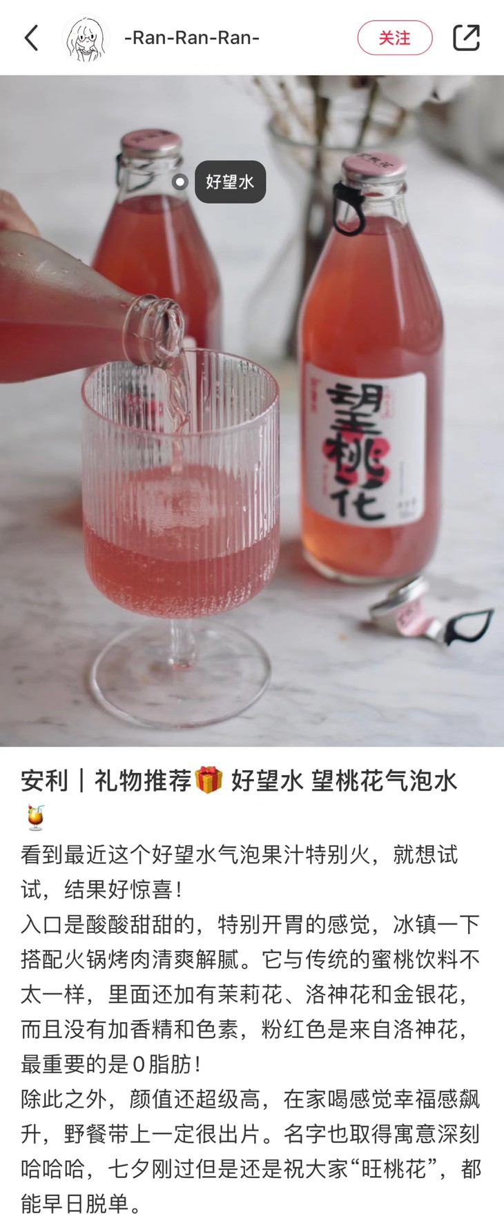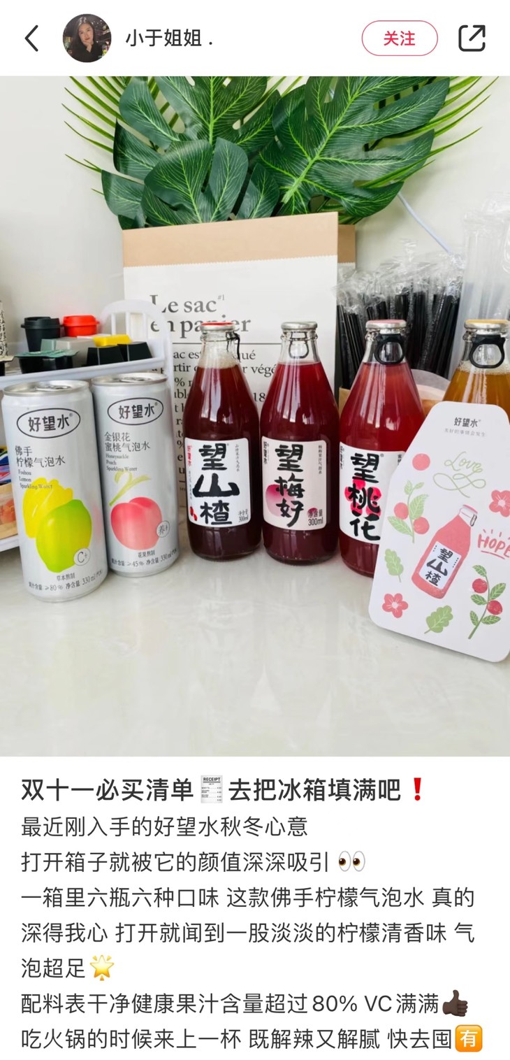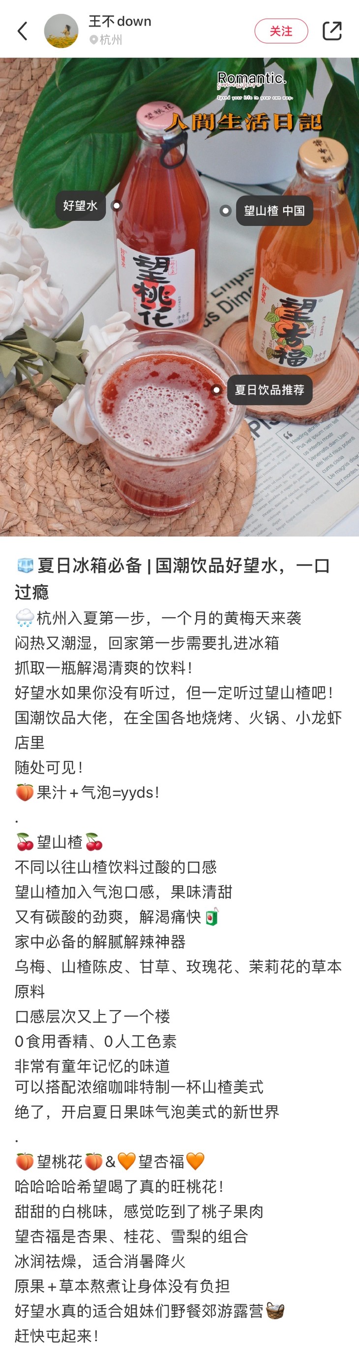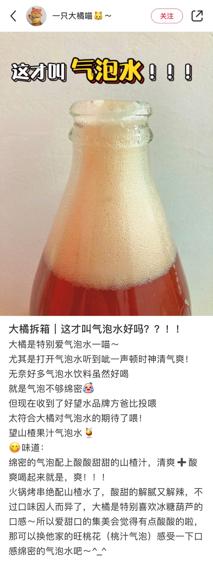 也许大家听到“好望水”会有点陌生,但如果提到它家的王牌“望山楂”,就算没喝过,也有所耳闻,因为它实在太火了!!!好望水,作为新草本熬制气泡果汁品牌,从产品诞生开始,就专注于将中国地方传统特色果子草本进行组合与创新,借用精酿啤酒的设备与工艺,将山间好物进行分段熬制。保留营养成分的同时,无额外添加防腐剂,满瓶真诚。面世短短3年,各大线下商超销量“嗖嗖”暴涨,网红、博主也没躲过这阵狂风,在各类社交平台打call种草,名副其实的新一代“国潮饮品”!好望水在果子的选择上,多采用中国本土的温带水果(杏子、桃子、山楂),再加入一些有本土特色的食材加以调配,酸甜多汁、果味真实、健康好喝,绝对是“快乐肥宅水”的完美替代,而且非常出片!如今好望水家族有4款口味:望山楂、望杏福、望桃花、望梅好!