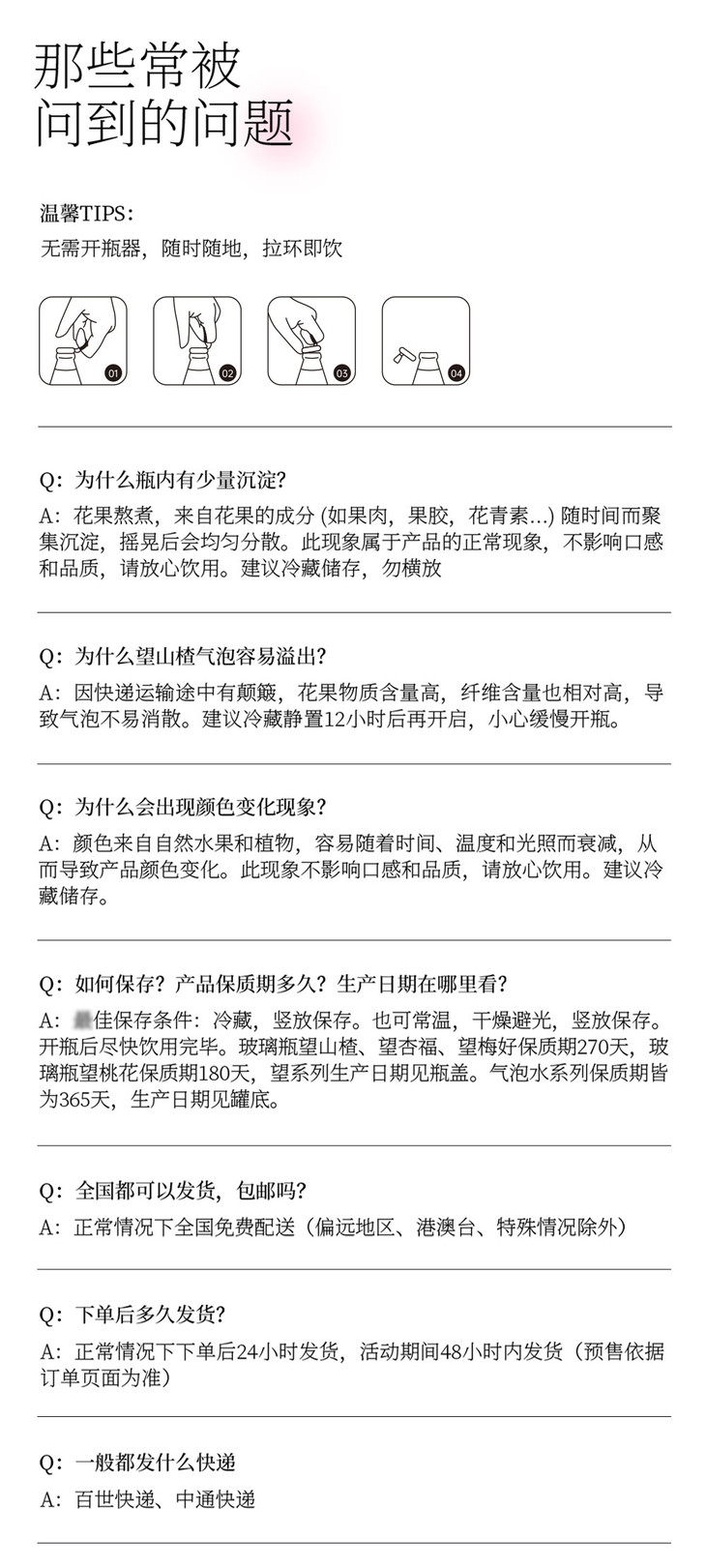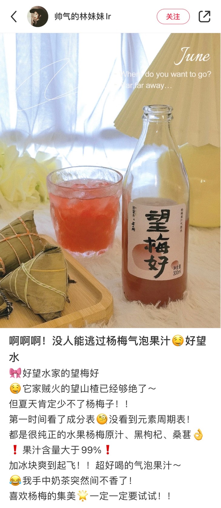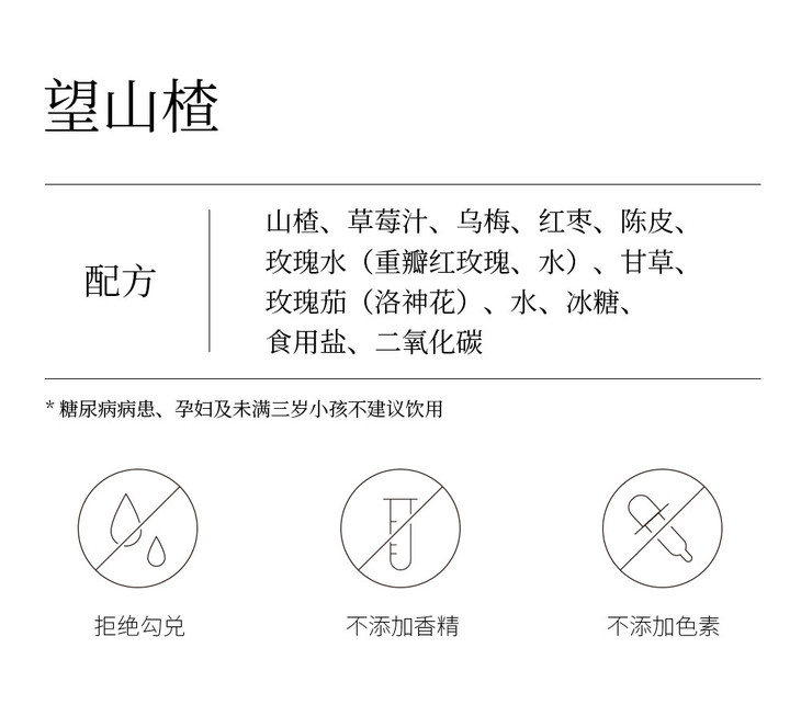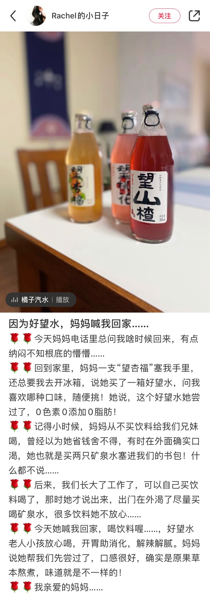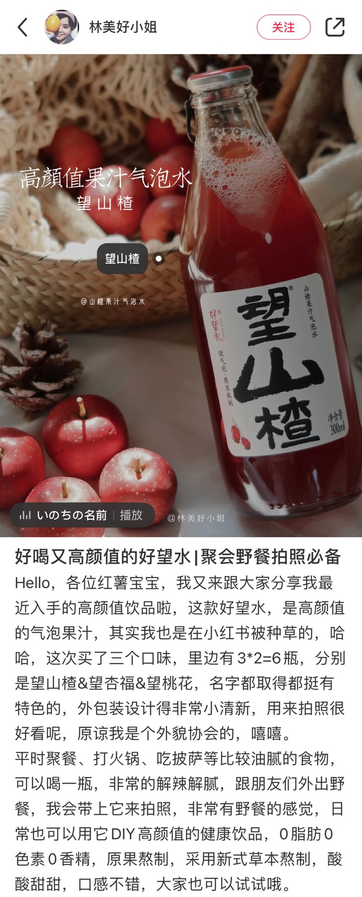也许大家听到“好望水”会有点陌生,但如果提到它家的王牌“望山楂”,就算没喝过,也有所耳闻,因为它实在太火了!!!好望水,作为新草本熬制气泡果汁品牌,从产品诞生开始,就专注于将中国地方传统特色果子草本进行组合与创新,借用精酿啤酒的设备与工艺,将山间好物进行分段熬制。保留营养成分的同时,无额外添加防腐剂,满瓶真诚。面世短短3年,各大线下商超销量“嗖嗖”暴涨,网红、博主也没躲过这阵狂风,在各类社交平台打call种草,名副其实的新一代“国潮饮品”!好望水在果子的选择上,多采用中国本土的温带水果(杏子、桃子、山楂),再加入一些有本土特色的食材加以调配,酸甜多汁、果味真实、健康好喝,绝对是“快乐肥宅水”的完美替代,而且非常出片!如今好望水家族有4款口味:望山楂、望杏福、望桃花、望梅好!