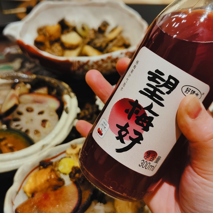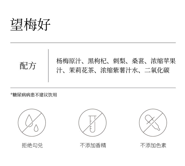 望梅好(希望你一切安好),原料是杨梅、茉莉花、黑枸杞、桑葚、刺梨和水。杨梅用的是慈溪的优质杨梅,汁很浓稠,不假甜,浓浓的杨梅味,这几年试喝的几款杨梅汁相比简直优秀了好几个LEVEL。