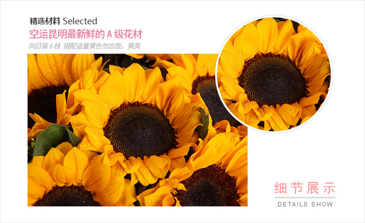 材料:6支向日葵,绿色桔梗花搭配,黄色勿忘我适量。包装:5-6张英文报包装,拉菲草打结。