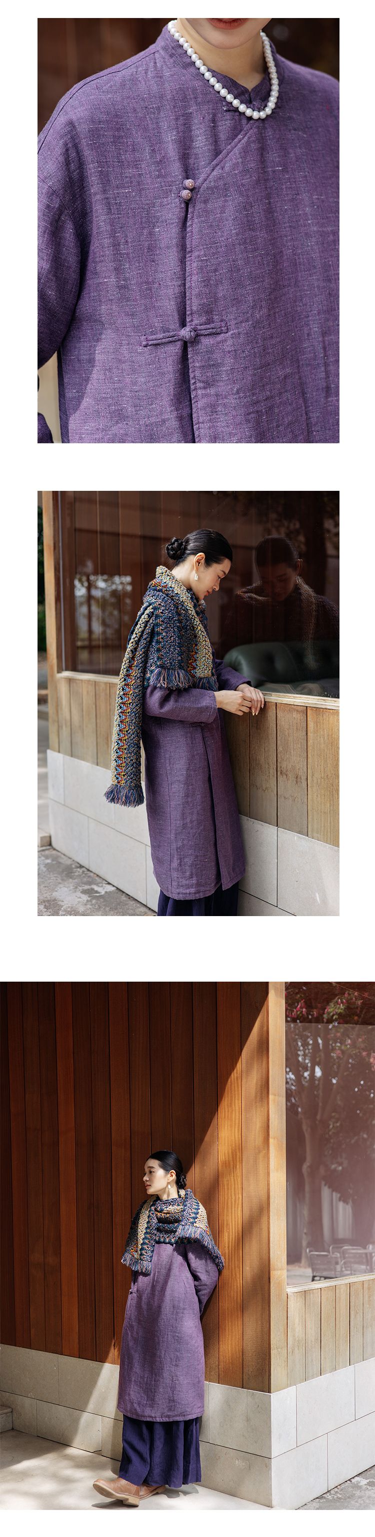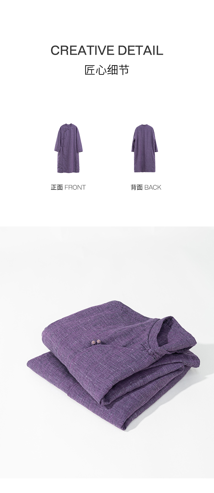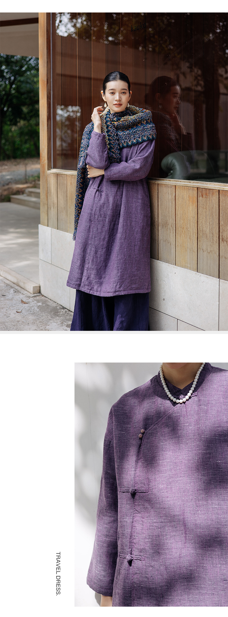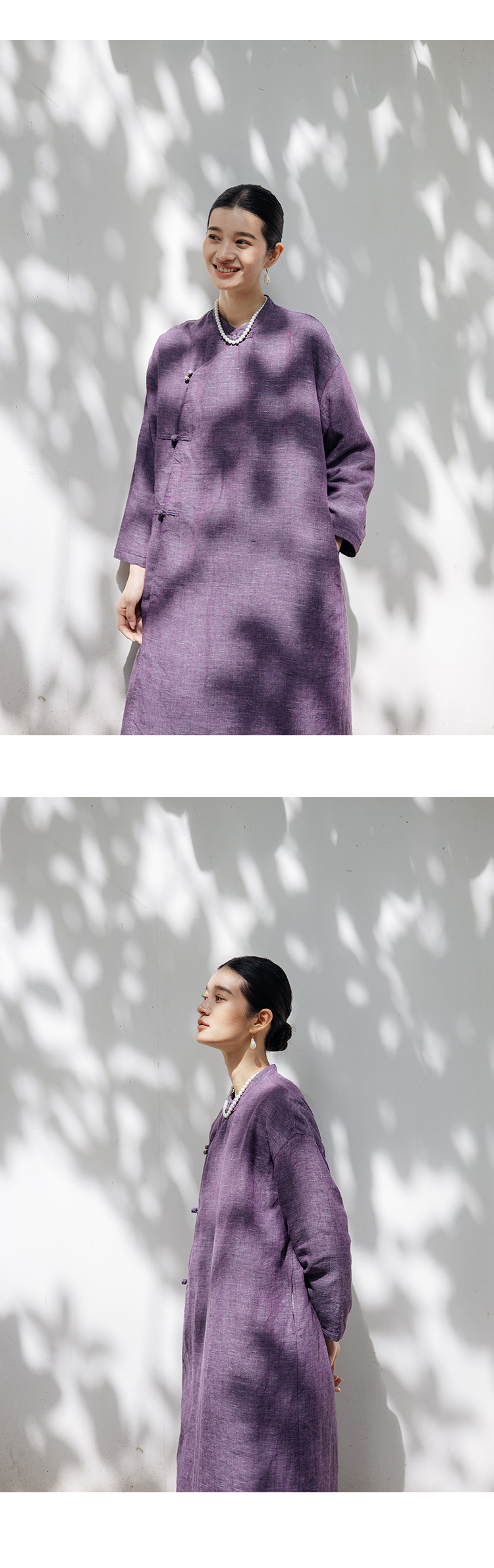 绽放847朵/紫气东来连衣裙亚麻色织新中式盘扣斜开门襟绗棉长裙