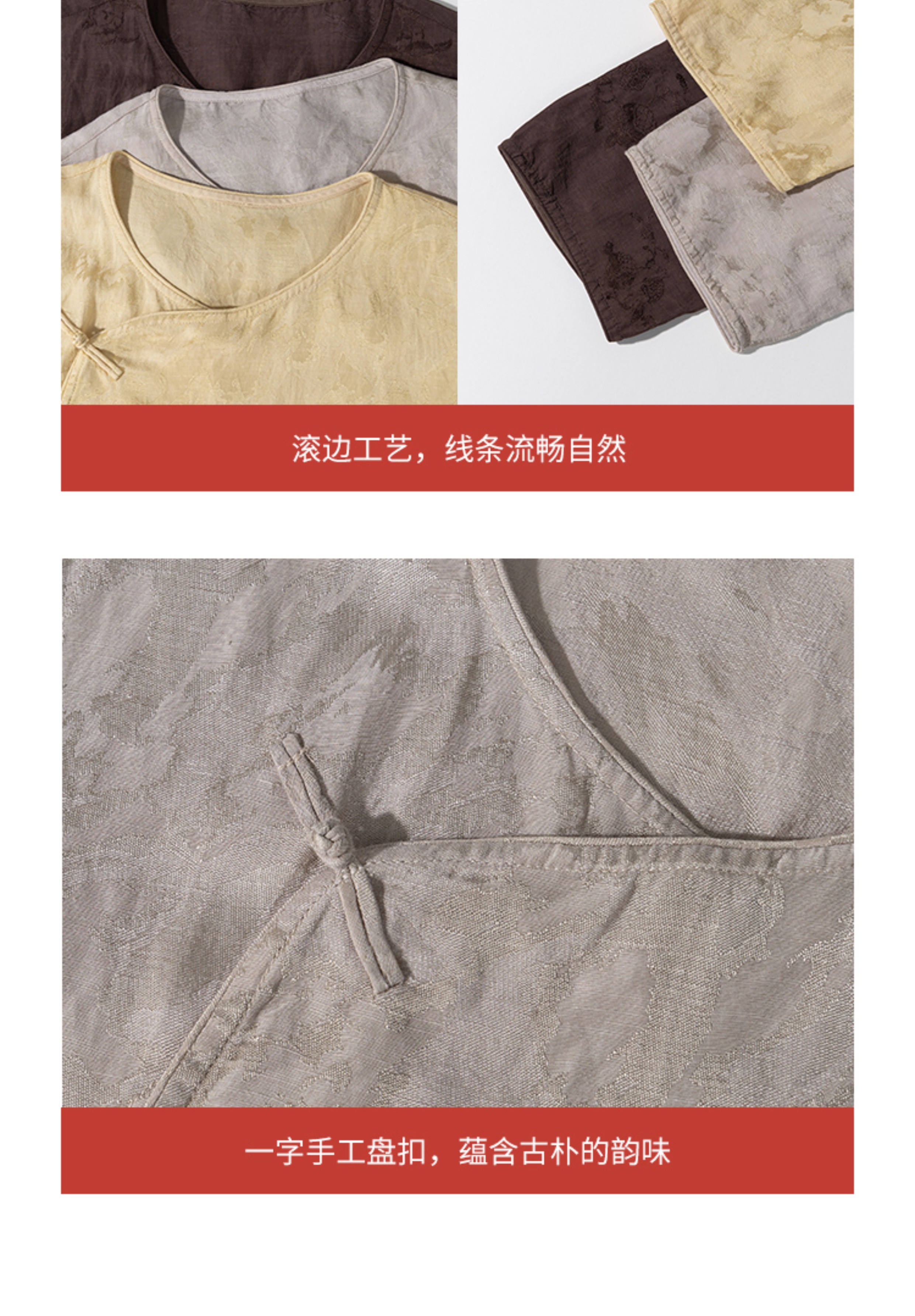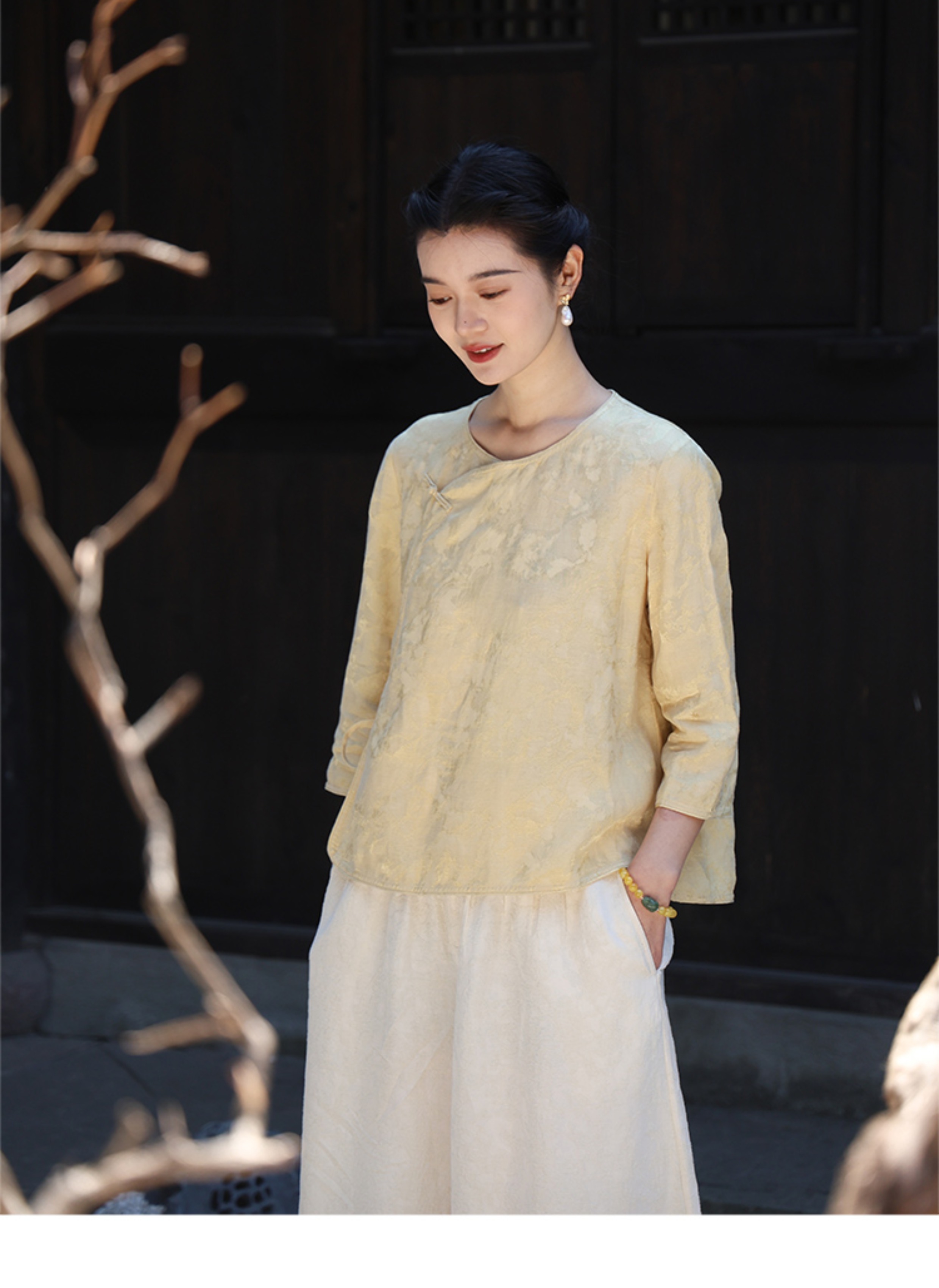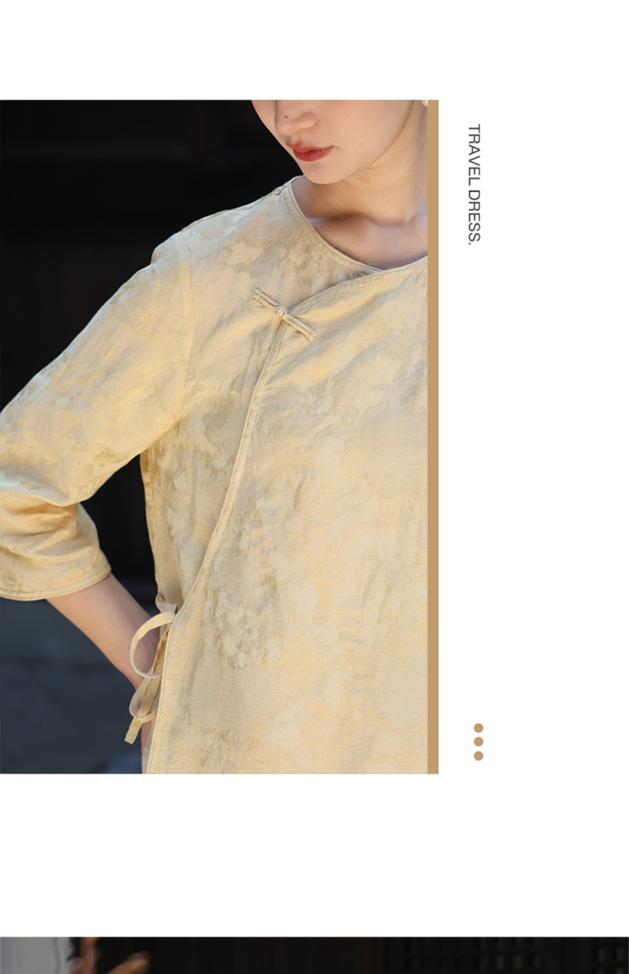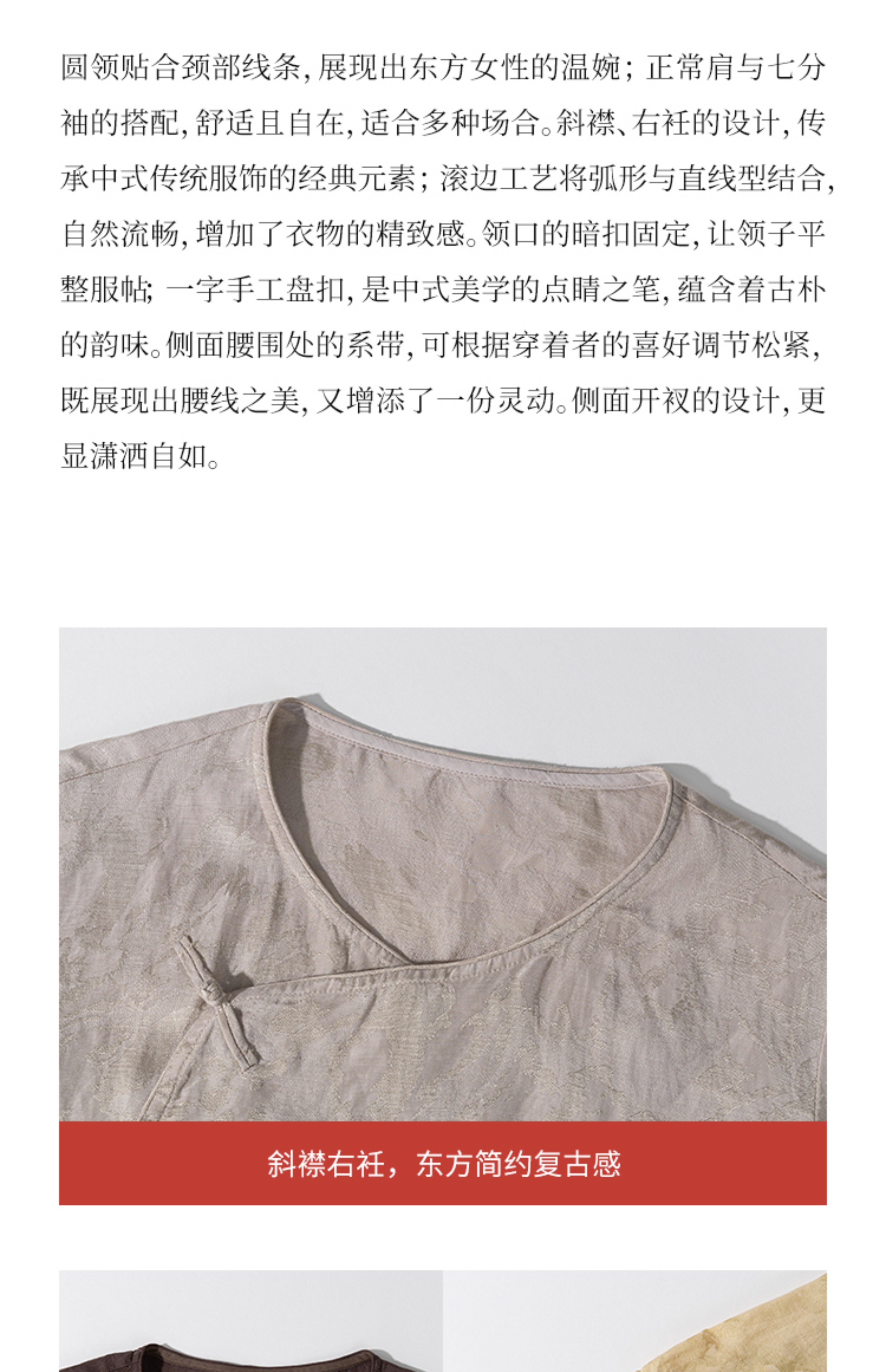 绽放旅行女装228朵/亚麻天丝提花新中式圆领斜襟连身七分袖衬衫女