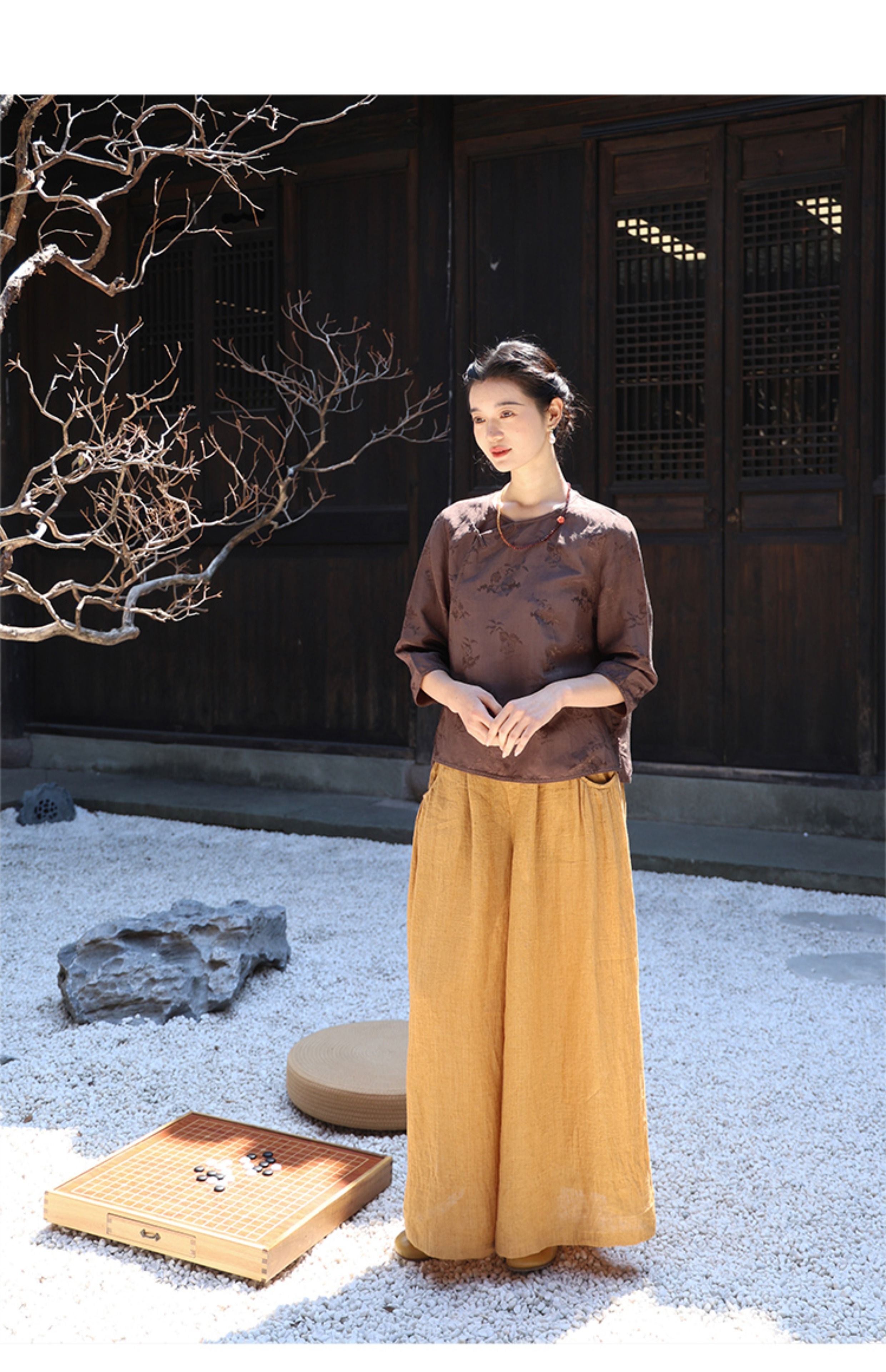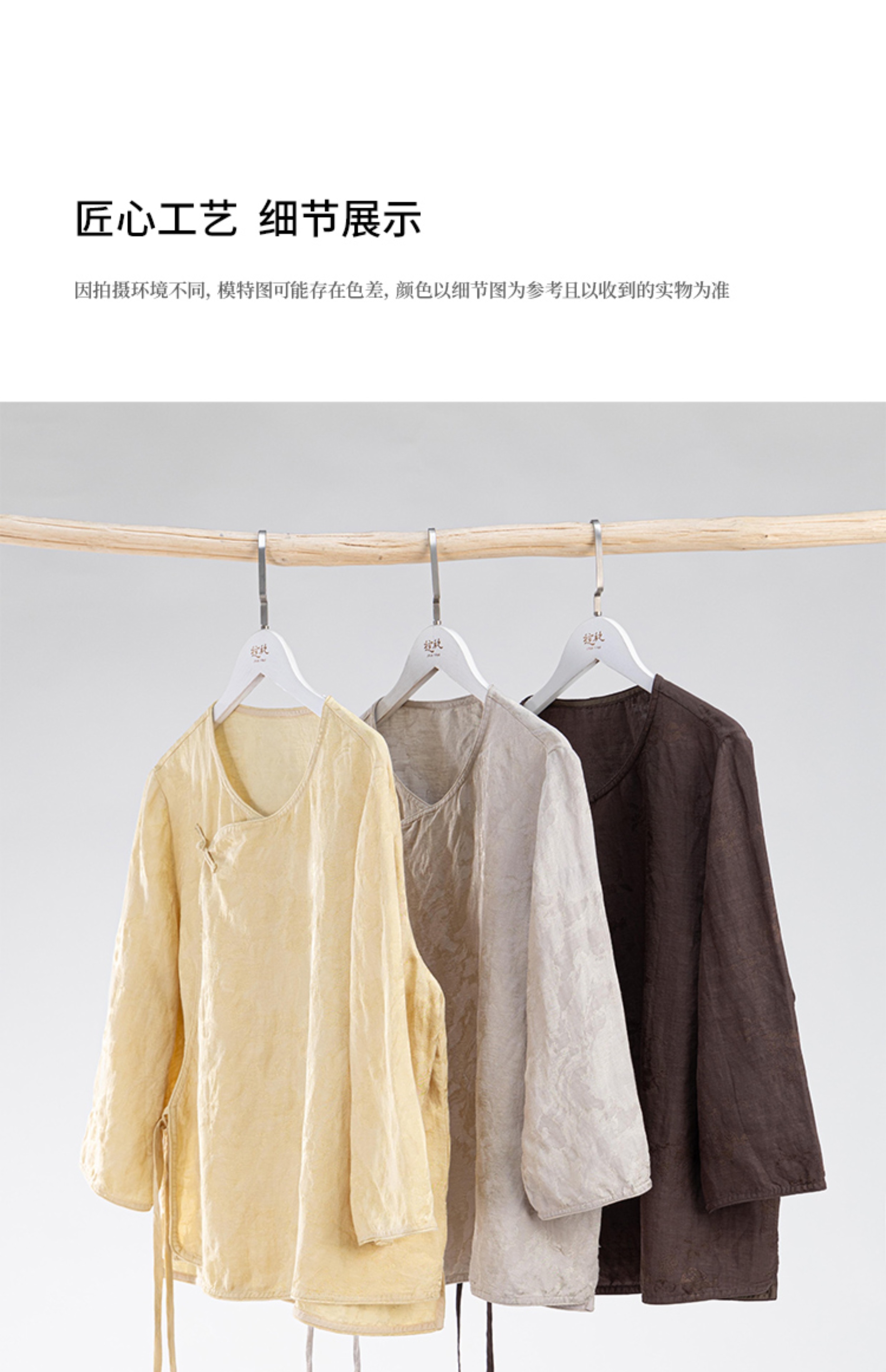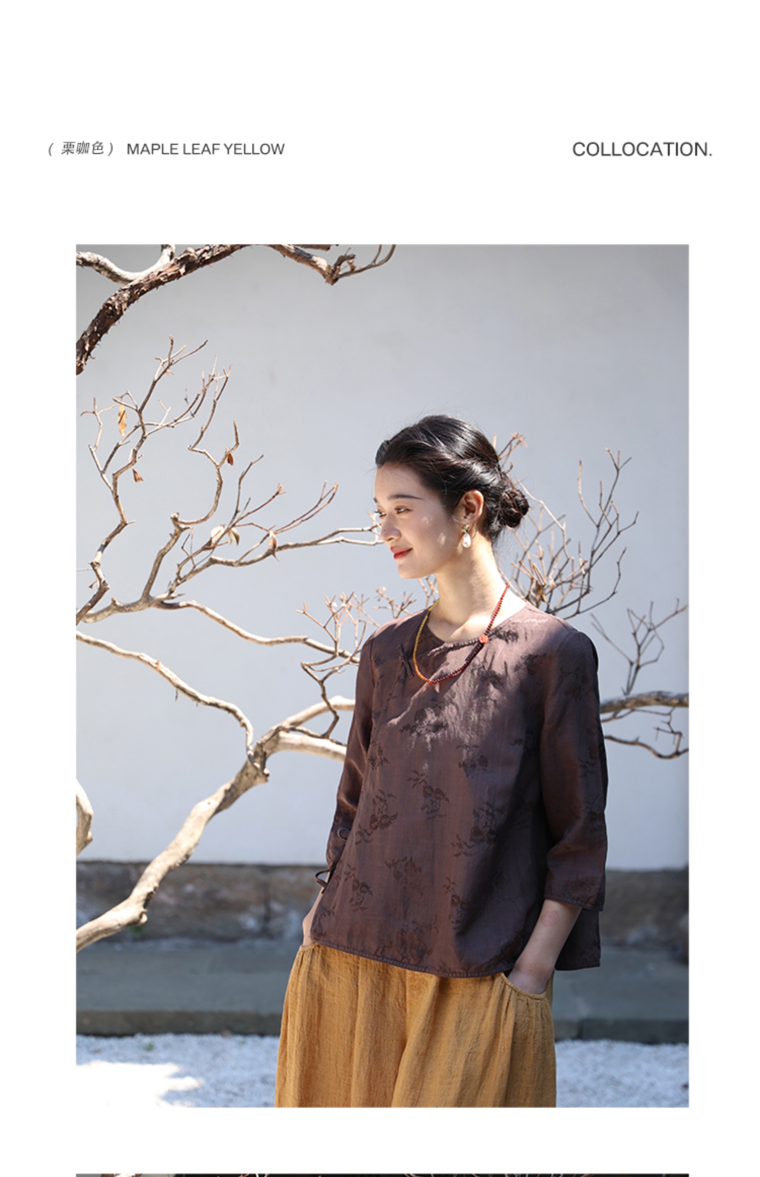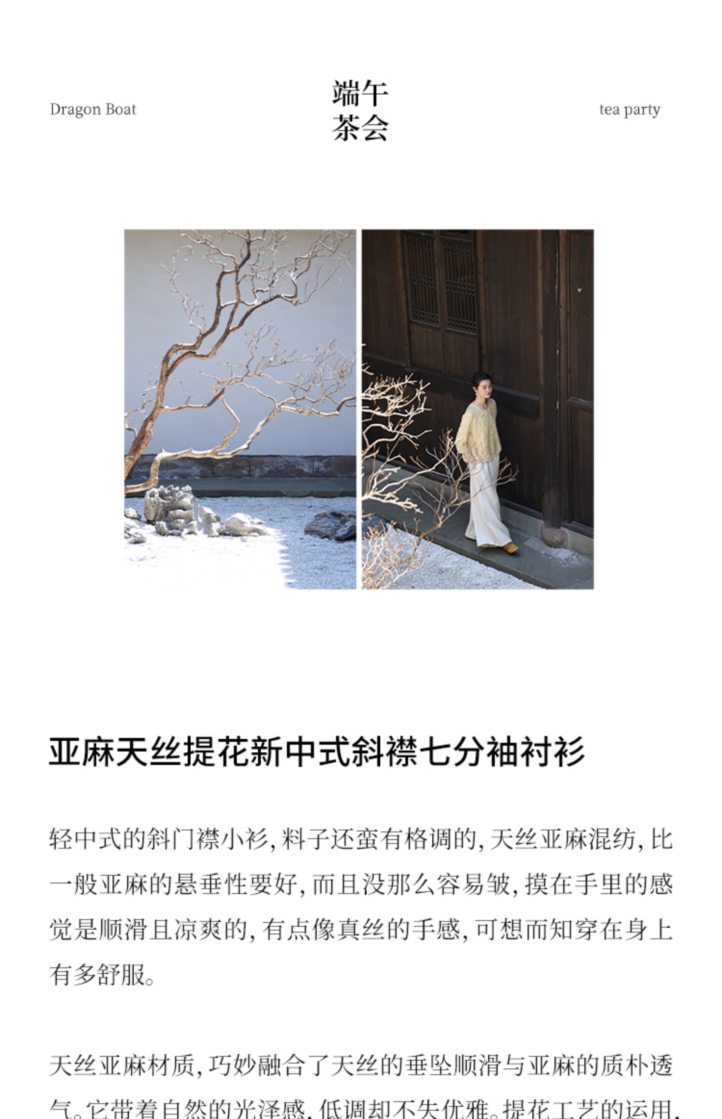 绽放旅行女装228朵/亚麻天丝提花新中式圆领斜襟连身七分袖衬衫女