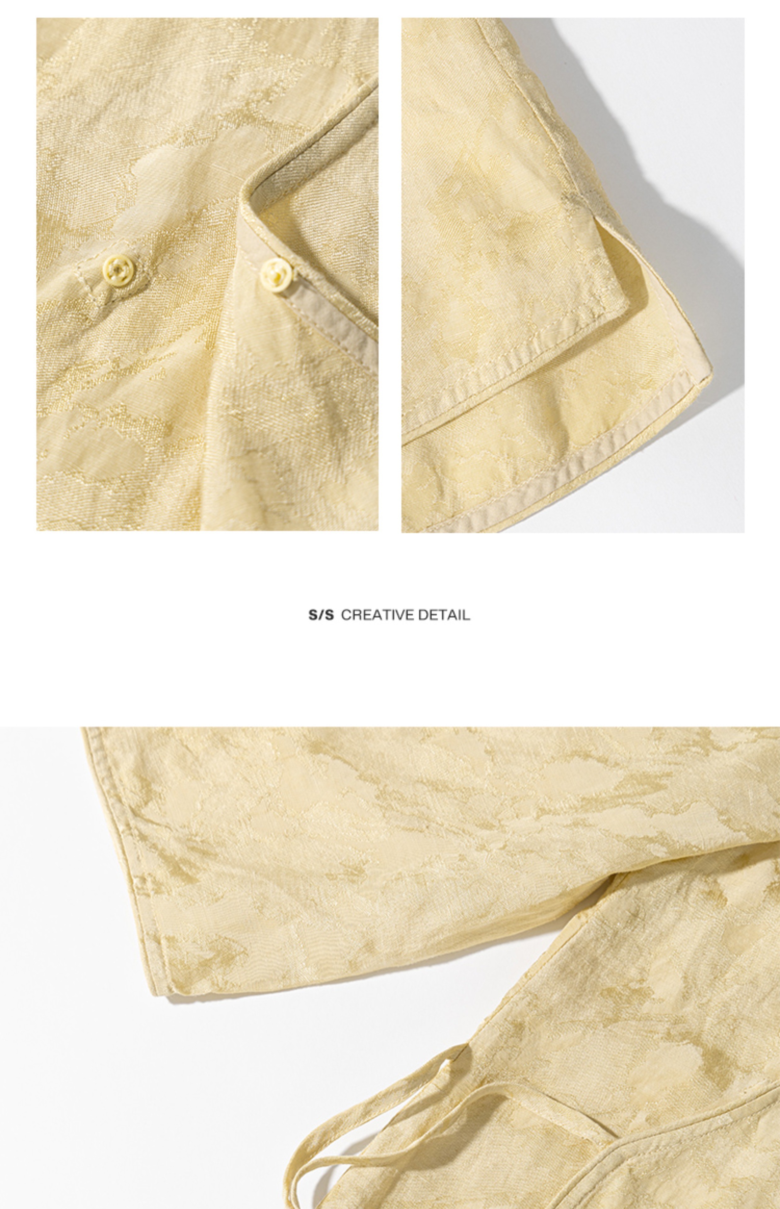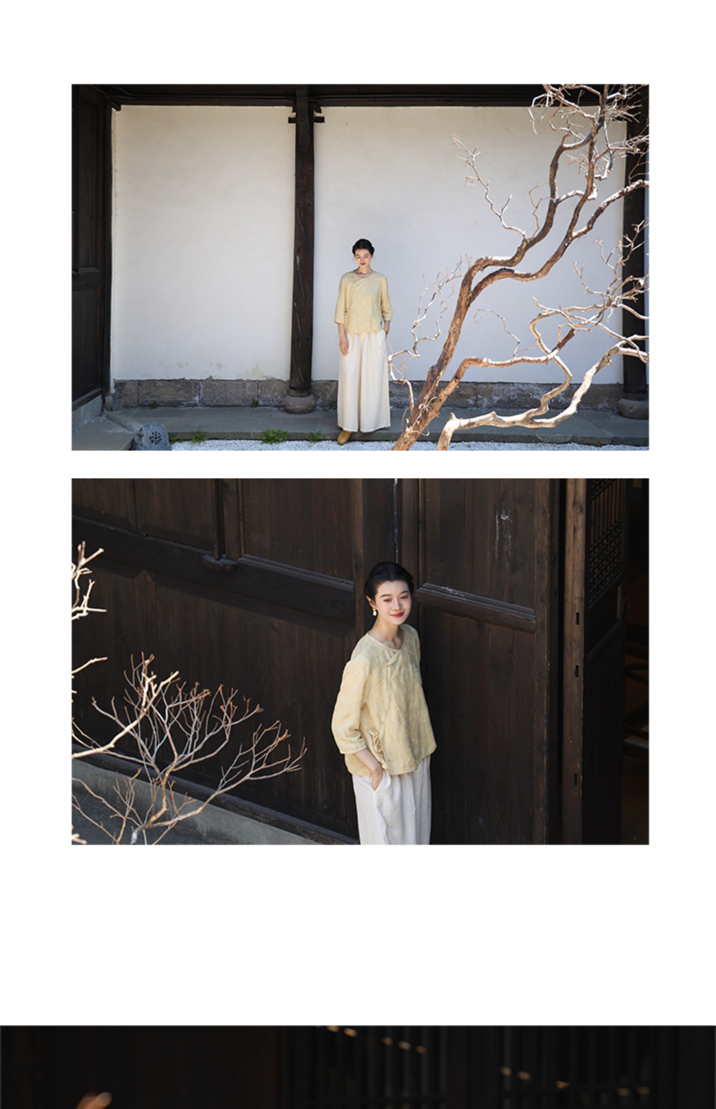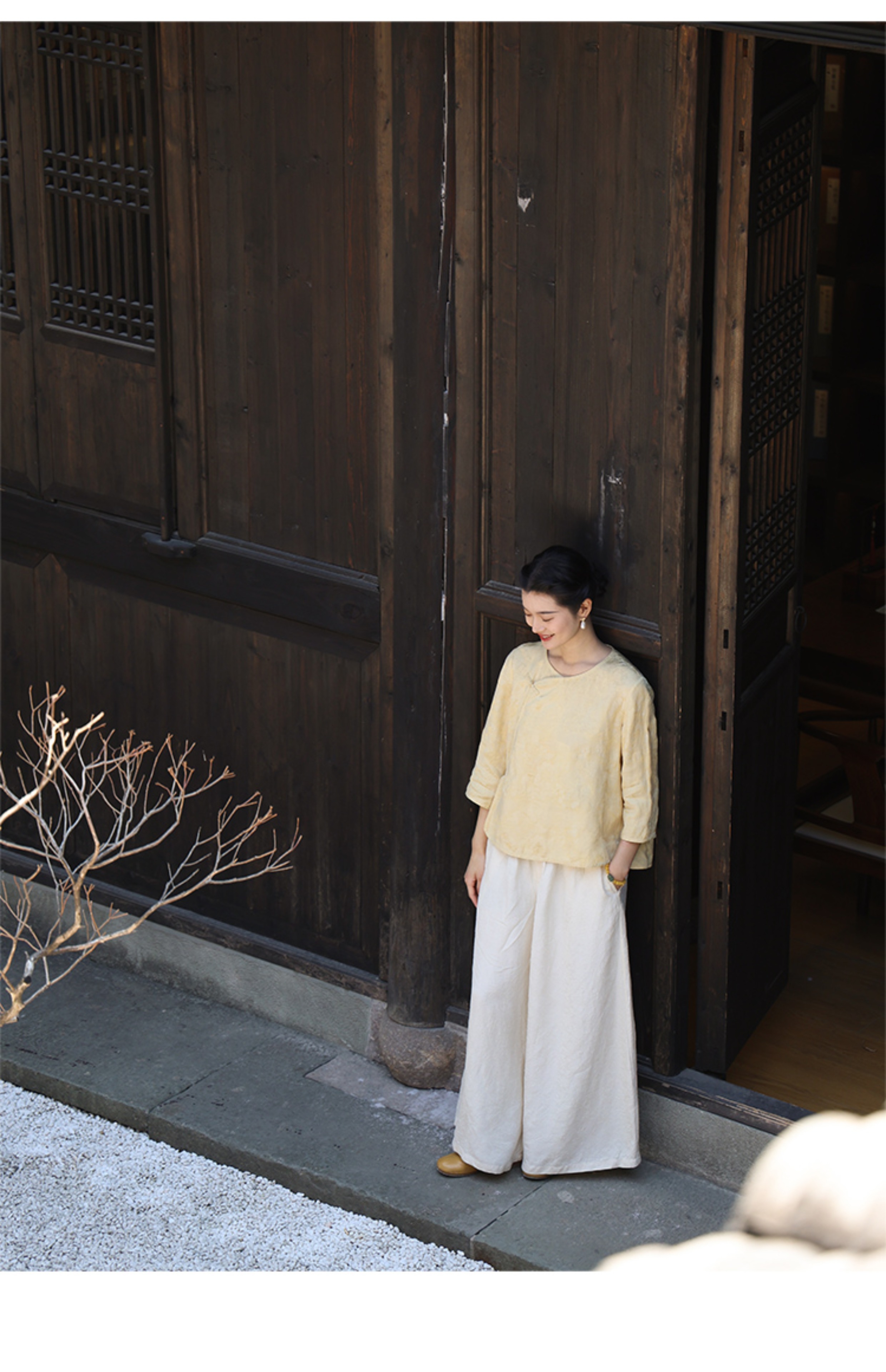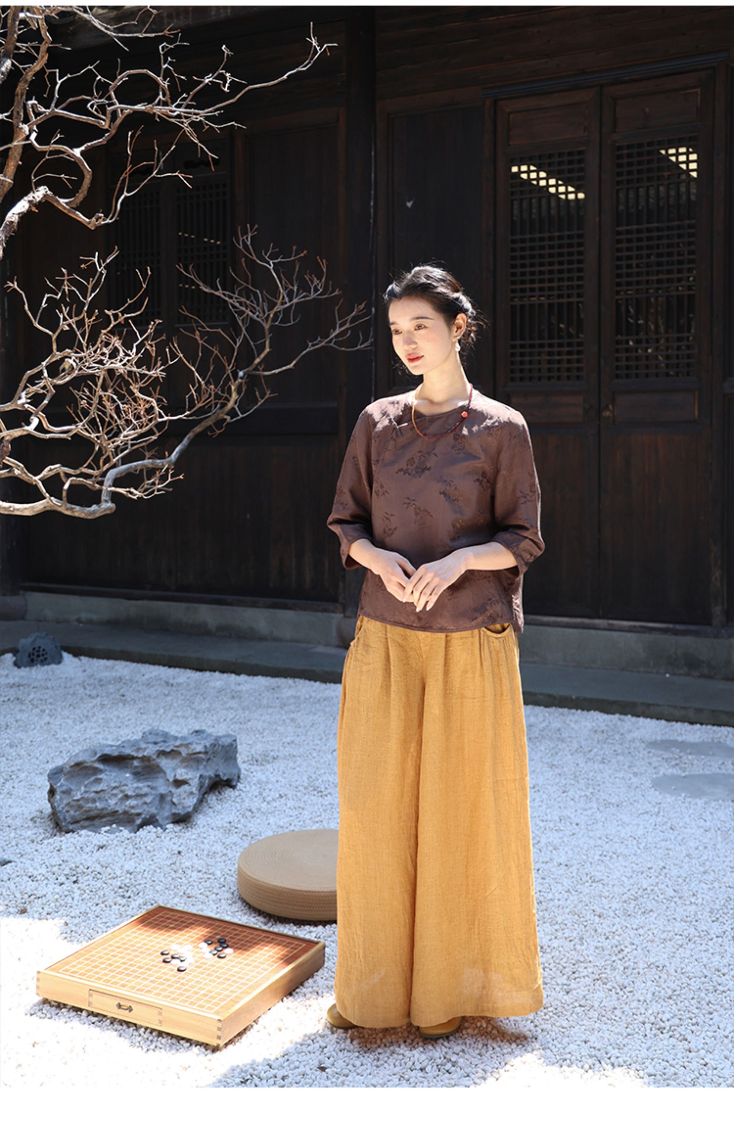 绽放旅行女装228朵/亚麻天丝提花新中式圆领斜襟连身七分袖衬衫女