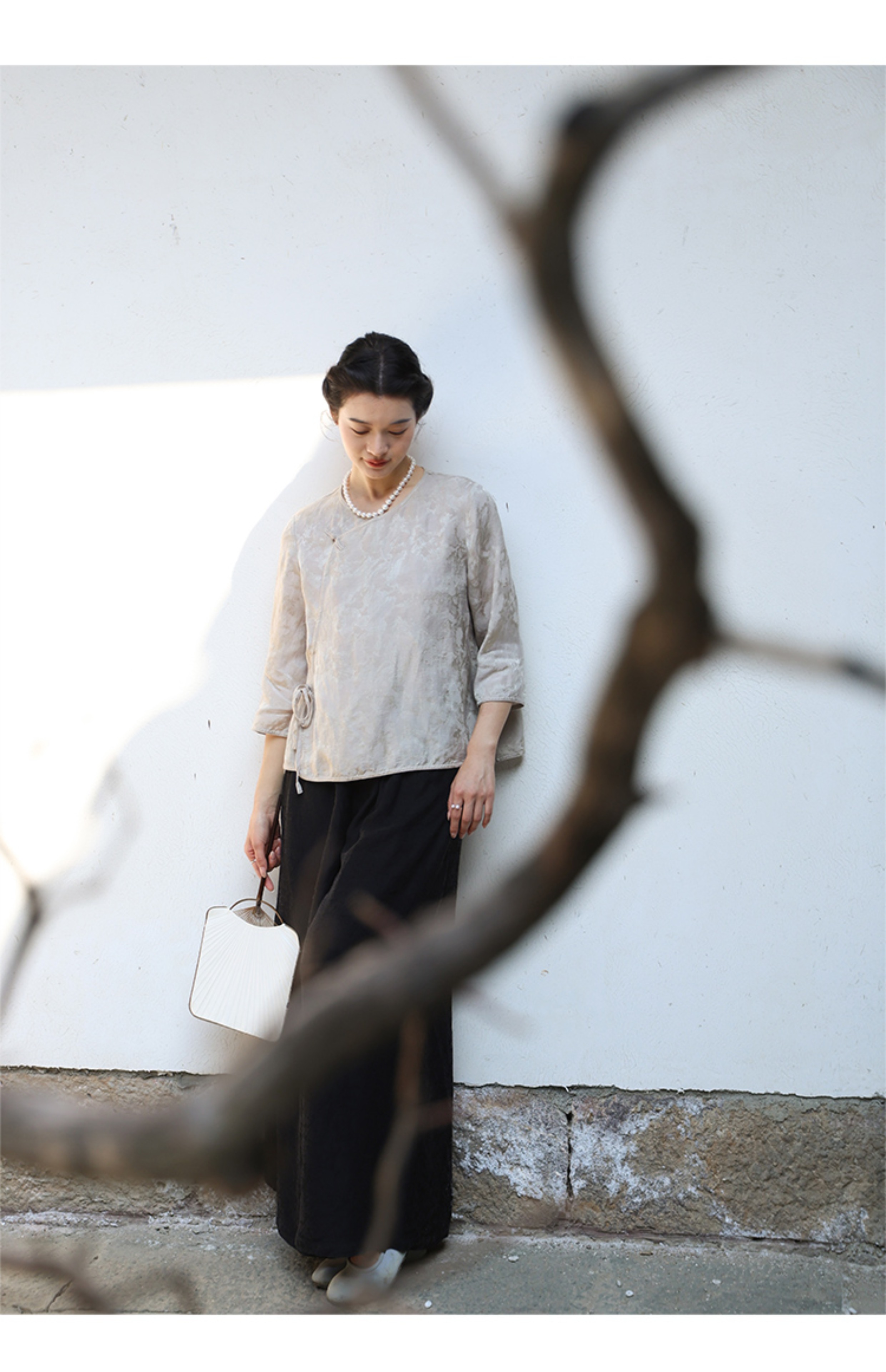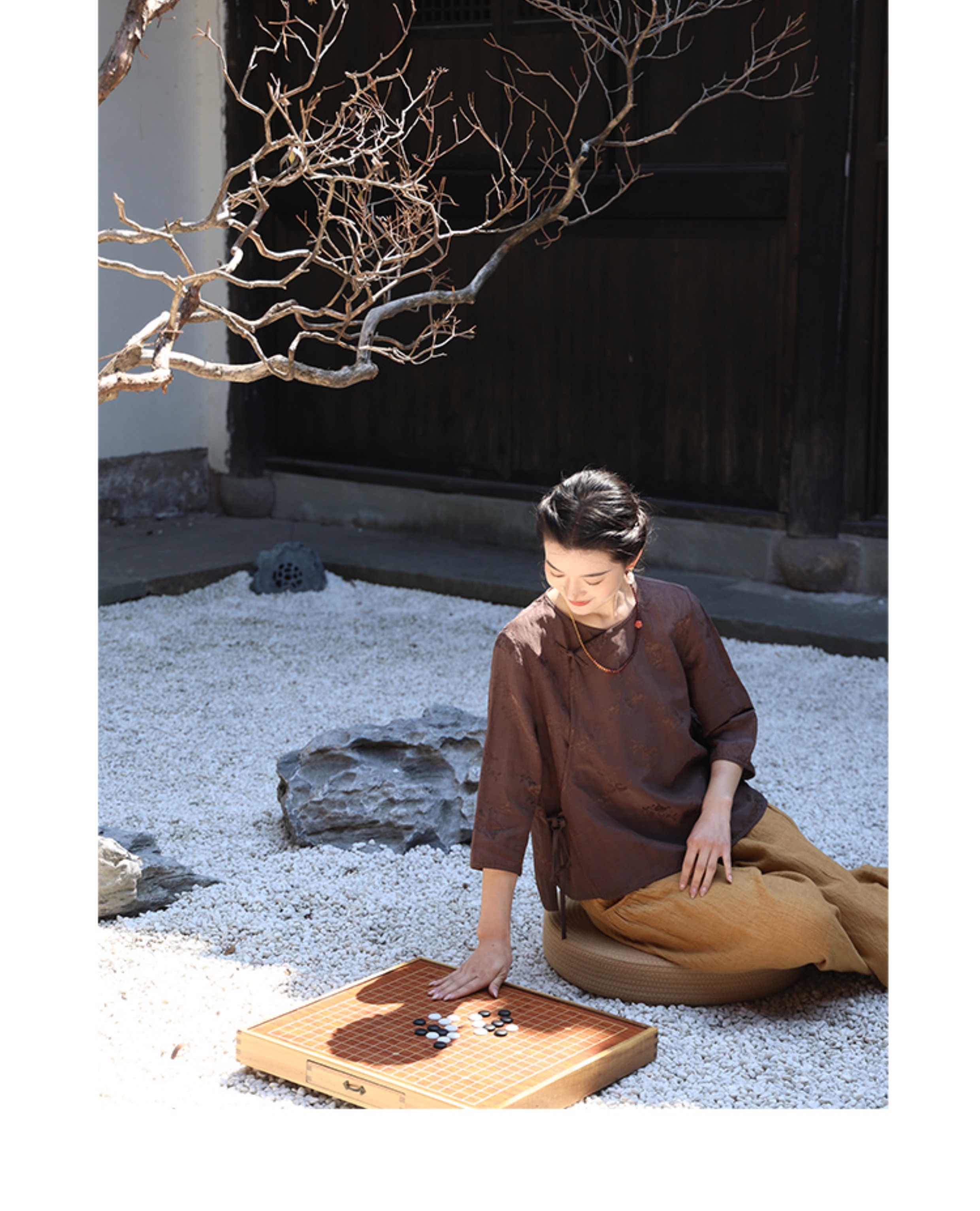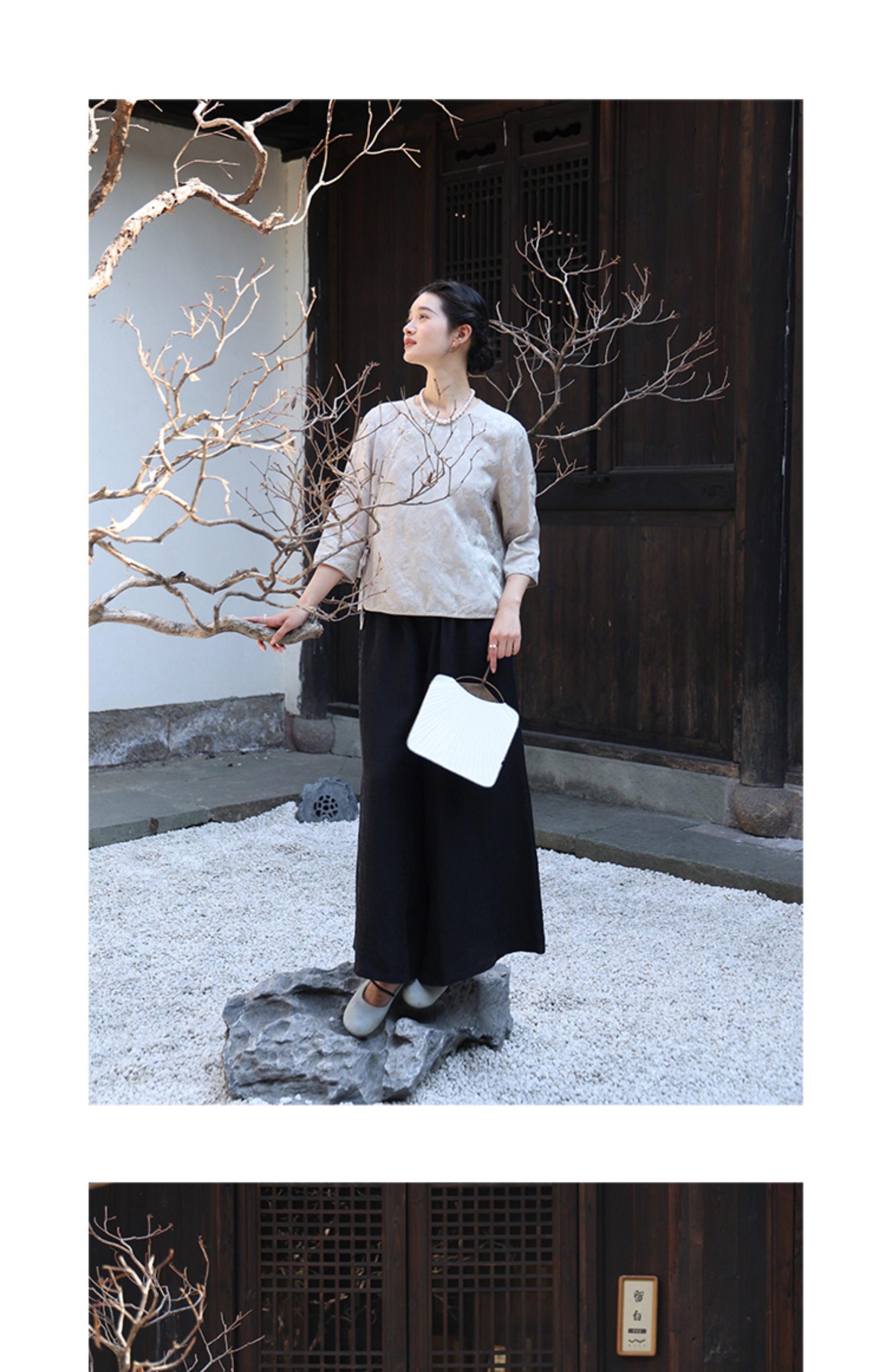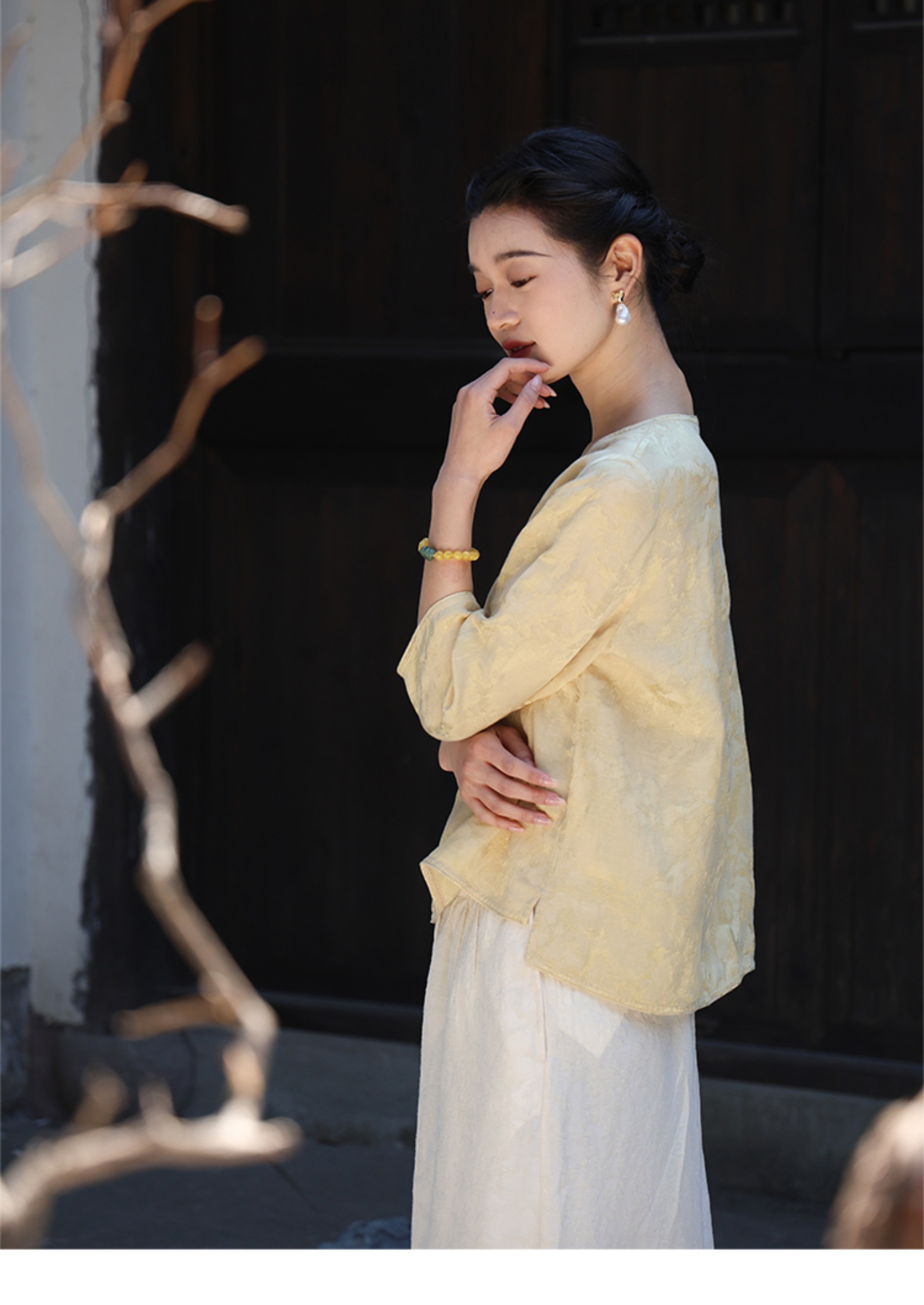 绽放旅行女装228朵/亚麻天丝提花新中式圆领斜襟连身七分袖衬衫女