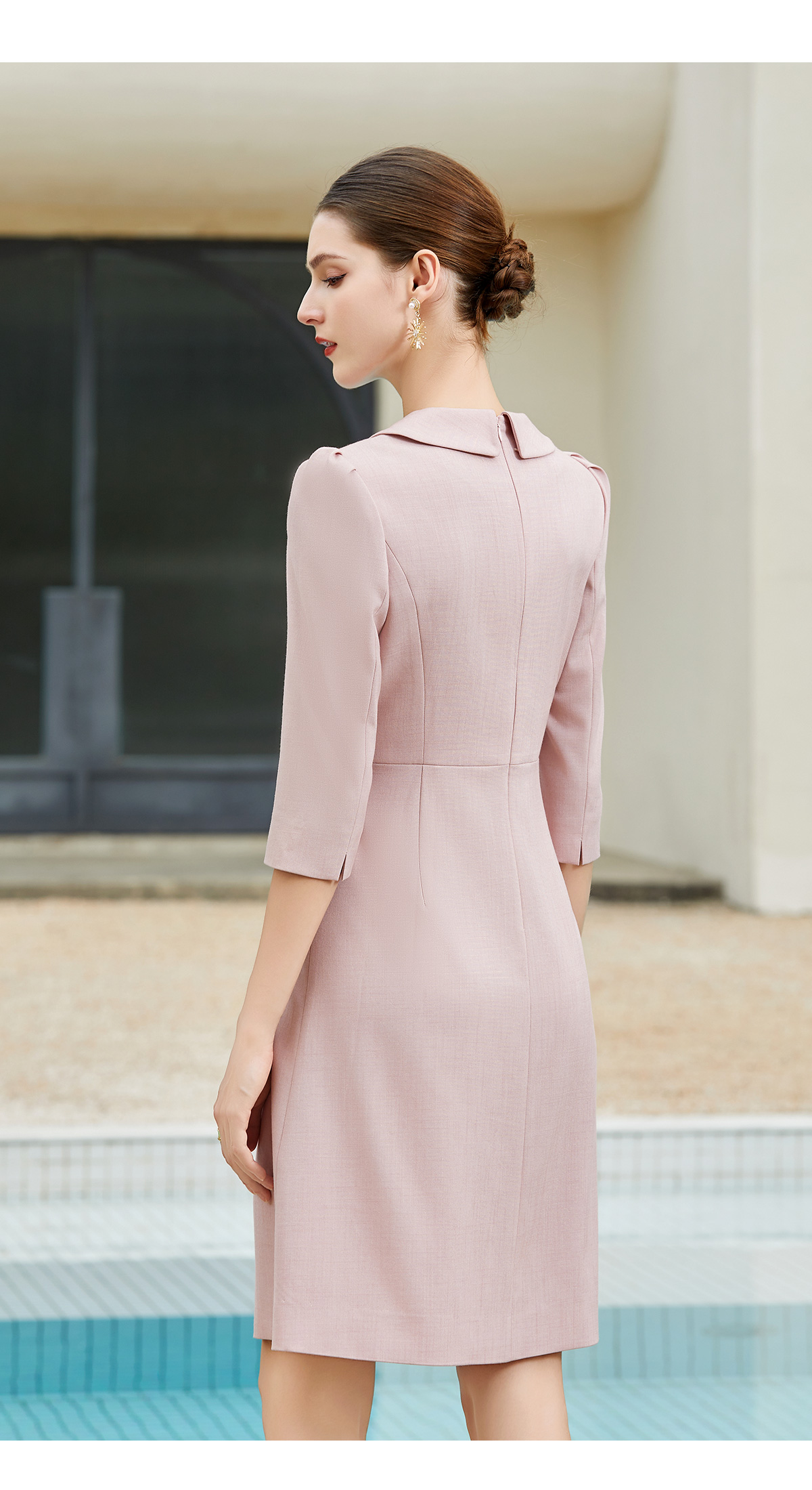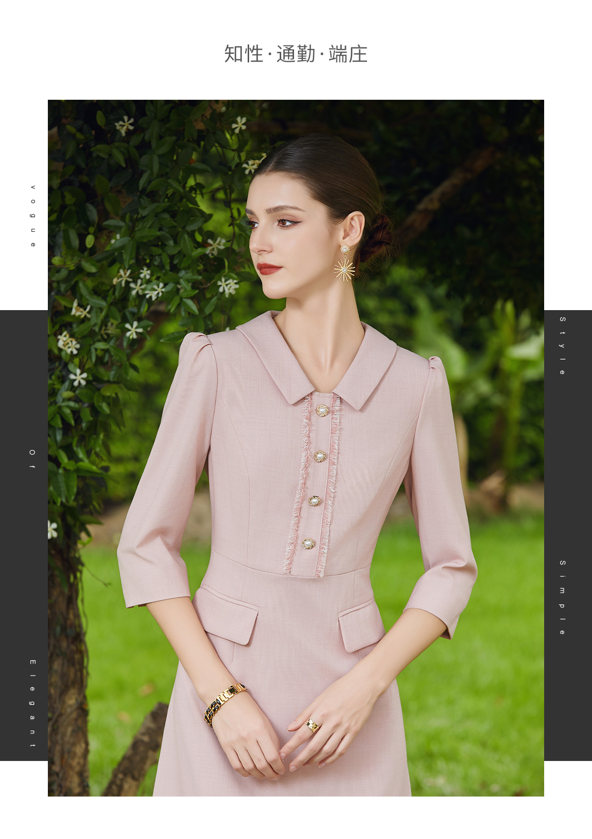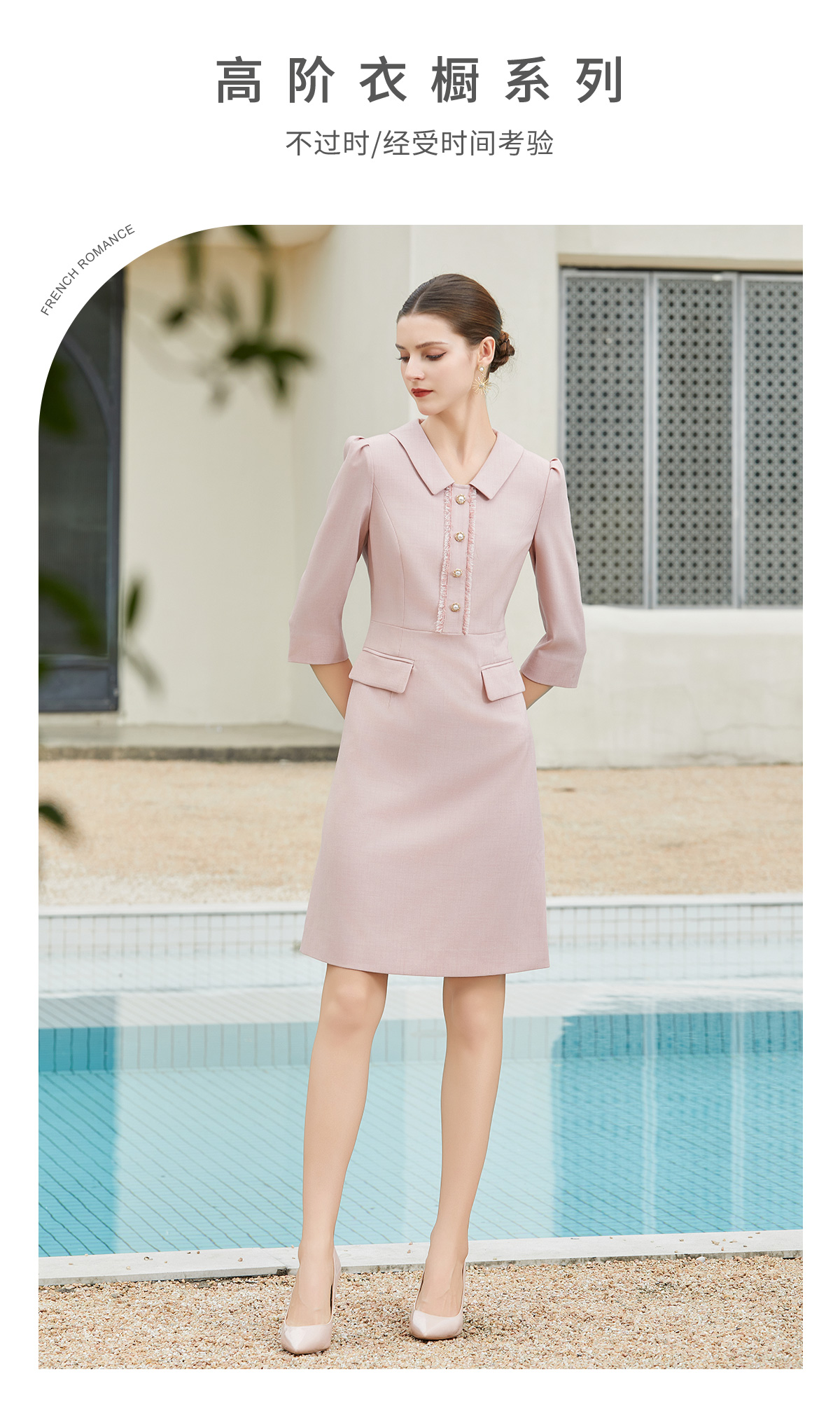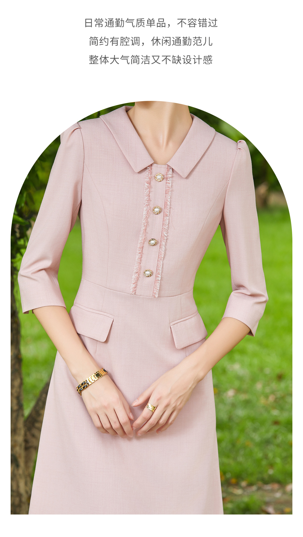 AD粉色小香风连衣裙女时尚翻领西服裙2024新款单排扣七分袖工作服