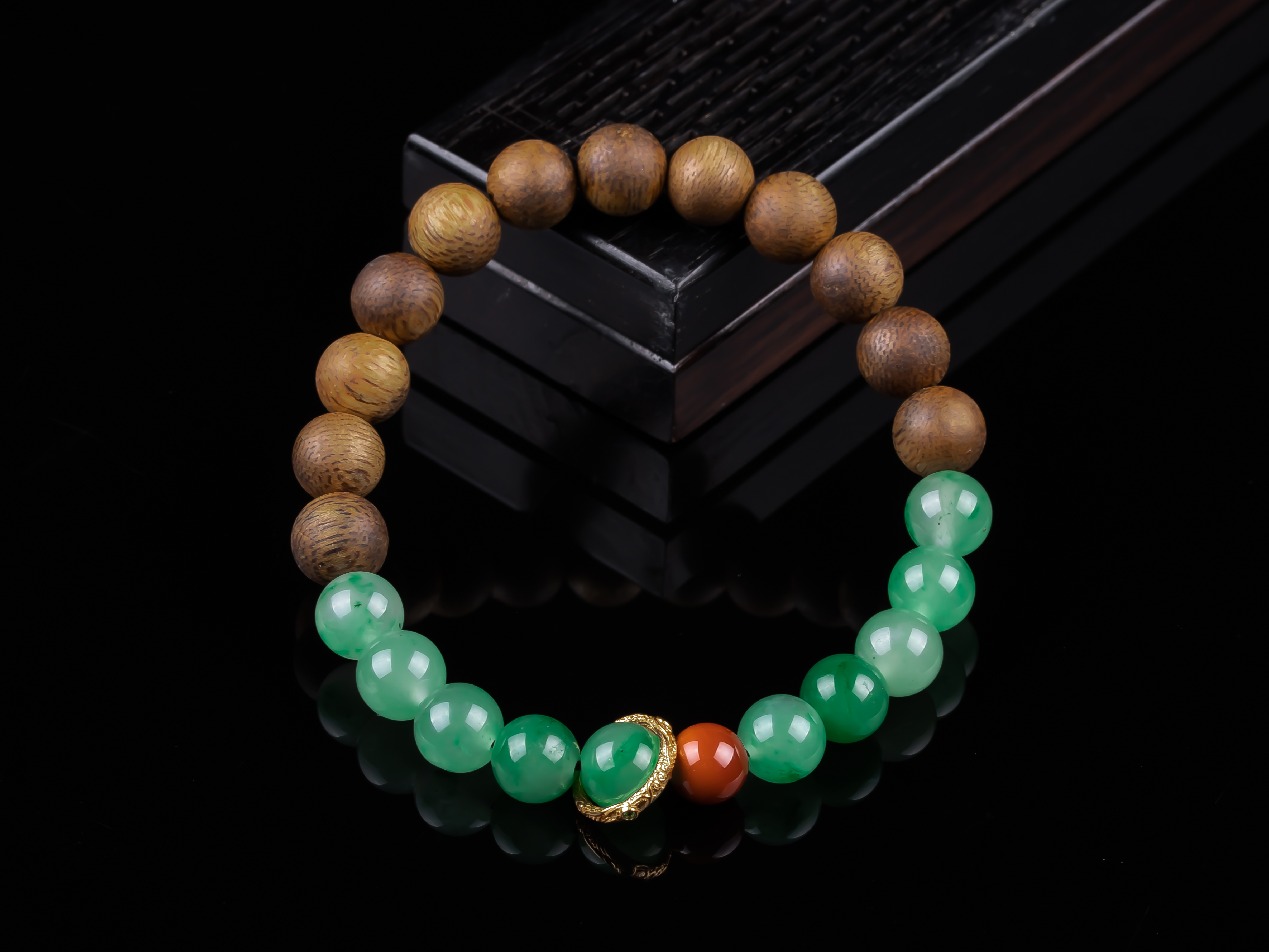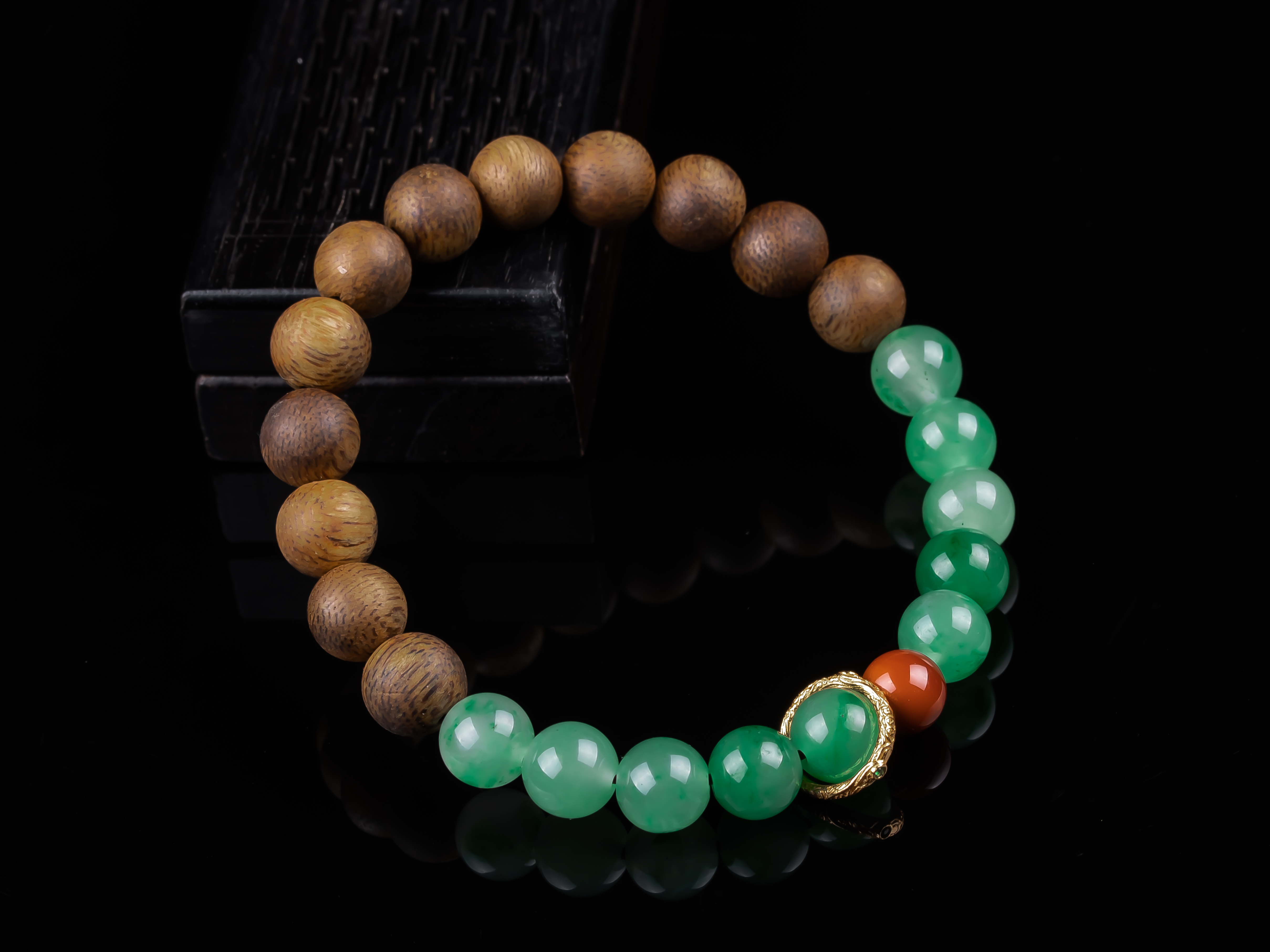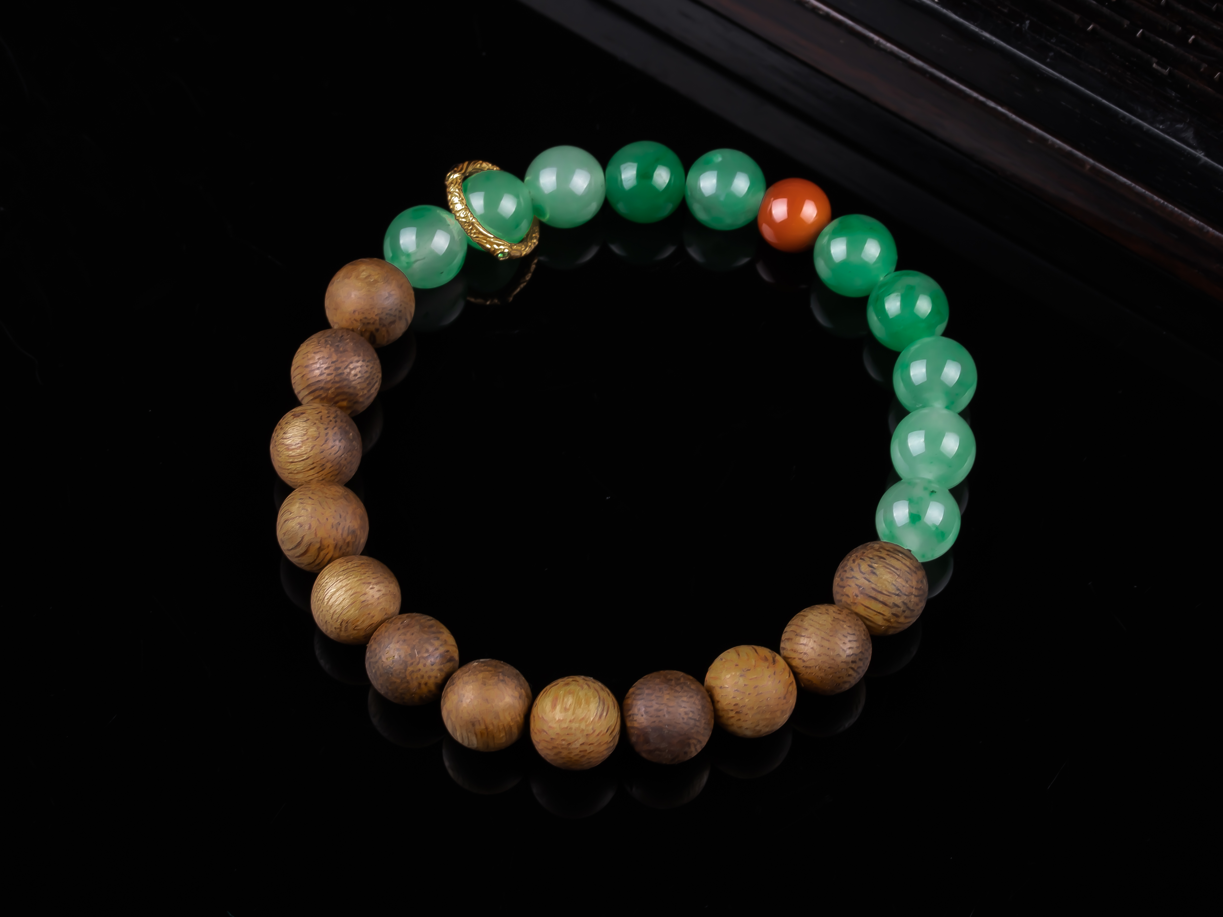 XY0302沉香+非洲翠南红银跑环手串,天然沉香约8.3mm,原色原味,香味自然清甜,一颗满色肉南红,鸿运当头,非洲翠冰飘花非常好看,上手很甜美。