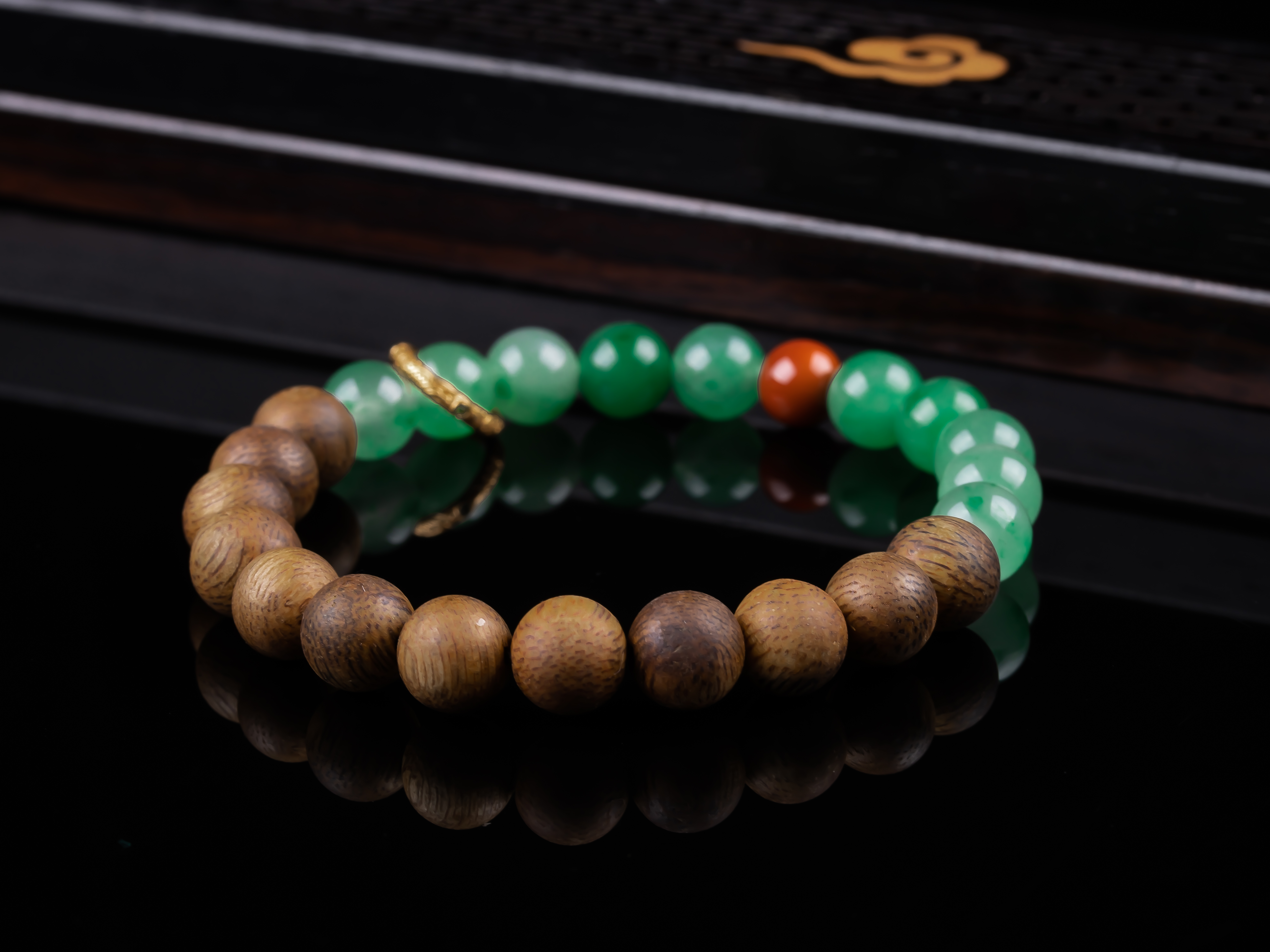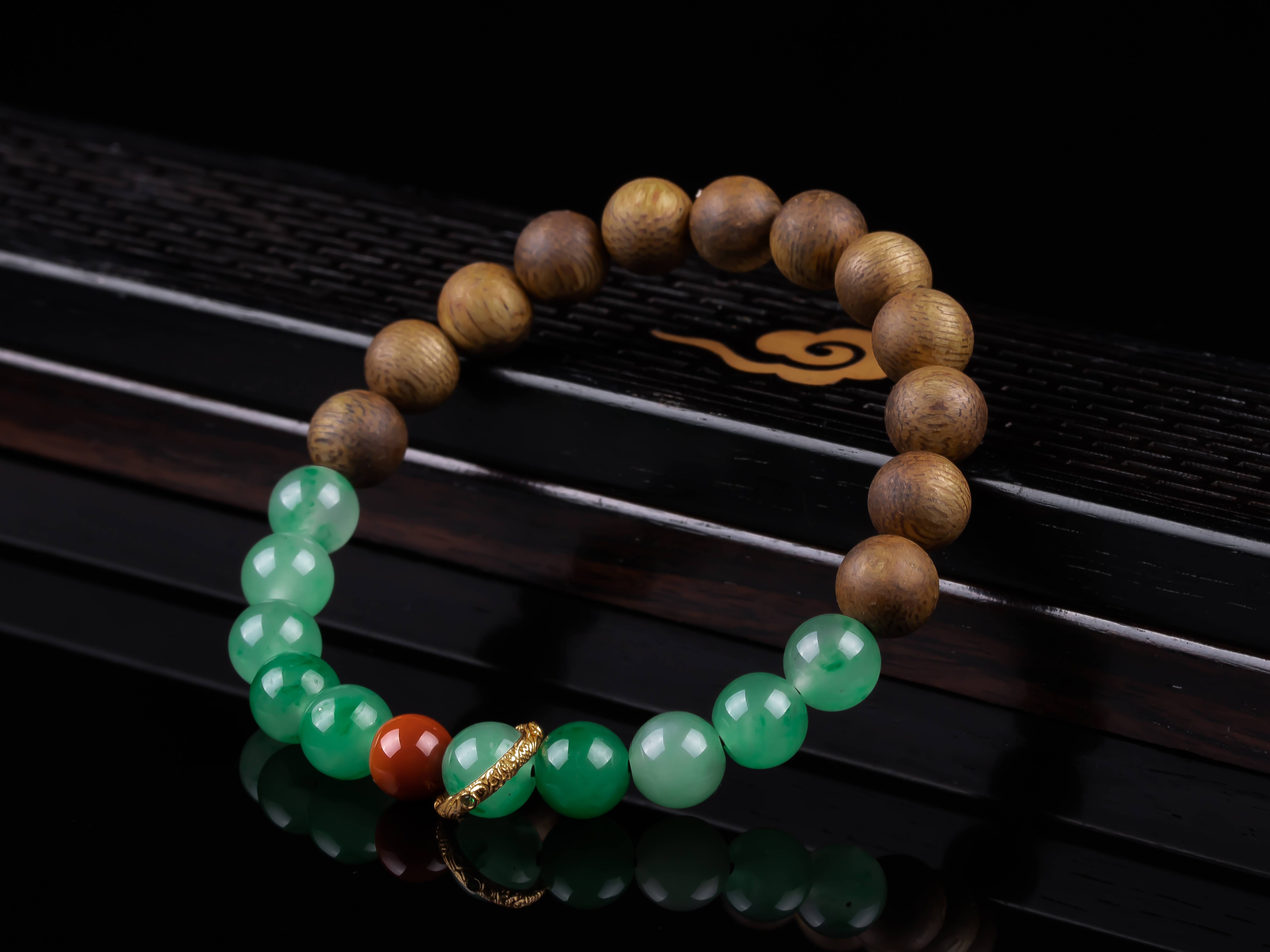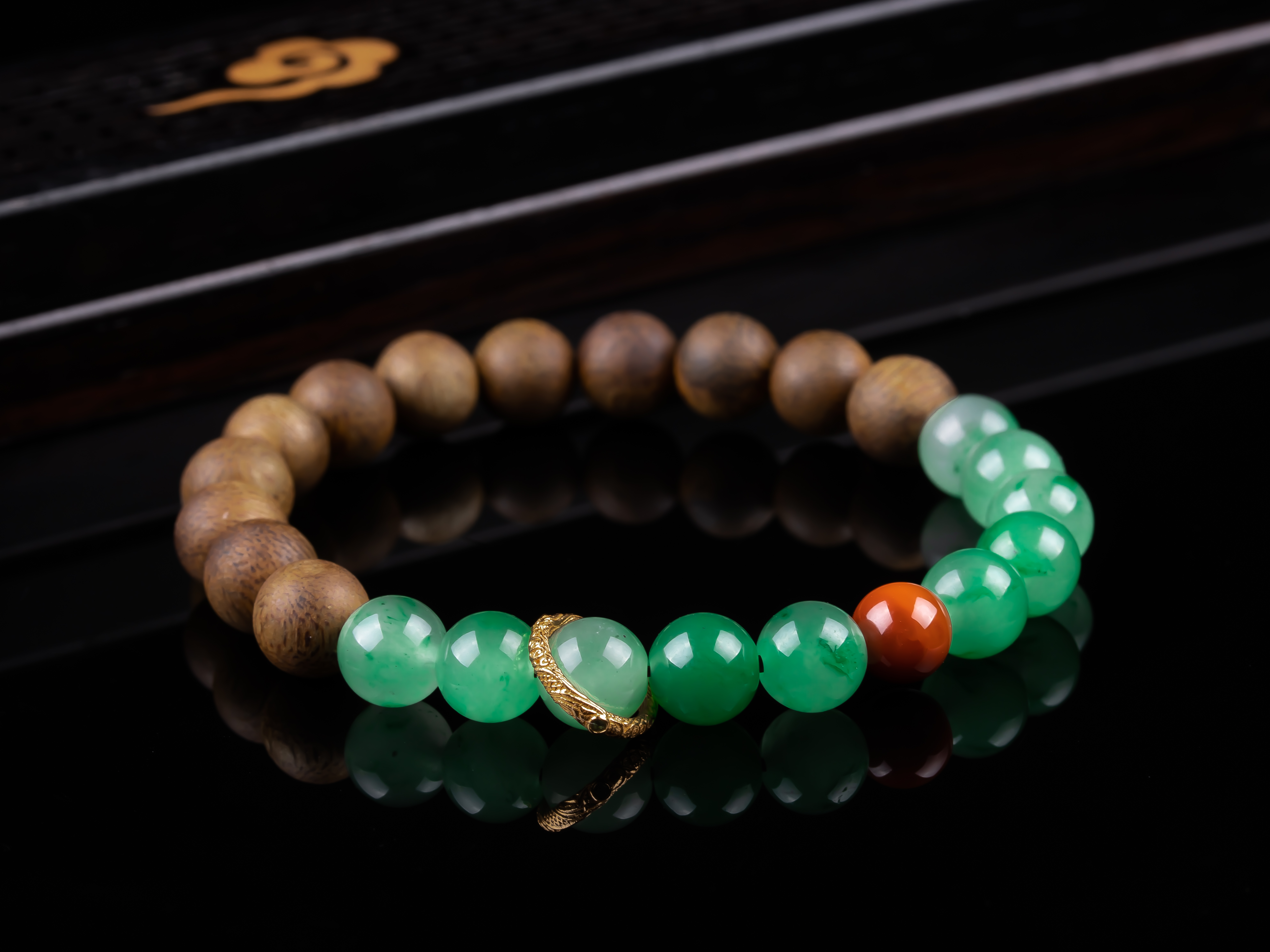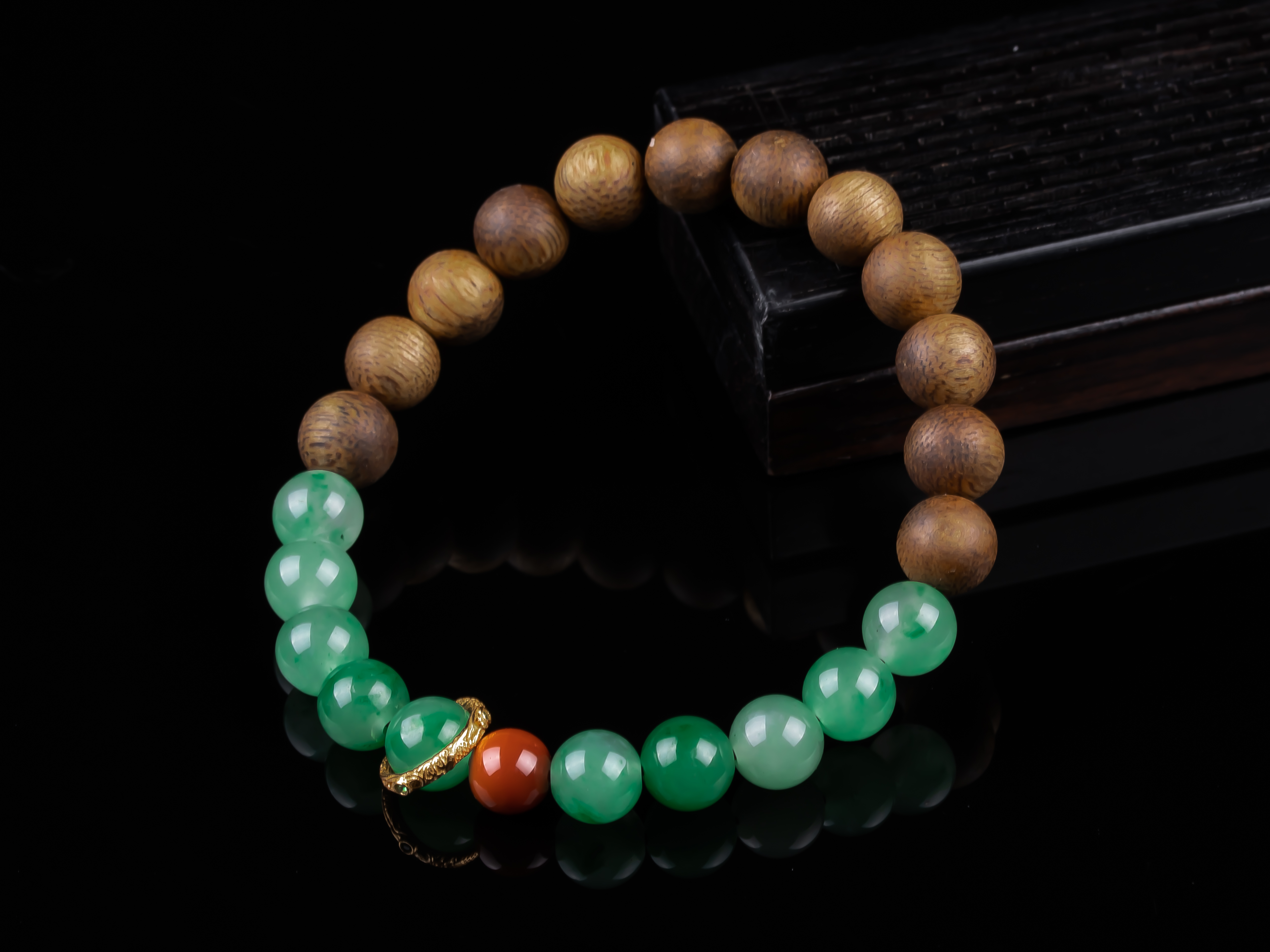 XY0302沉香+非洲翠南红银跑环手串,天然沉香约8.3mm,原色原味,香味自然清甜,一颗满色肉南红,鸿运当头,非洲翠冰飘花非常好看,上手很甜美。