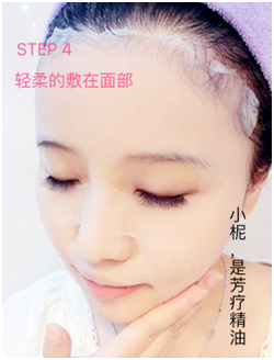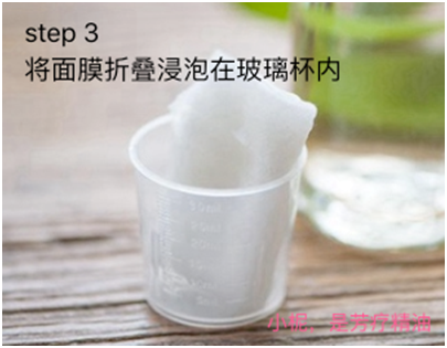 将面膜折叠一下,然后将其放入玻璃杯或者陶瓷类杯子内(由于含有精油,不可以用金属杯子),倒入刚好覆盖整个面膜的多一点的柔肤水,过5分钟。