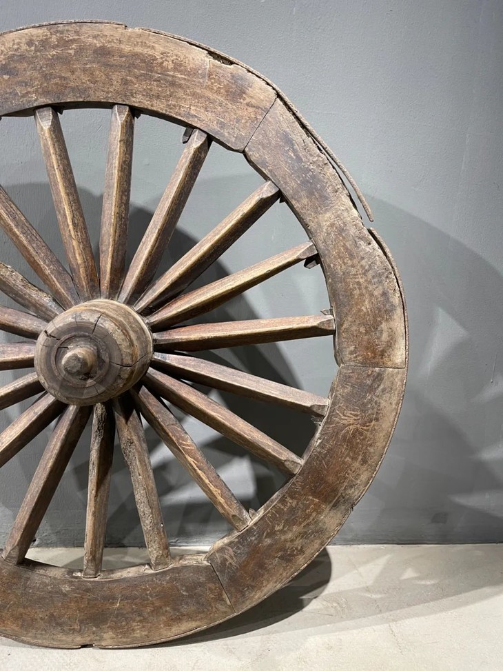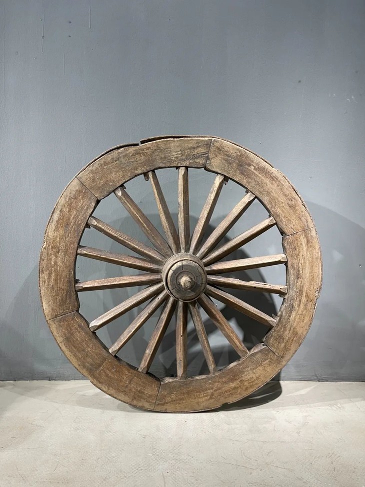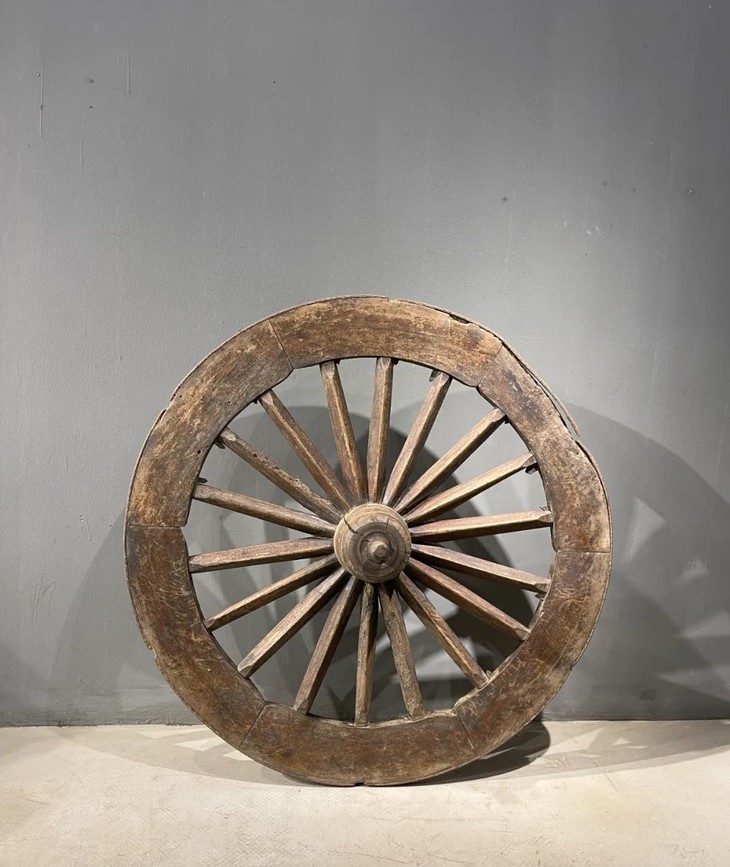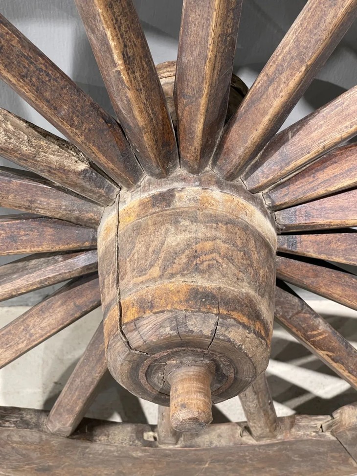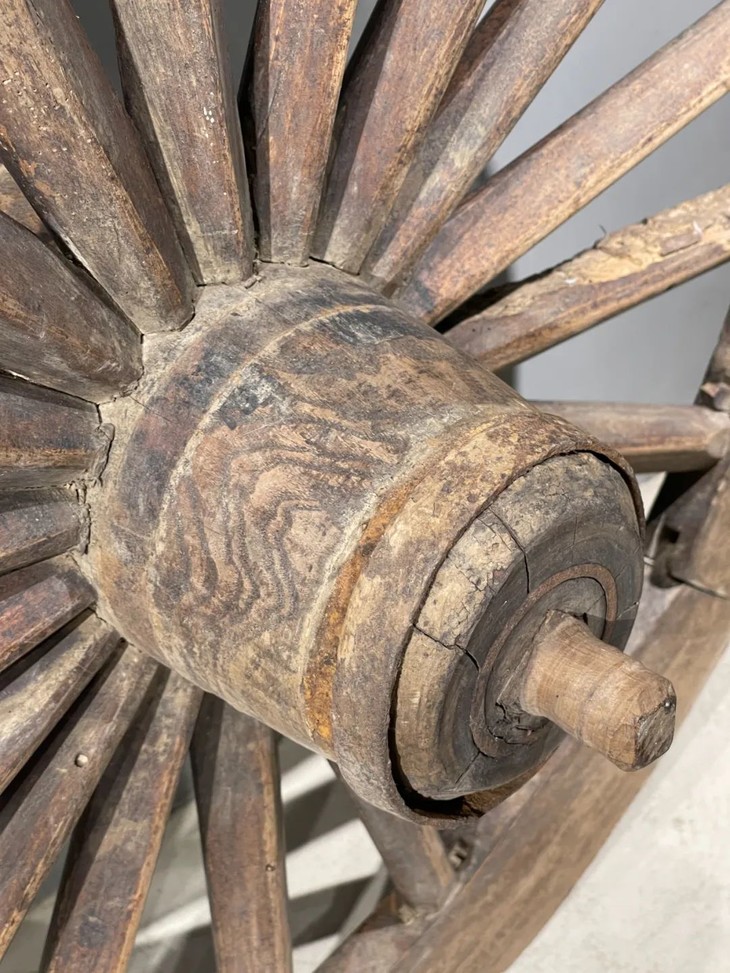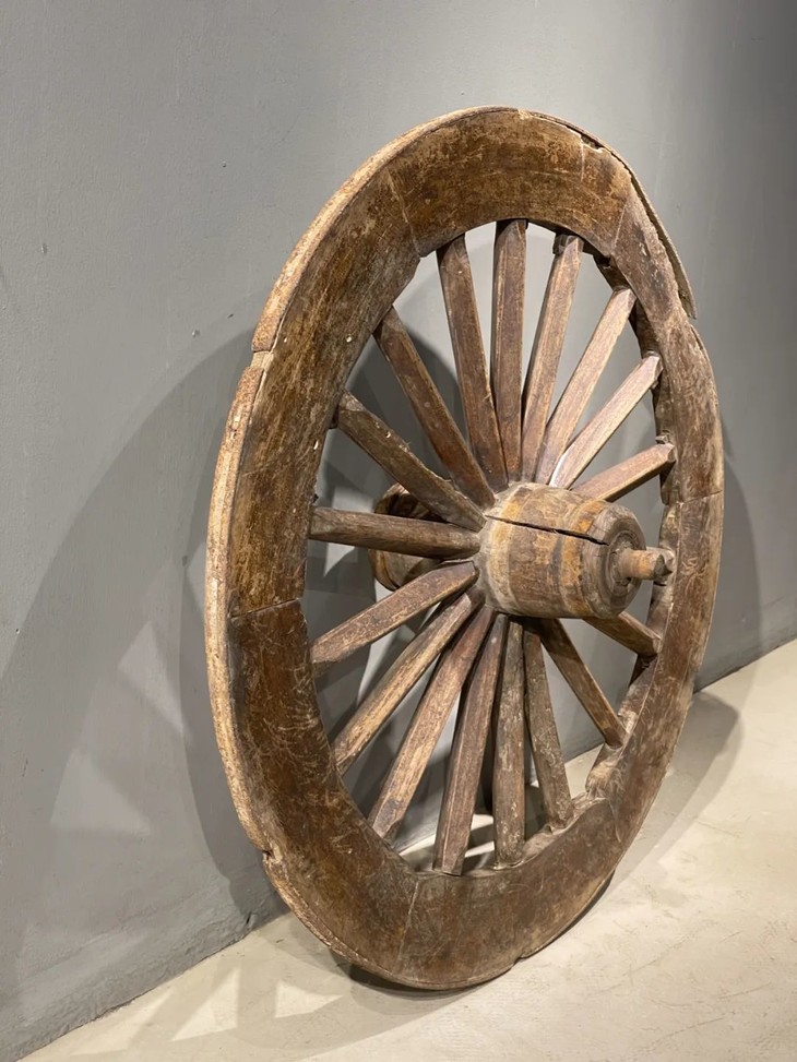 这是一件以比重大、质地坚硬的硬木制造组装而成的老车轮,此老式大车轮是马车或是牛车的车轮,经典机械设计,制作严谨、牢固实用,应是年代至少百年的老车轮。此硬木镶铁大车轮,见证古代交通工具的精巧设计与制作,历经长年使用仍然牢固可用,如今用於室内外空间陈设或是博物馆展示两相宜。如图所示,除表面使用痕迹外,此大车轮仍然坚固,尽显工业风格。直径:90厘米,内直径:约68厘米,两边轴总长:约38厘米,边宽:约2.5厘米,重量:12.3千克。