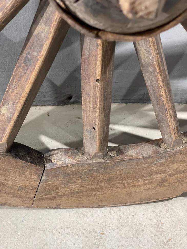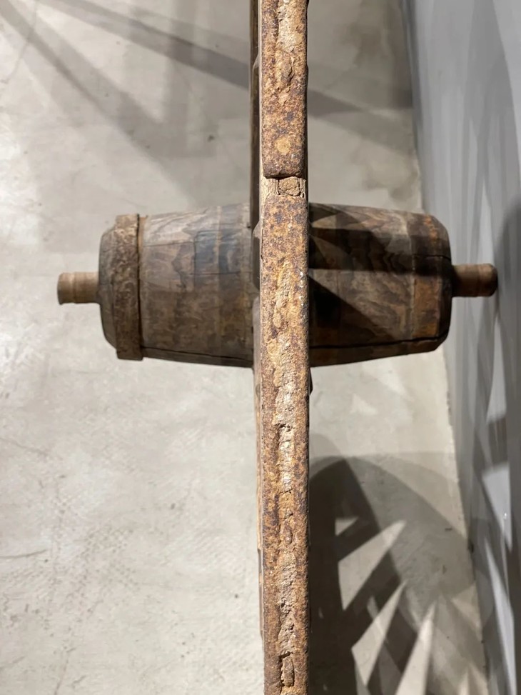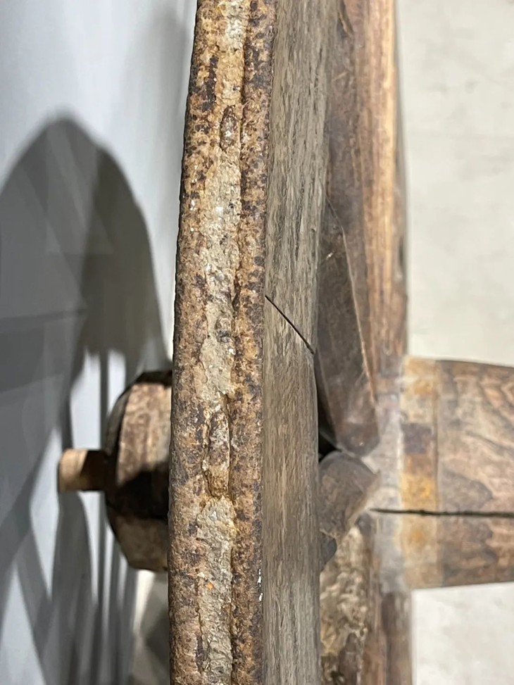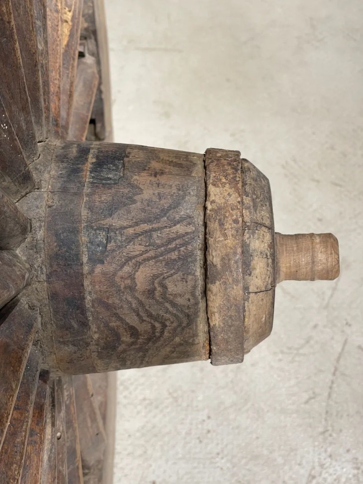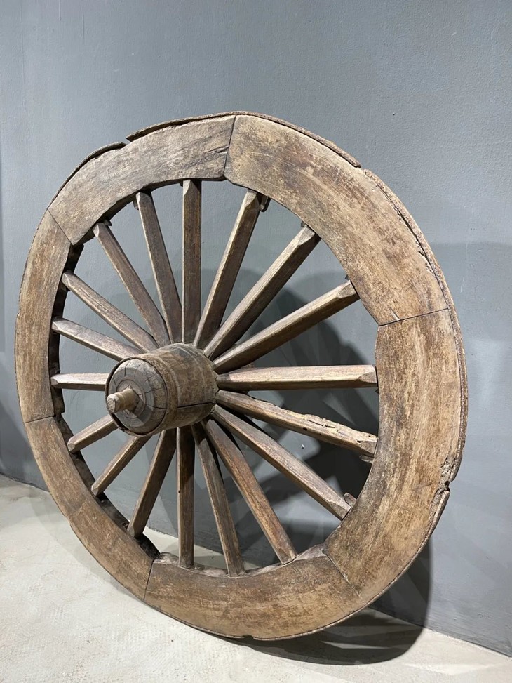 这是一件以比重大、质地坚硬的硬木制造组装而成的老车轮,此老式大车轮是马车或是牛车的车轮,经典机械设计,制作严谨、牢固实用,应是年代至少百年的老车轮。此硬木镶铁大车轮,见证古代交通工具的精巧设计与制作,历经长年使用仍然牢固可用,如今用於室内外空间陈设或是博物馆展示两相宜。如图所示,除表面使用痕迹外,此大车轮仍然坚固,尽显工业风格。直径:90厘米,内直径:约68厘米,两边轴总长:约38厘米,边宽:约2.5厘米,重量:12.3千克。