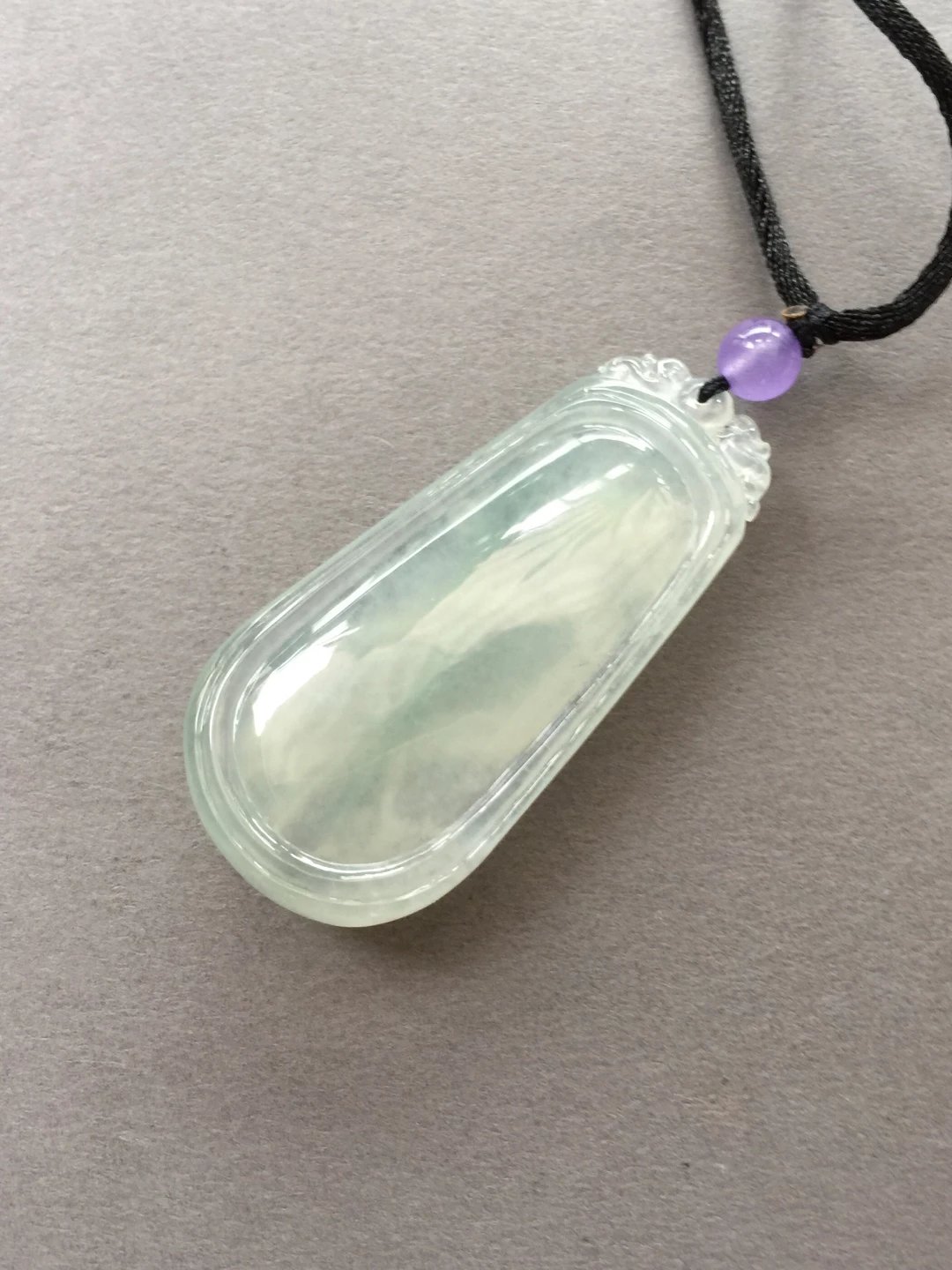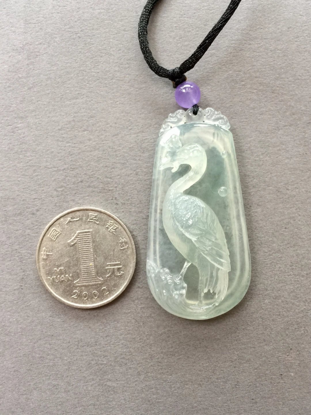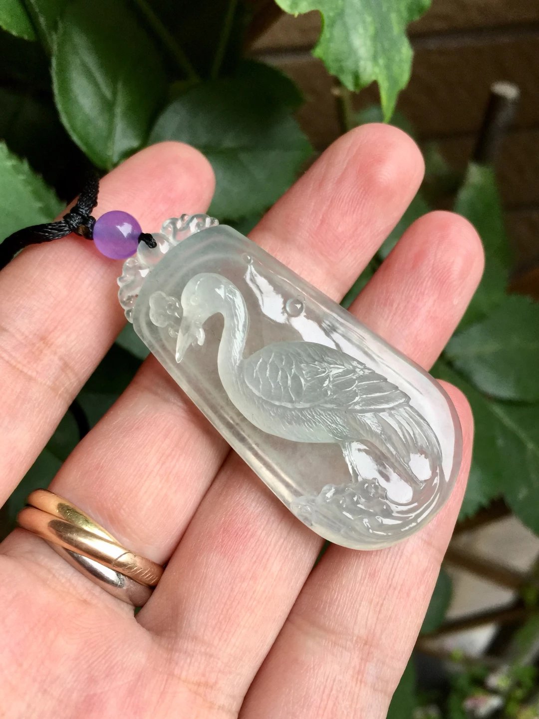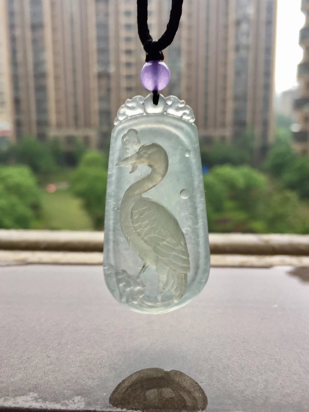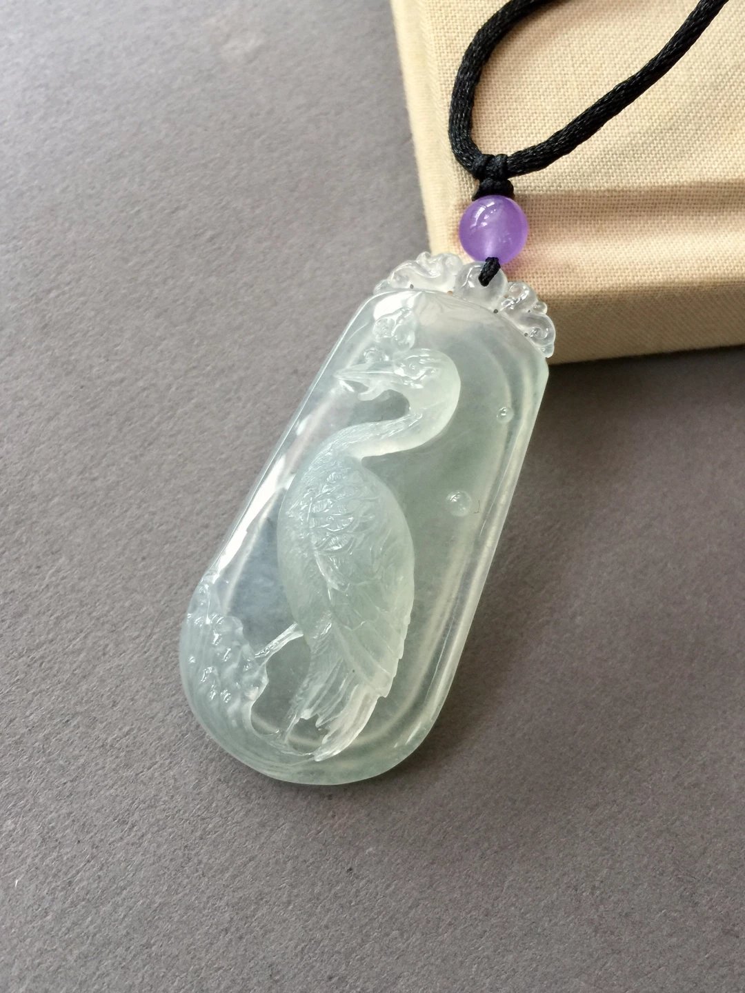 翡翠冰种鹤献如意,51.3×25.3×10.2mm,长度过50,厚度过10,非常难得,图片无法展现实物的美,晶莹剔透的种水。荧光四射。手工雕刻栩栩如生,每个细节都是风景,佩戴上身富贵大方,鹤献如意,长寿寓意,这么大件的东西,按照现在行情在四万以上了,看看我们的价格是不是惊叹,还是按以前的价,不涨价,特划算
