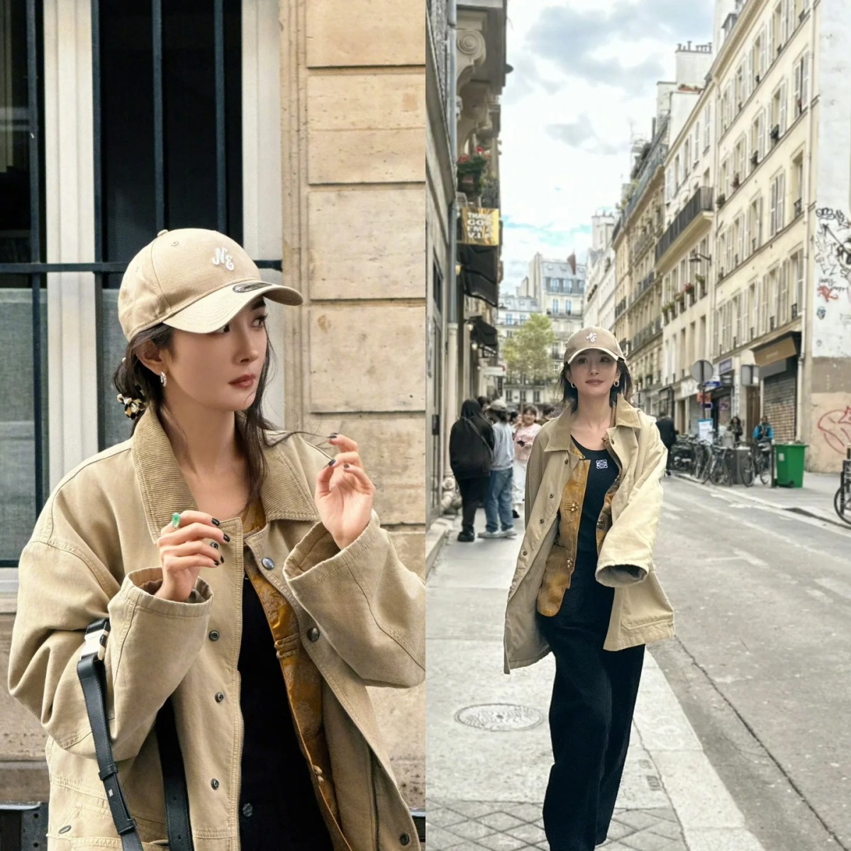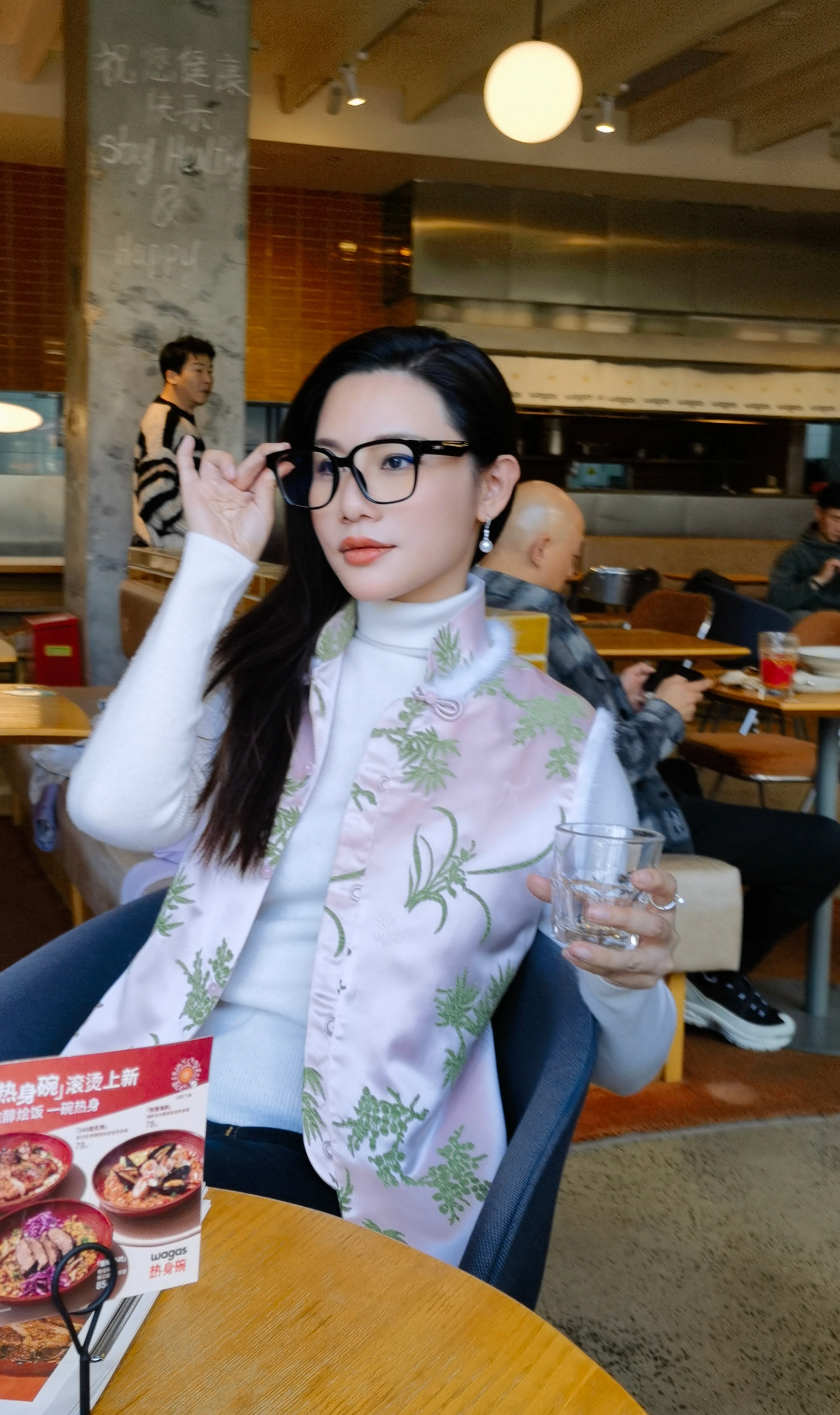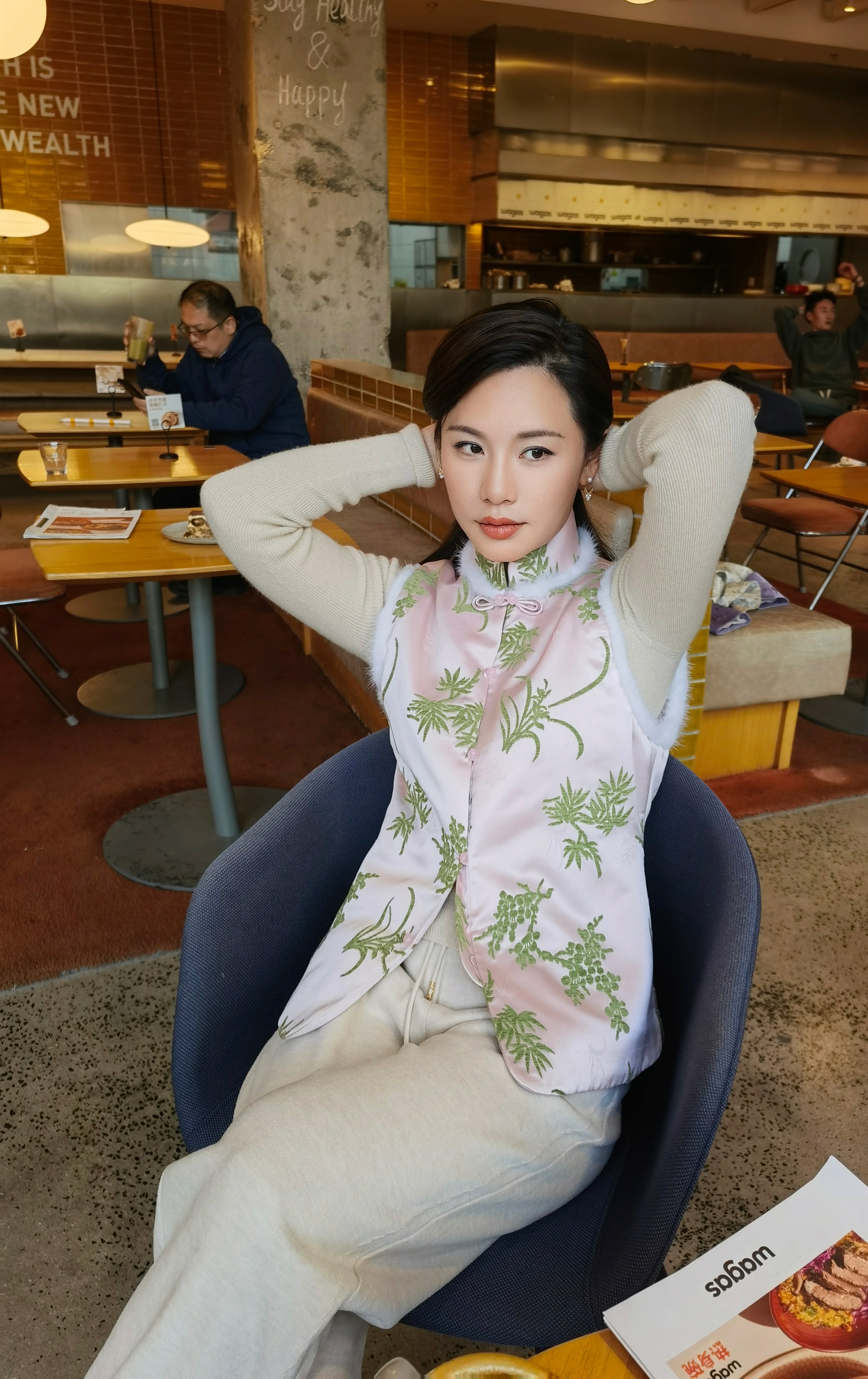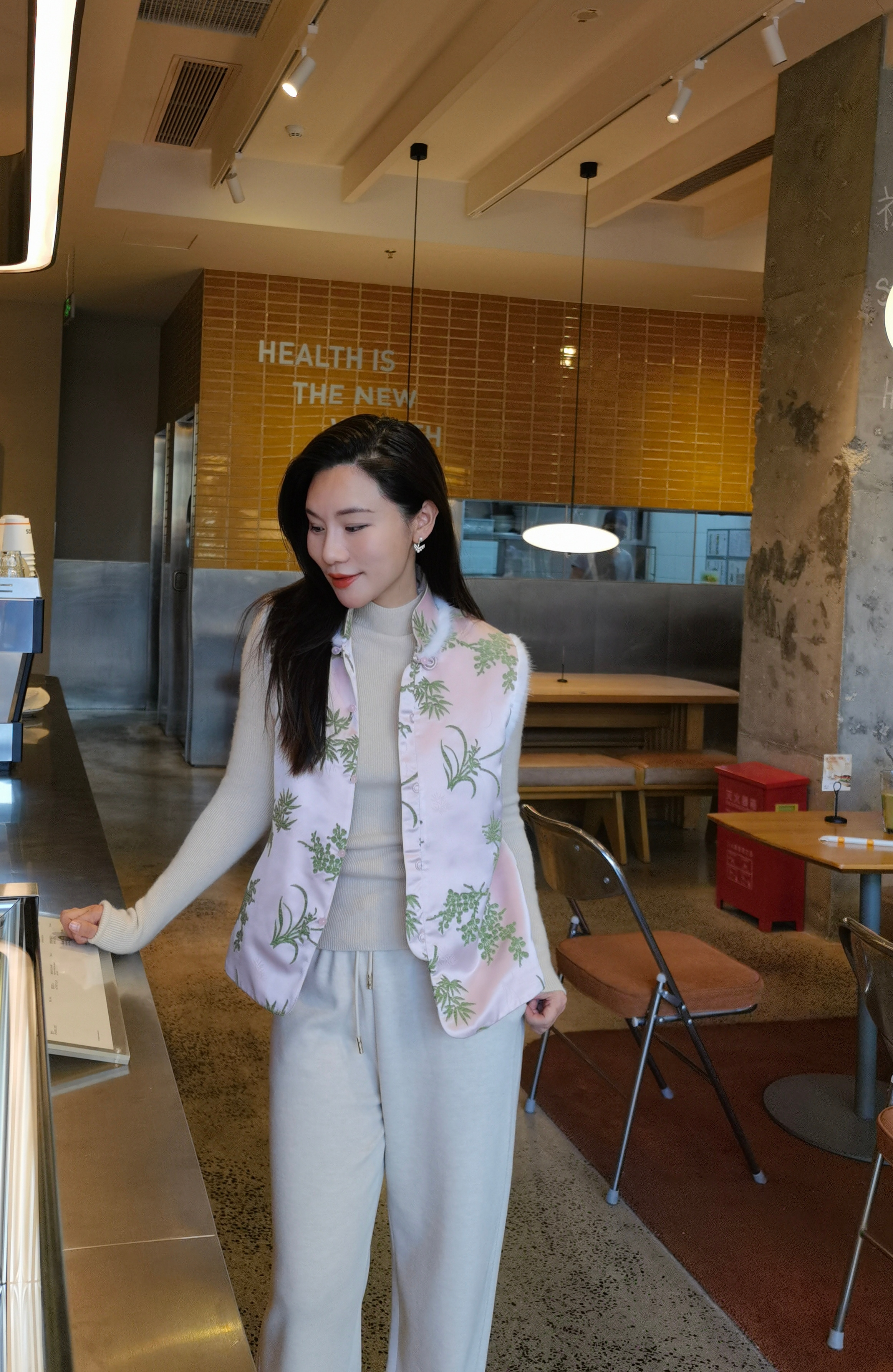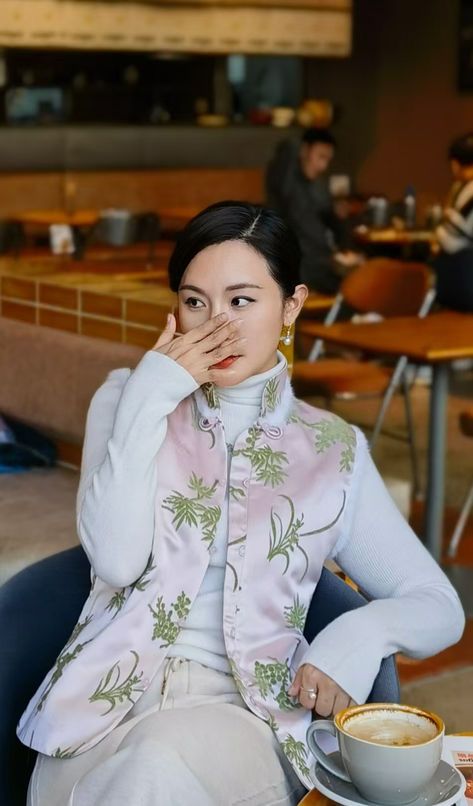 杨幂就把新中式马甲叠穿在工装夹克里面,也特别好看,她真的很爱新中式,也是真的在不遗余力地宣传新中式服饰。