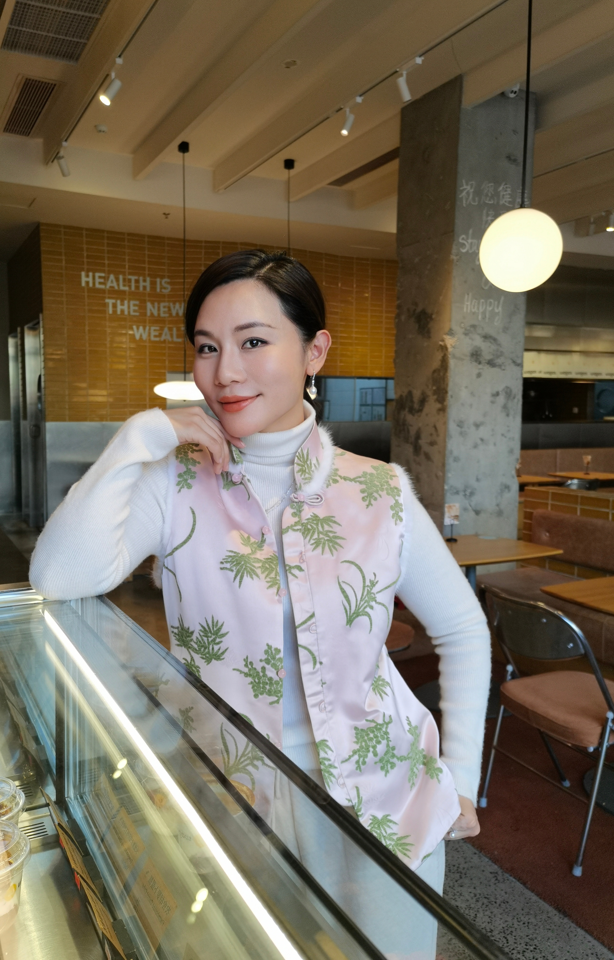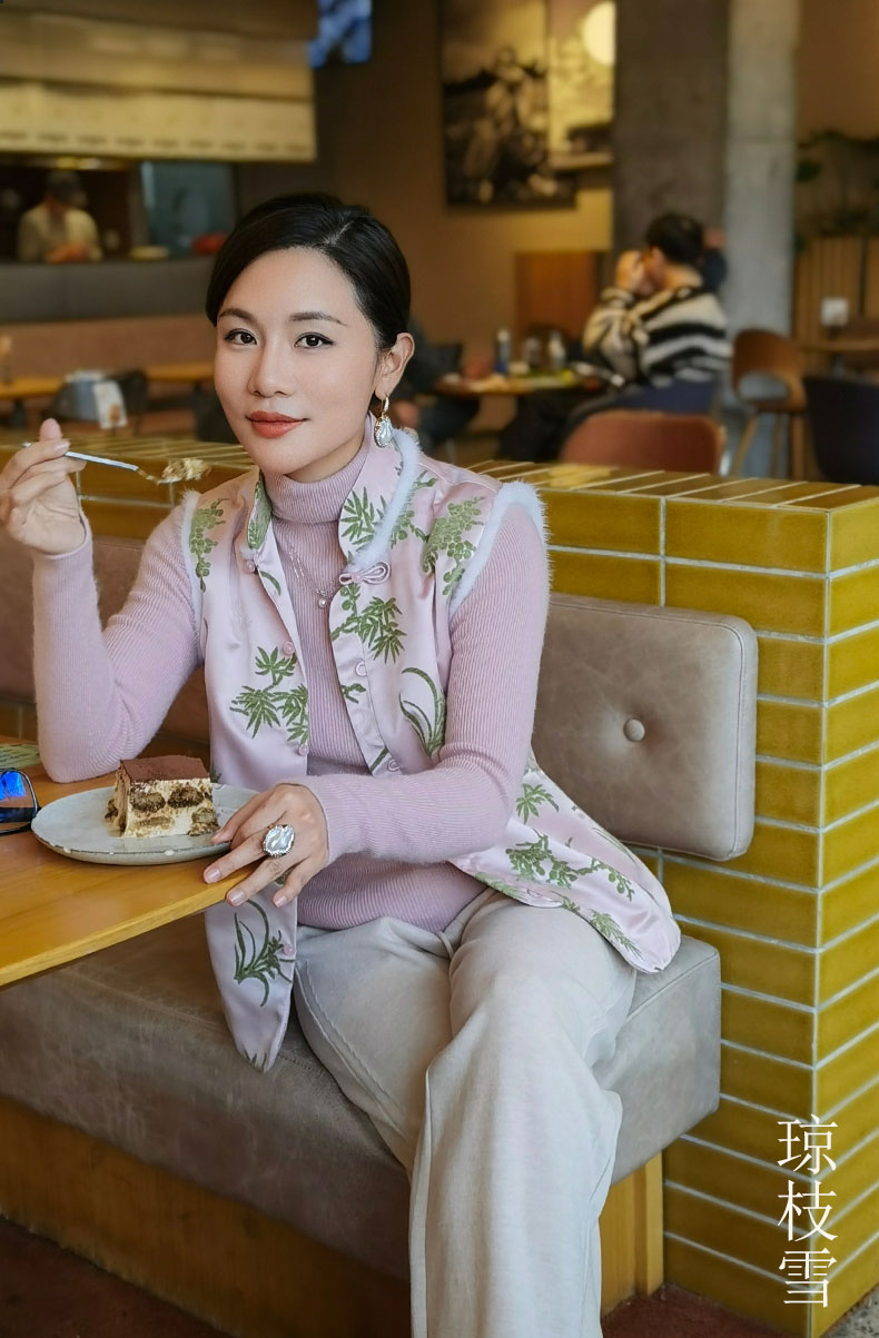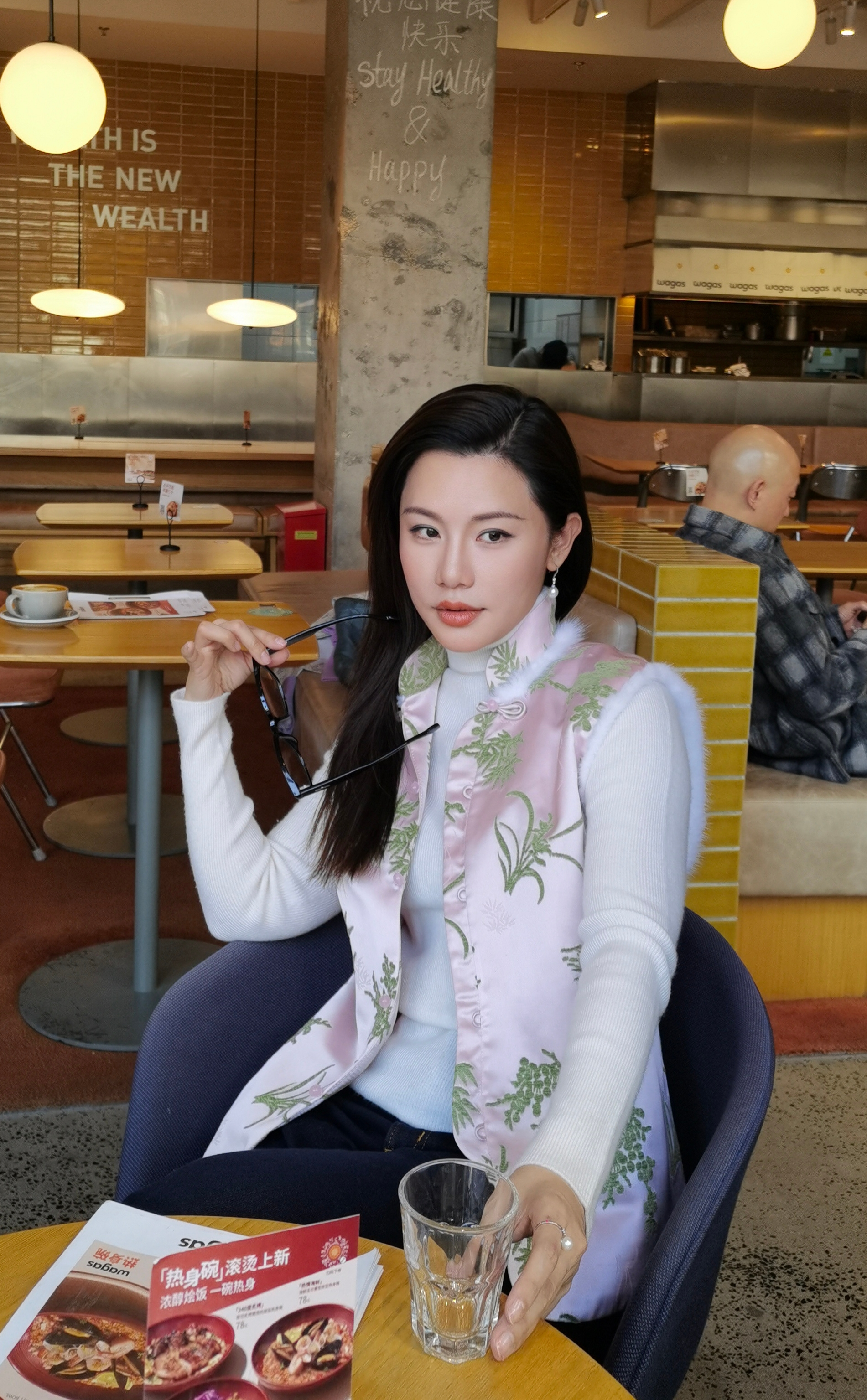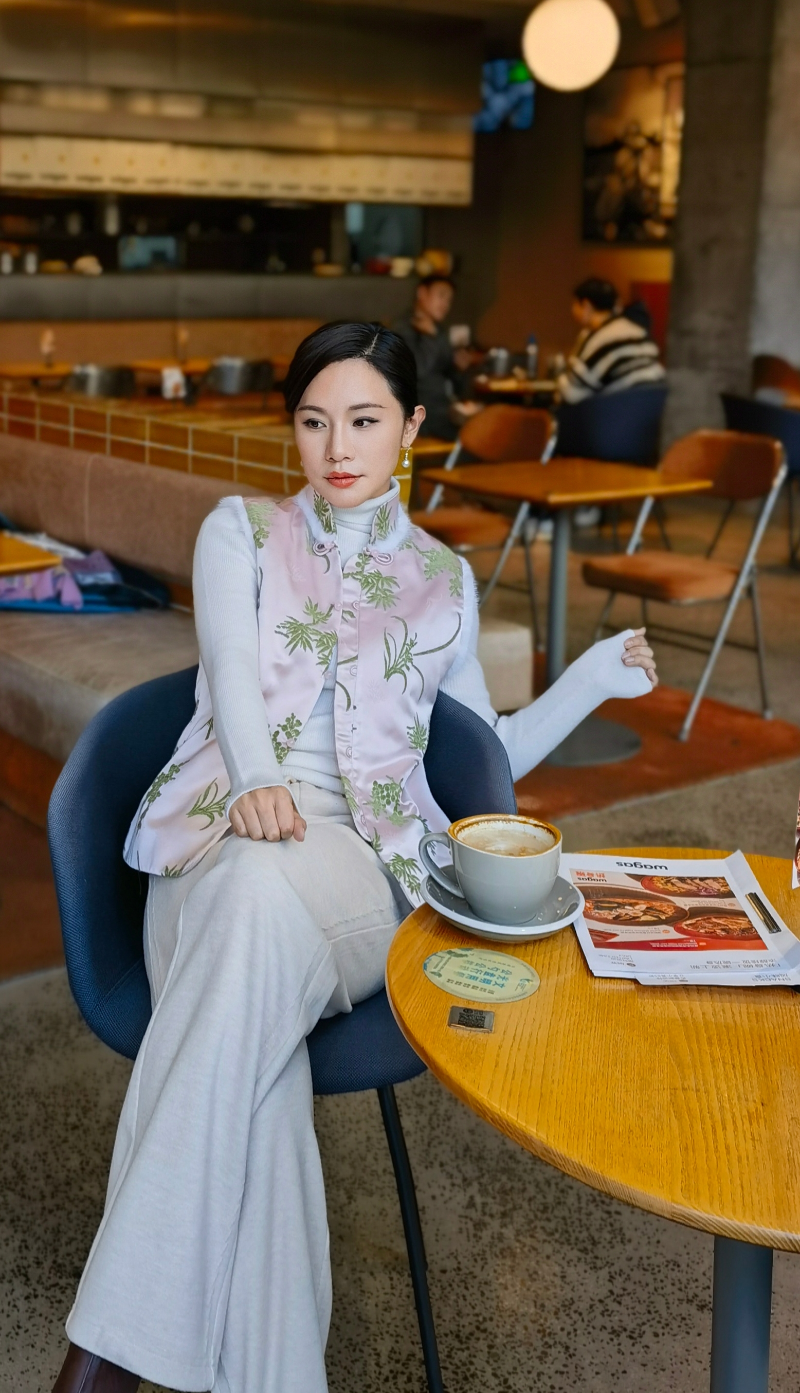 杨幂就把新中式马甲叠穿在工装夹克里面,也特别好看,她真的很爱新中式,也是真的在不遗余力地宣传新中式服饰。
