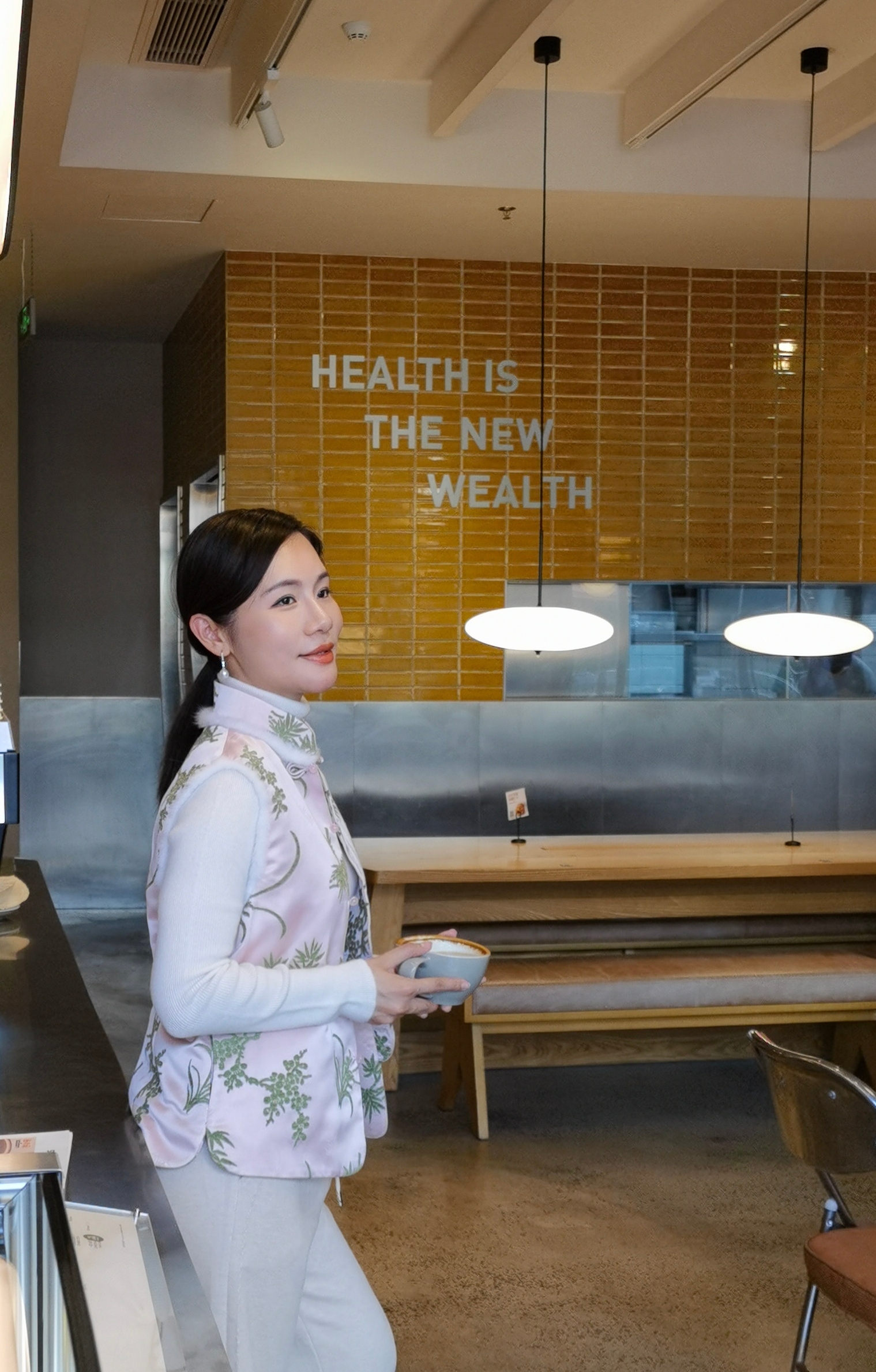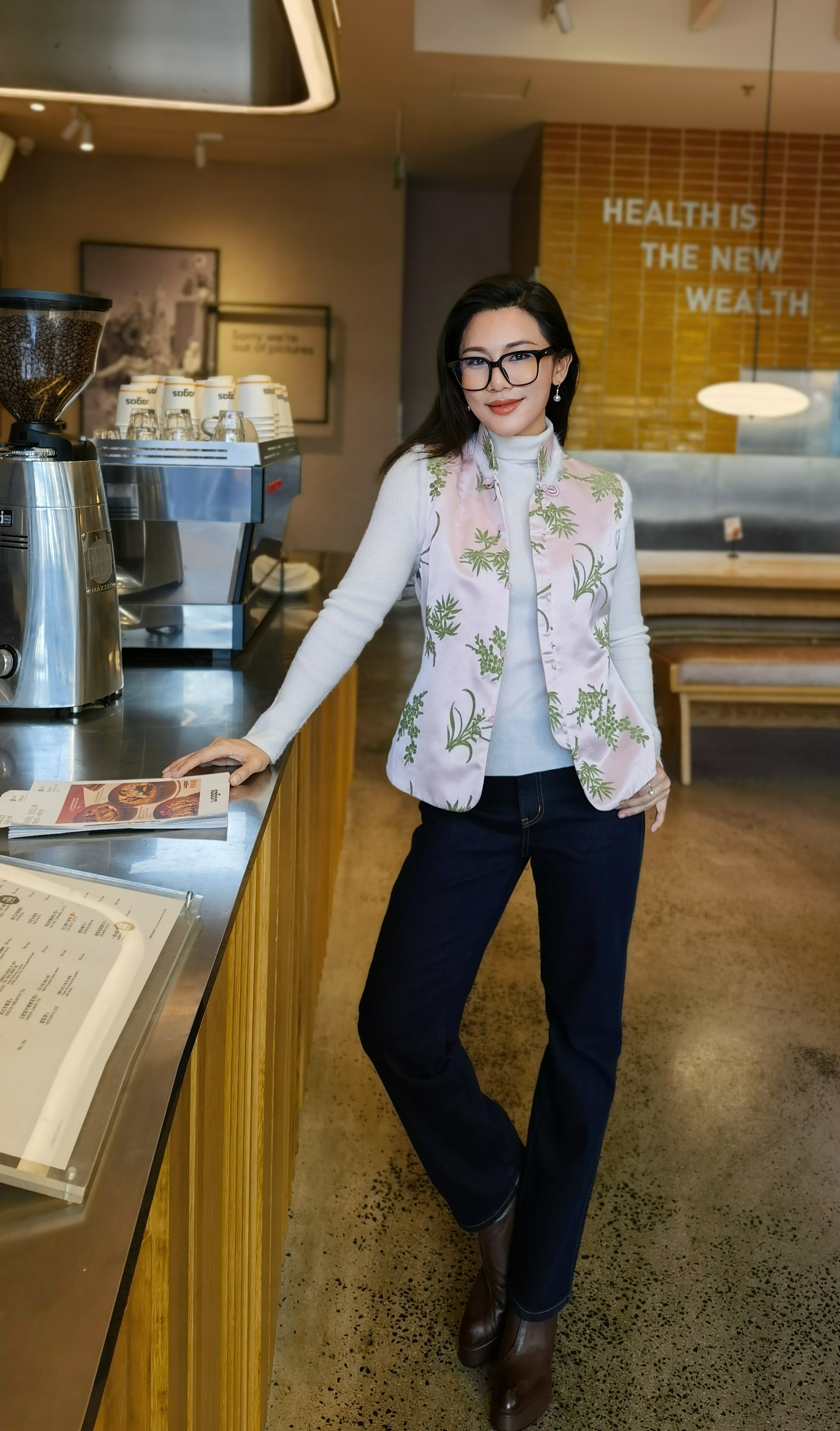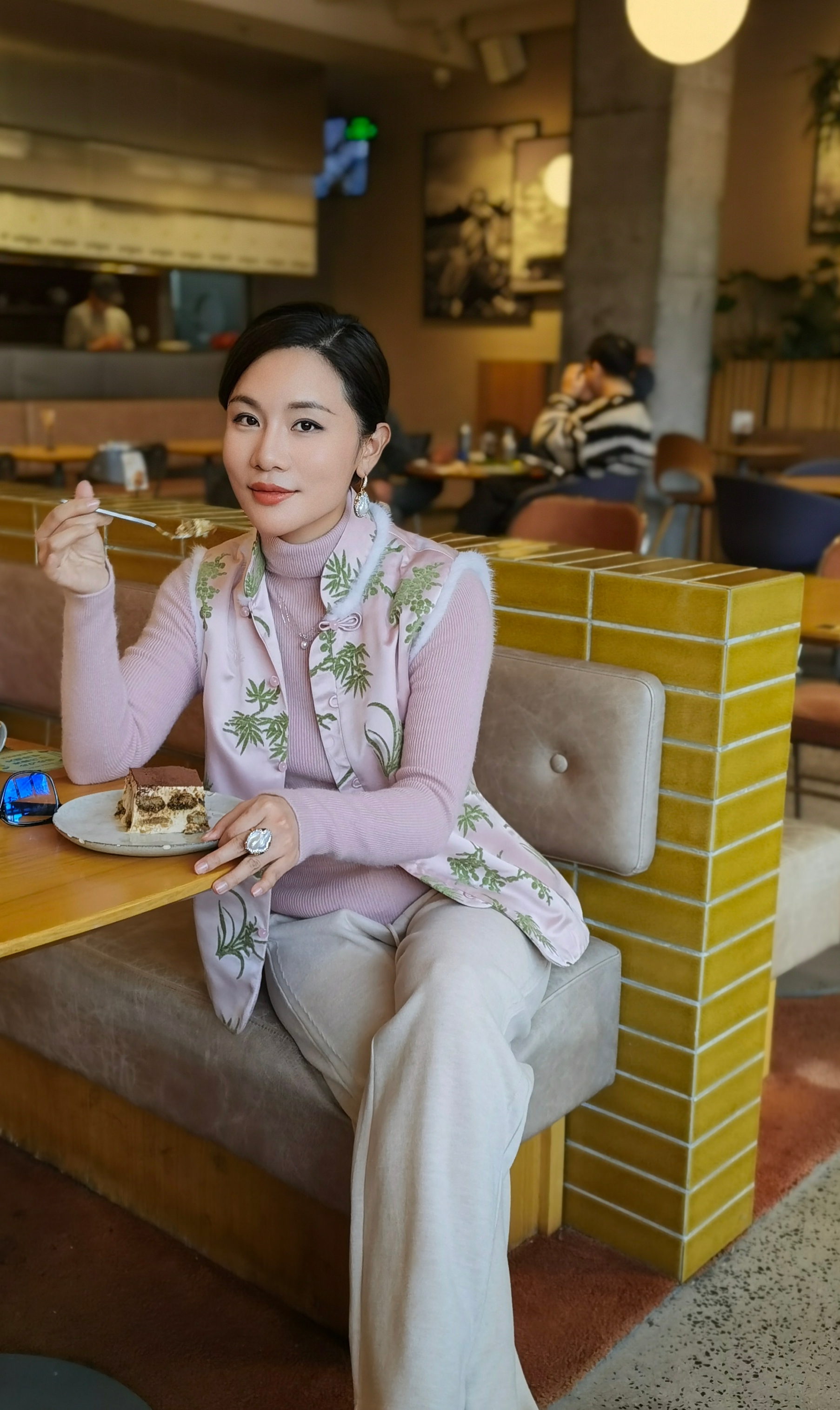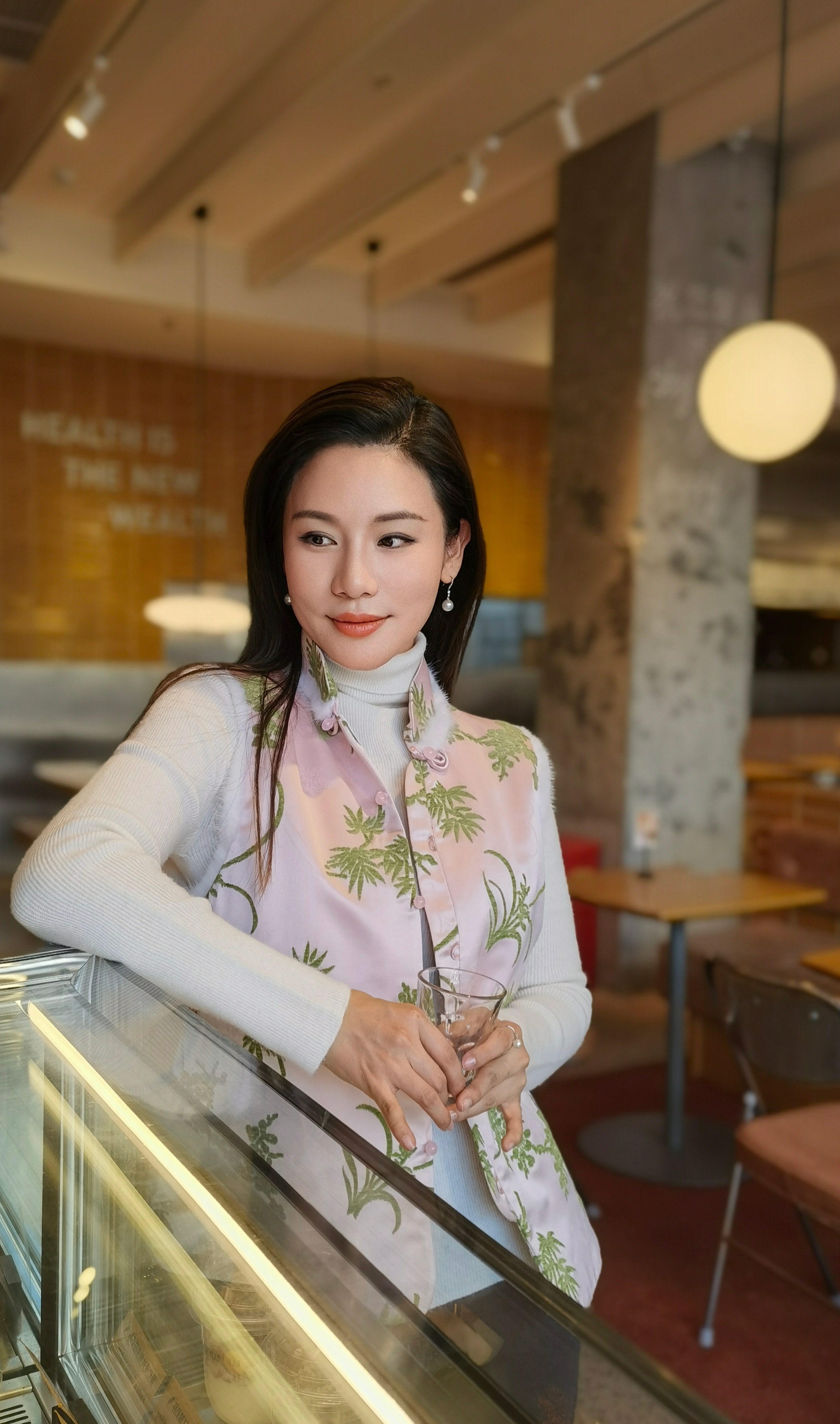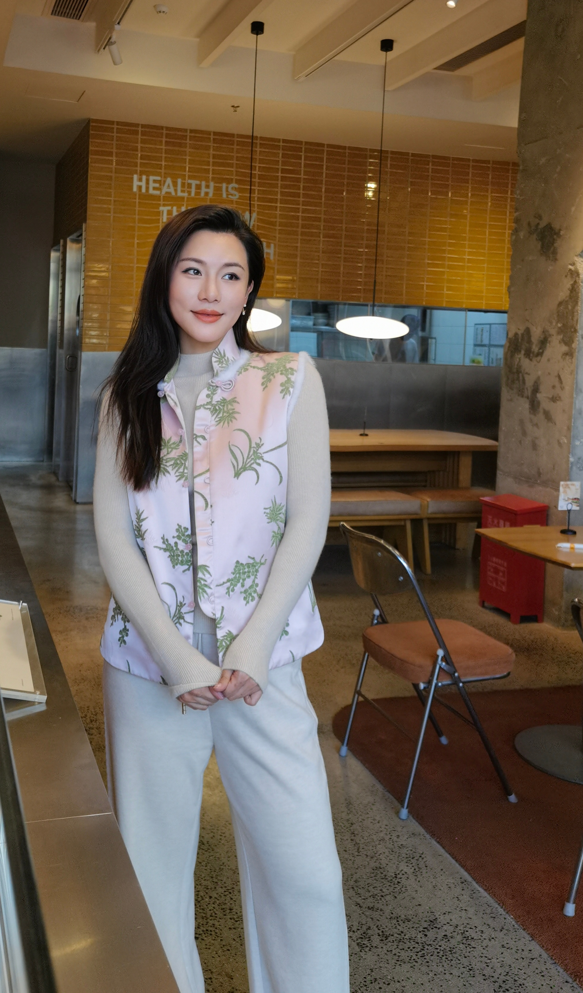杨幂就把新中式马甲叠穿在工装夹克里面,也特别好看,她真的很爱新中式,也是真的在不遗余力地宣传新中式服饰。