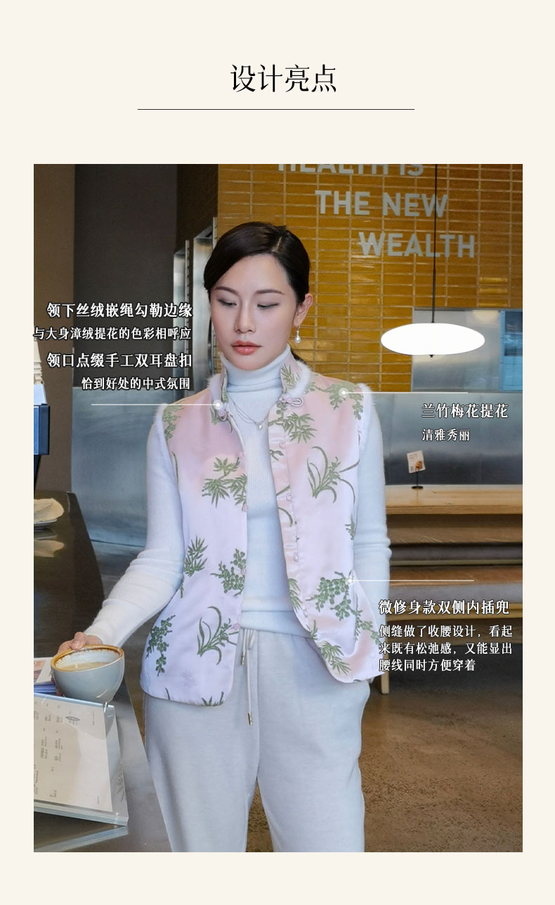 🌸里料:配以提花里布,再其中加以薄棉,手感平滑,精致美观,很保暖。