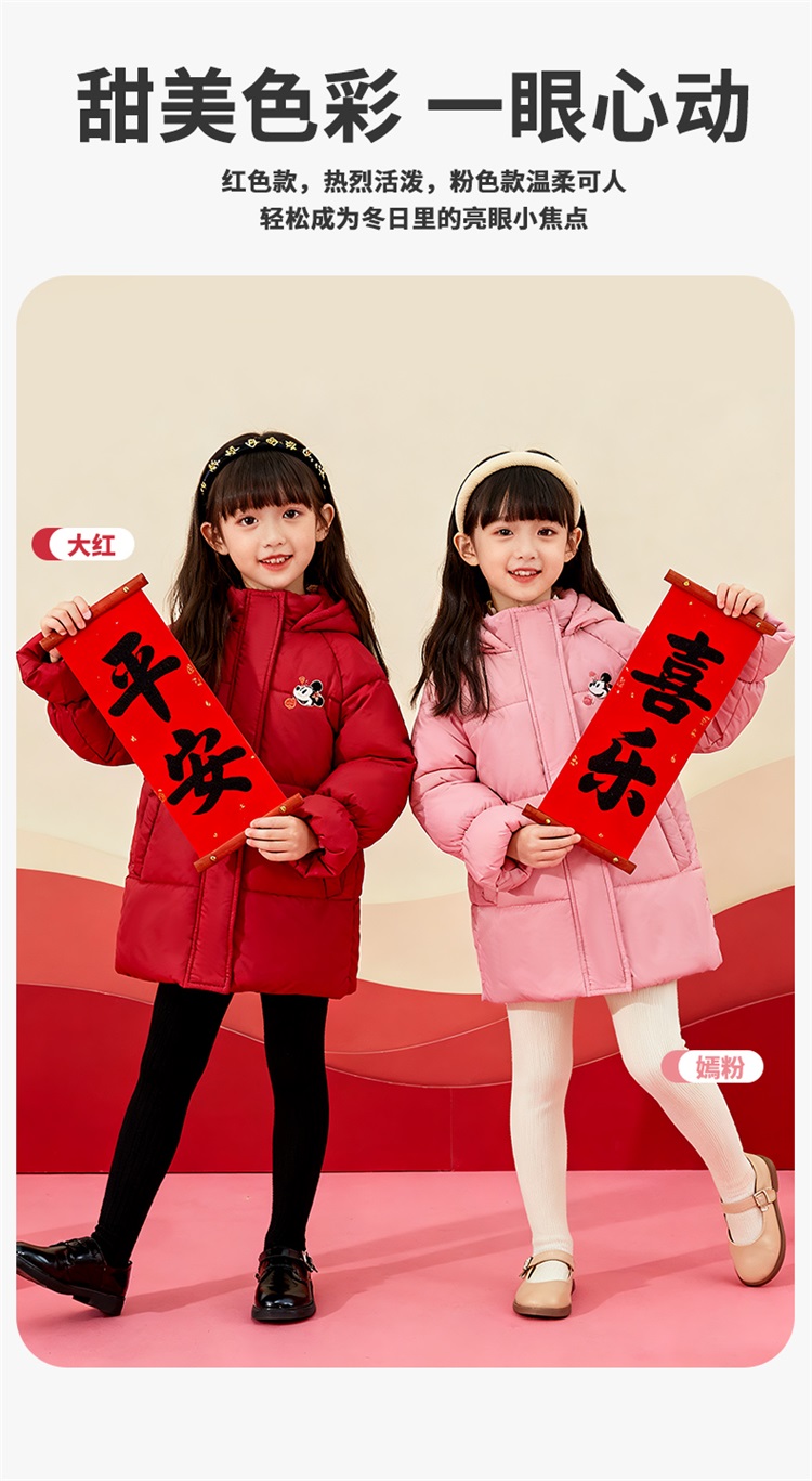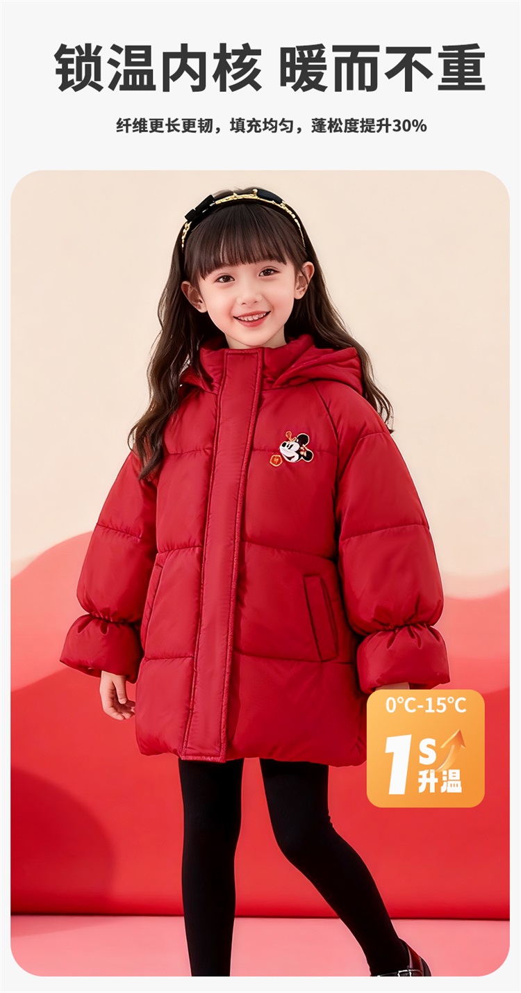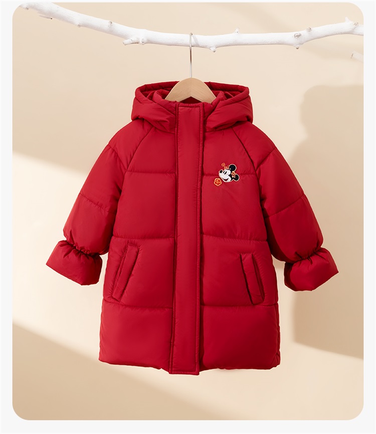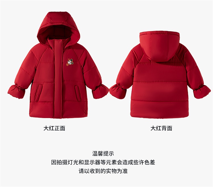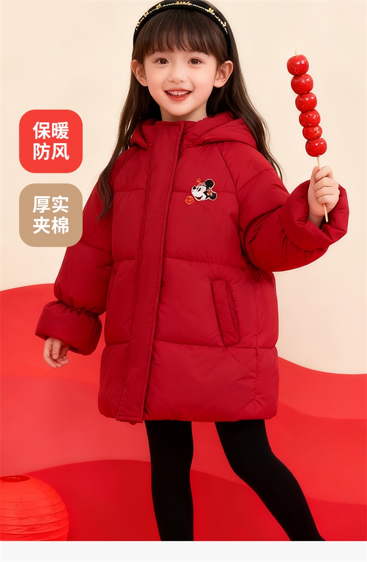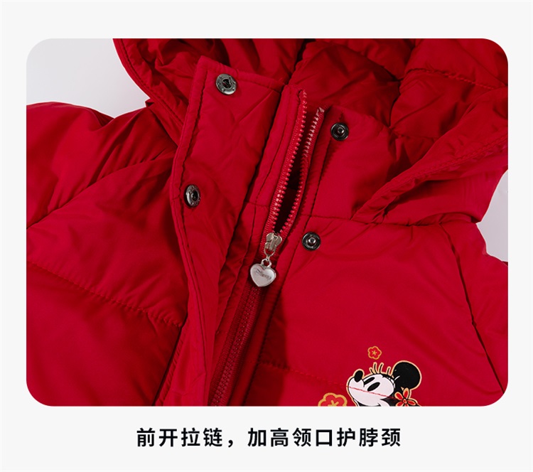 迪士尼(Disney) Baby女童夹棉保暖卡通红色喜庆外穿连帽中长款棉服秋冬新款外套