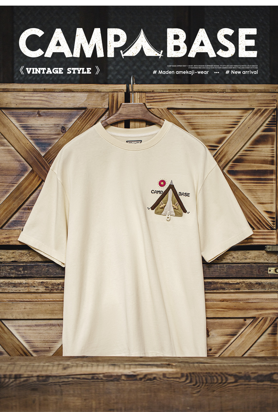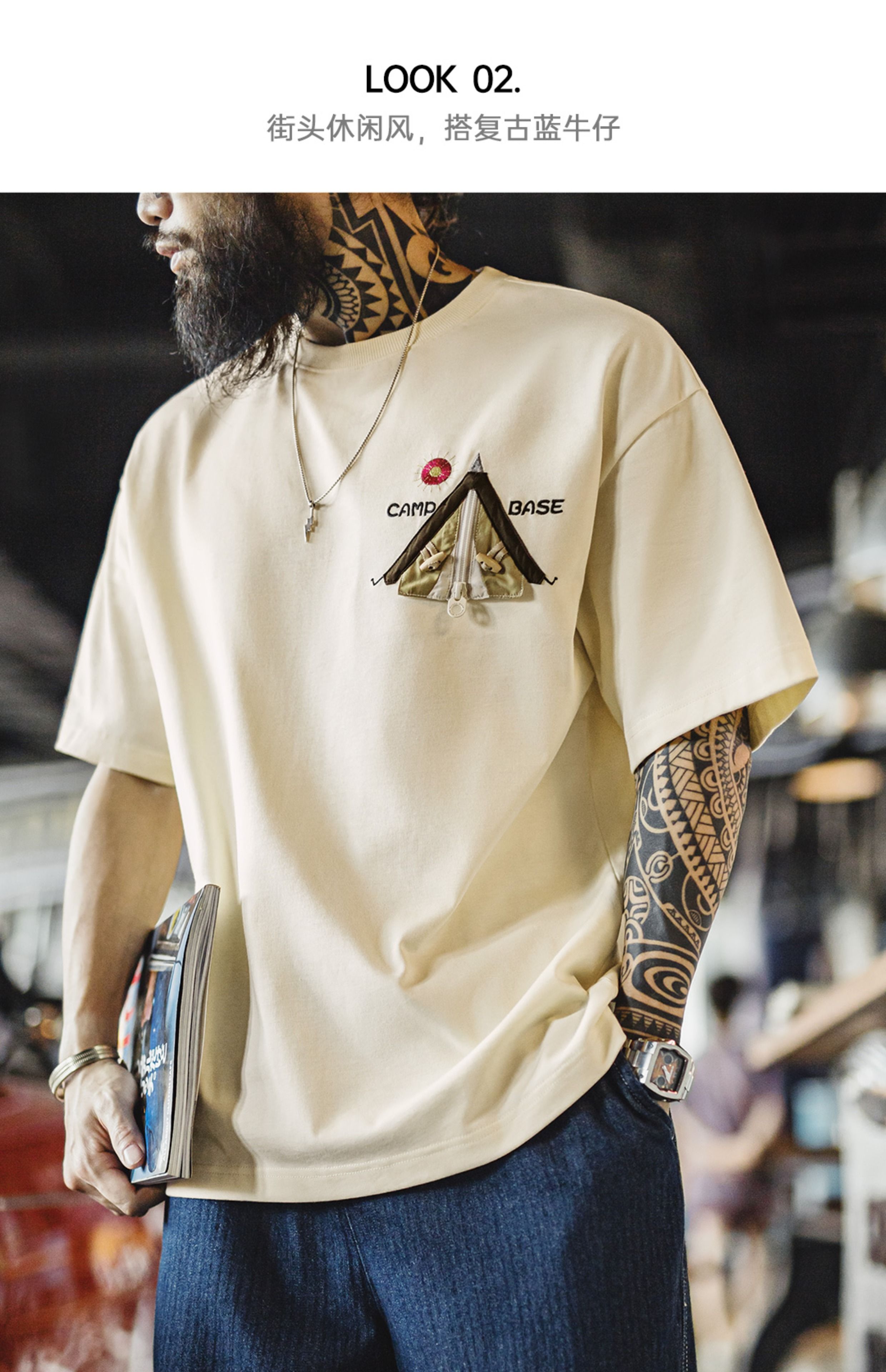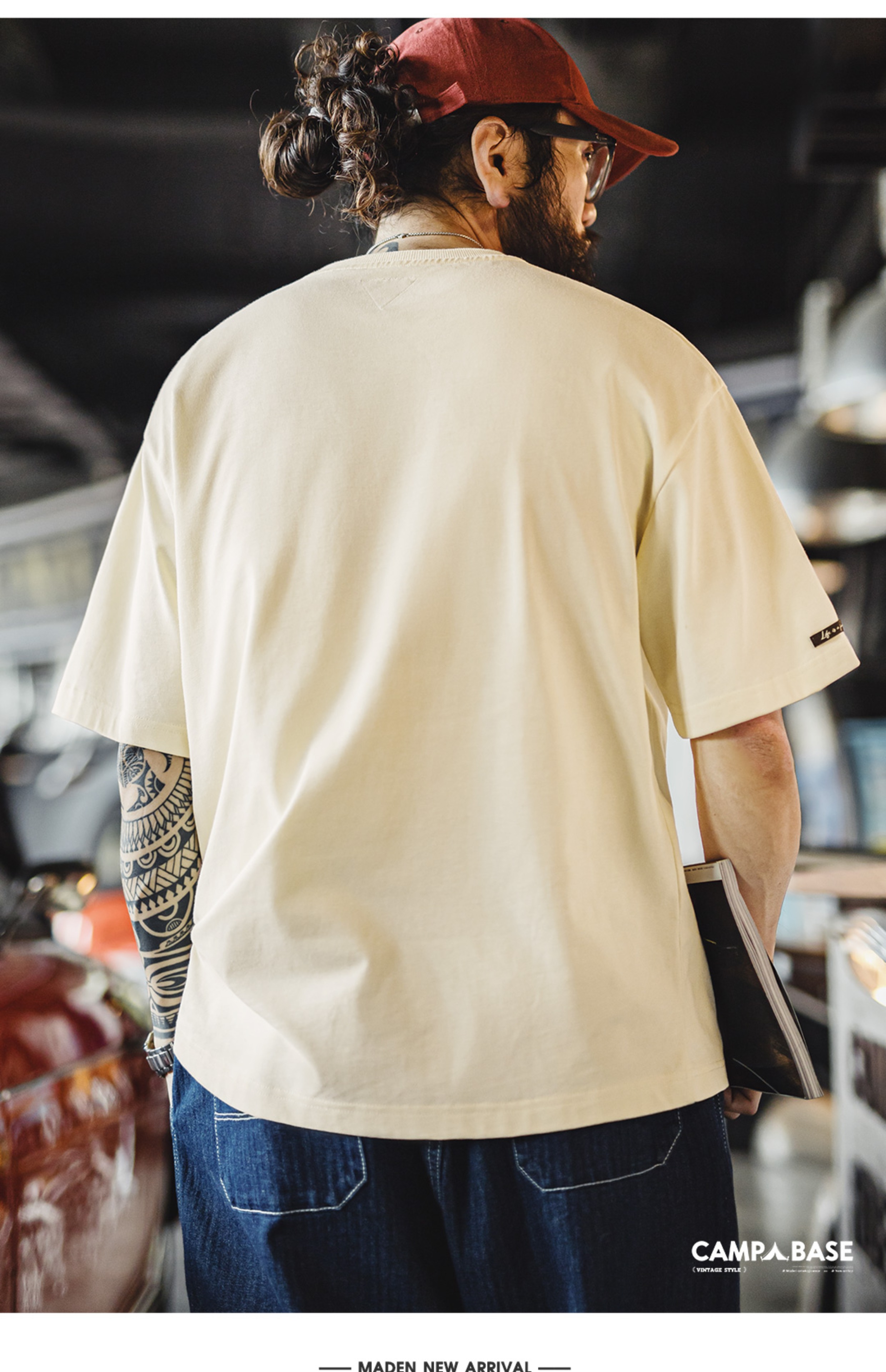 马登工装美式创意刺绣T恤米白色纯棉重磅半袖螺纹领口短袖男夏季