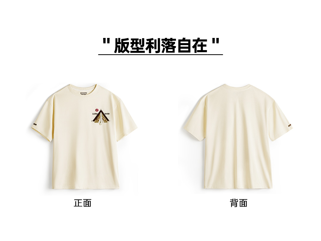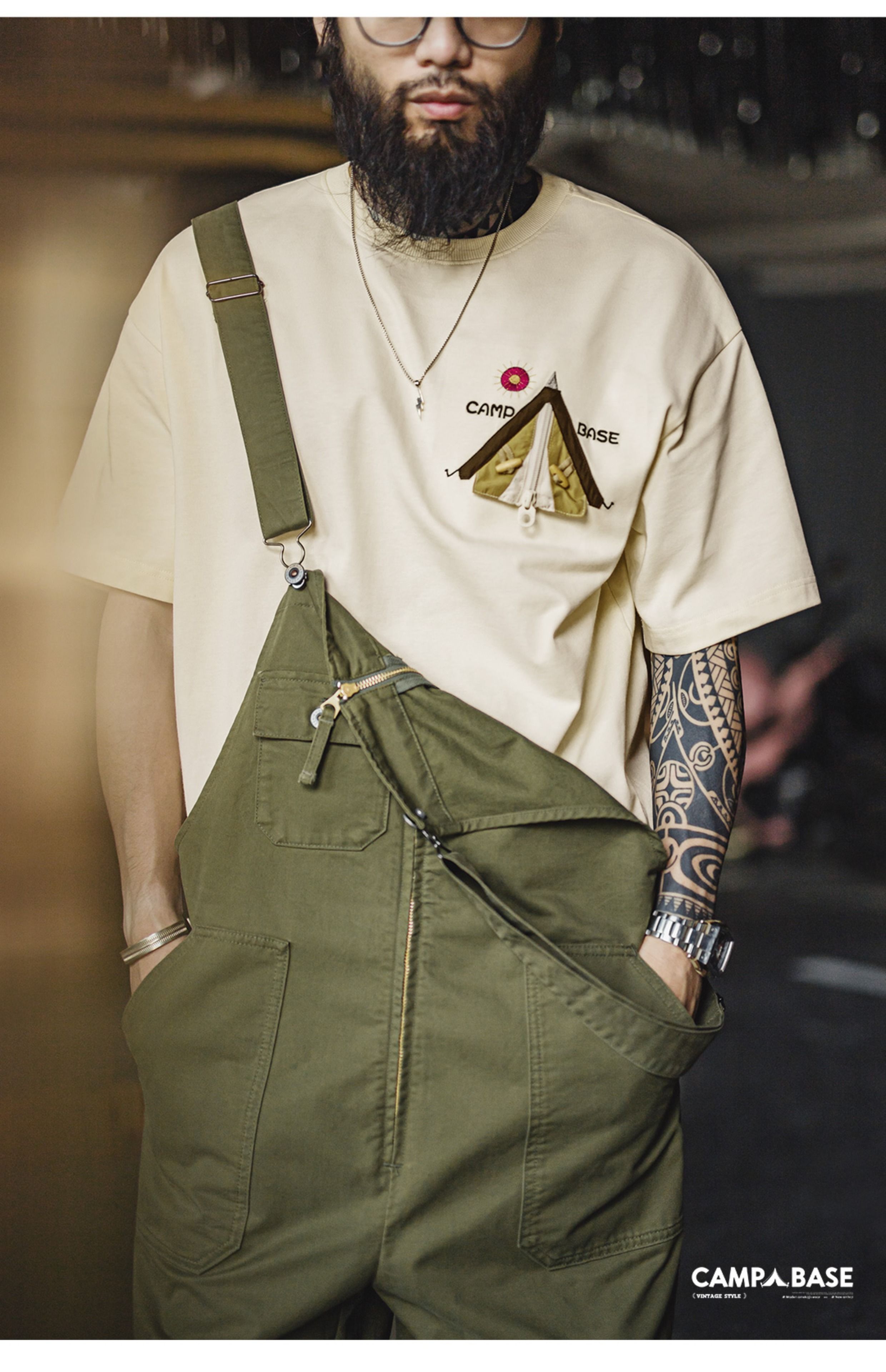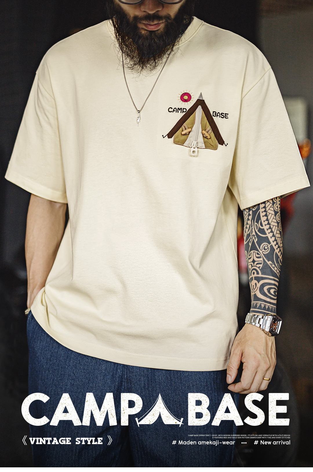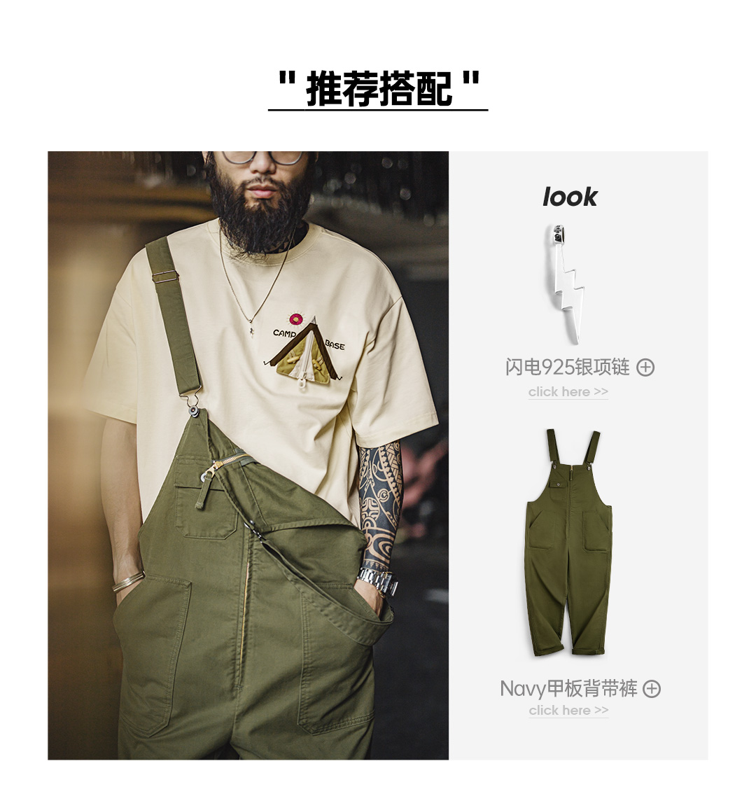 马登工装美式创意刺绣T恤米白色纯棉重磅半袖螺纹领口短袖男夏季