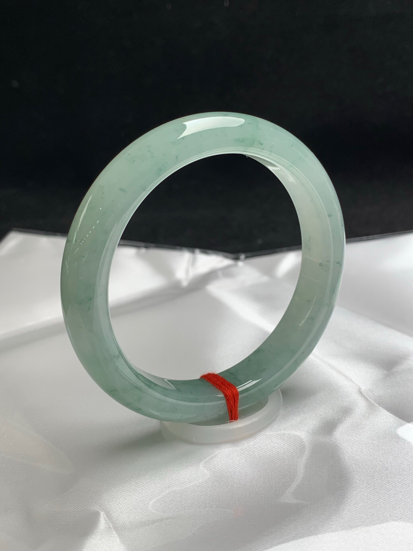 612366,55.5圈口,糯冰飘花正圈平安镯,晴水绿底色飘淡花,种水好,花色多的部位有轻微浮棉,其余部位冰润有光感,完美无裂,尺寸:55.5-12-8.2,超值价💰13000