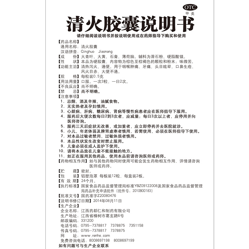 仁和 清火胶囊 0.5g*24粒/盒 风热感冒扁桃体炎头痛疼痛红肿牙痛