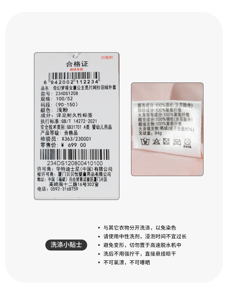 迪士尼公主冬季女童羽绒外套234DS1208