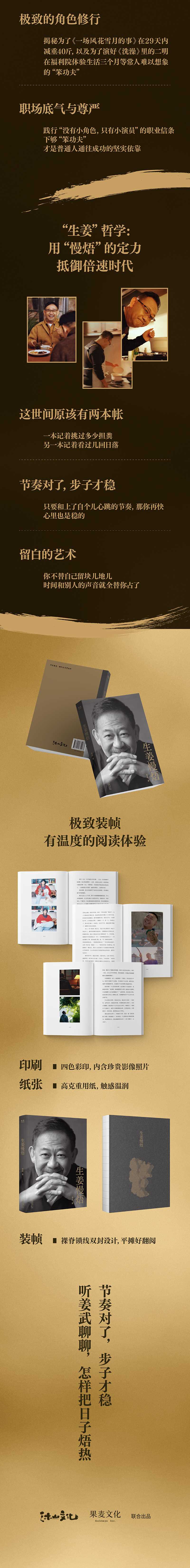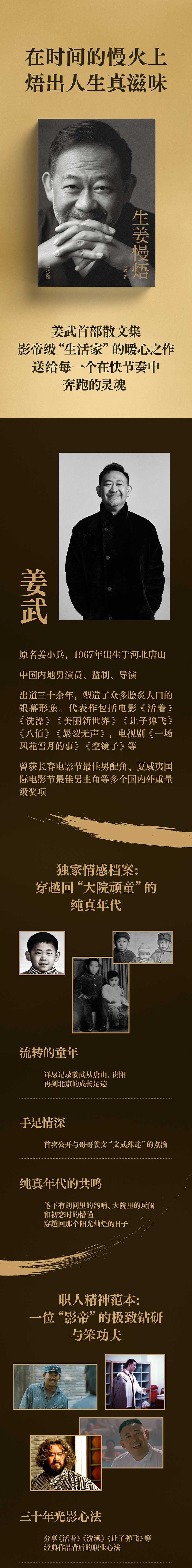 《生姜慢焐》是演员姜武的首部自传散文集。全书以;文火慢炖为喻,将姜武五十余年的人生阅历、演艺生涯与生活哲学娓娓道来。