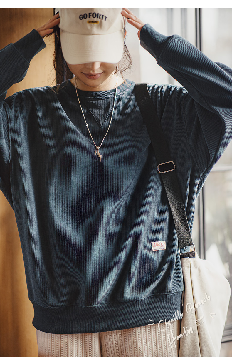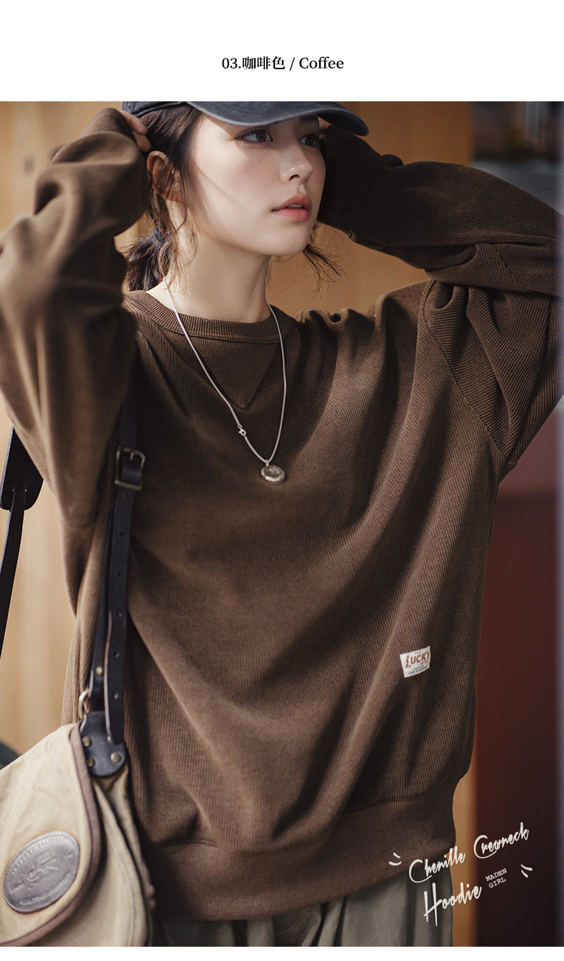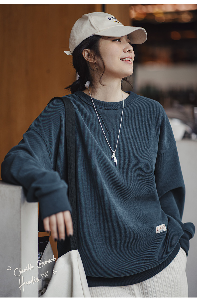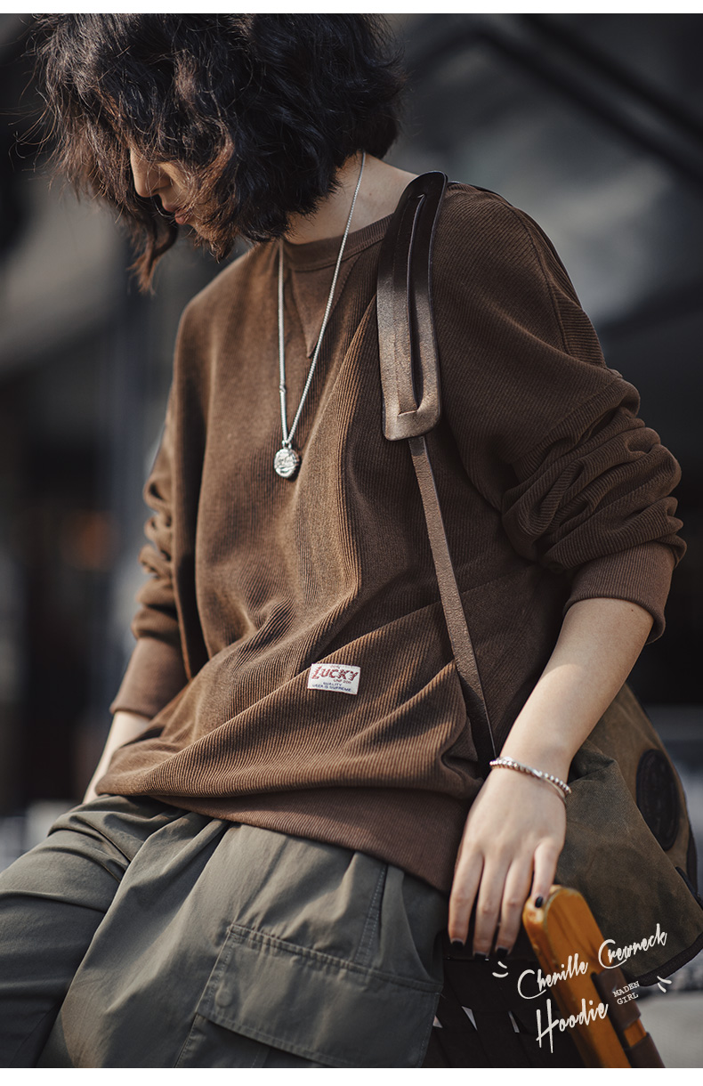 马登美式复古雪尼尔卫衣女秋套头长袖打底T恤插肩袖圆领上衣女