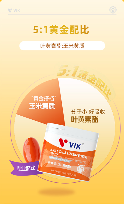 叶黄素酯与玉米黄质 5 : 1 天然比例,协同作用黄斑区,双效阻挡有害光。