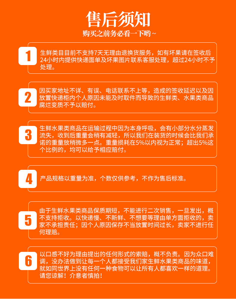 2.受光照、气候等环境因素,个别果肉颜色分布不均匀且深浅不一,属于正常现象,收到后可放置冰箱冷藏几天,口感依旧酸甜美味哟~这种情况不在售后范围内,介意者慎拍