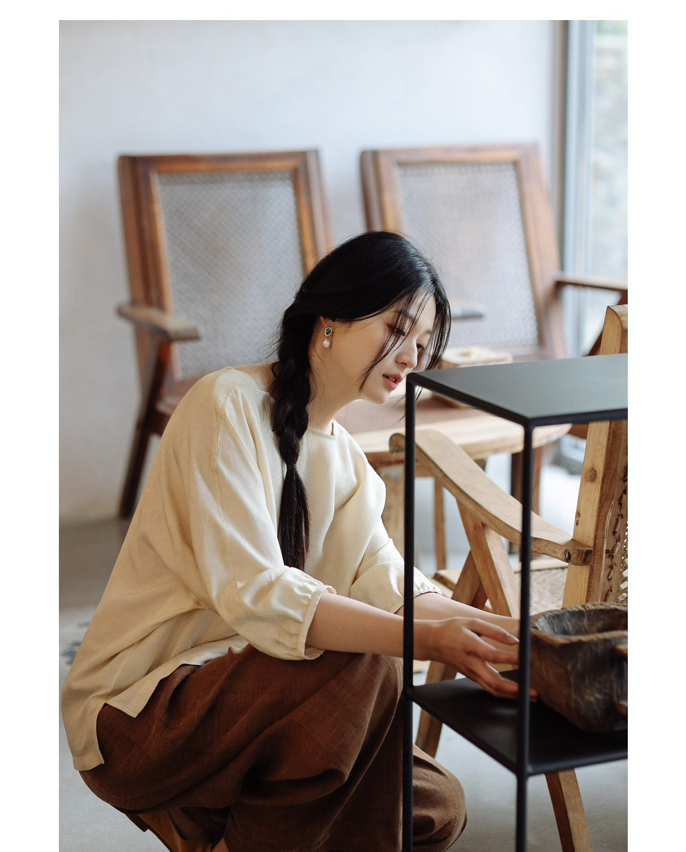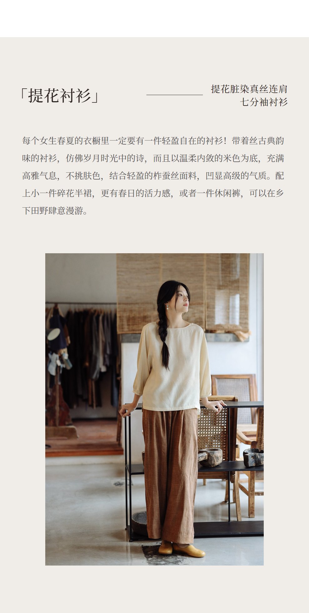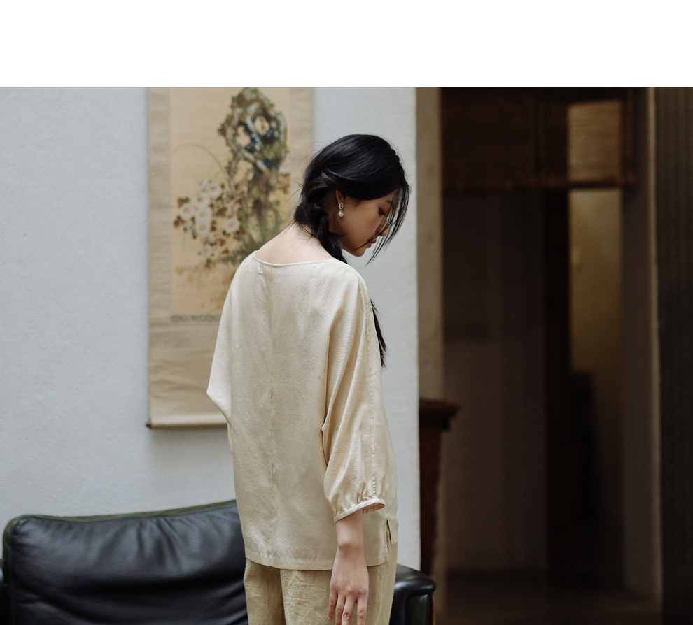 绽放198朵/真丝桑蚕丝19姆米柞蚕丝提花脏染米杏色休闲衬衫