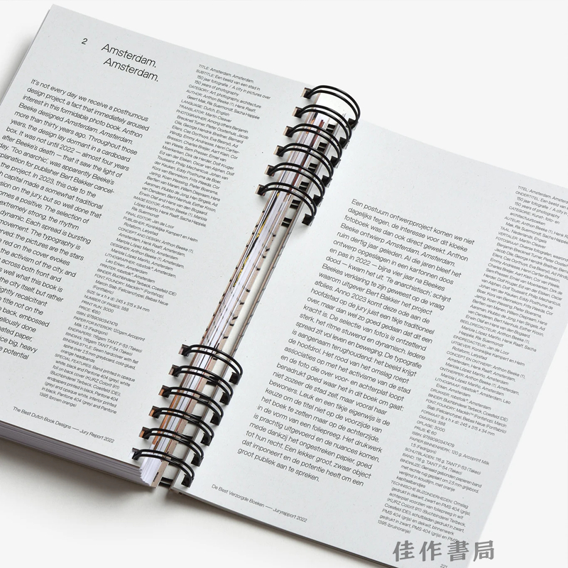 《2022年荷兰最佳书籍设计》由Akiko Wakabayashi操刀设计,以视觉语言呈现了33件获奖作品的评审全记录。图录除收录探讨年度发展趋势的导言外,更特别邀艺术家Natasja Kensmil撰写了致书籍的情书。全书以每本获奖图书的精密技术参数作为压轴章节,构建完整档案。本届获奖作品将于阿姆斯特丹市立博物馆及荷兰内外多个艺术空间巡回展出,延续历年传统。