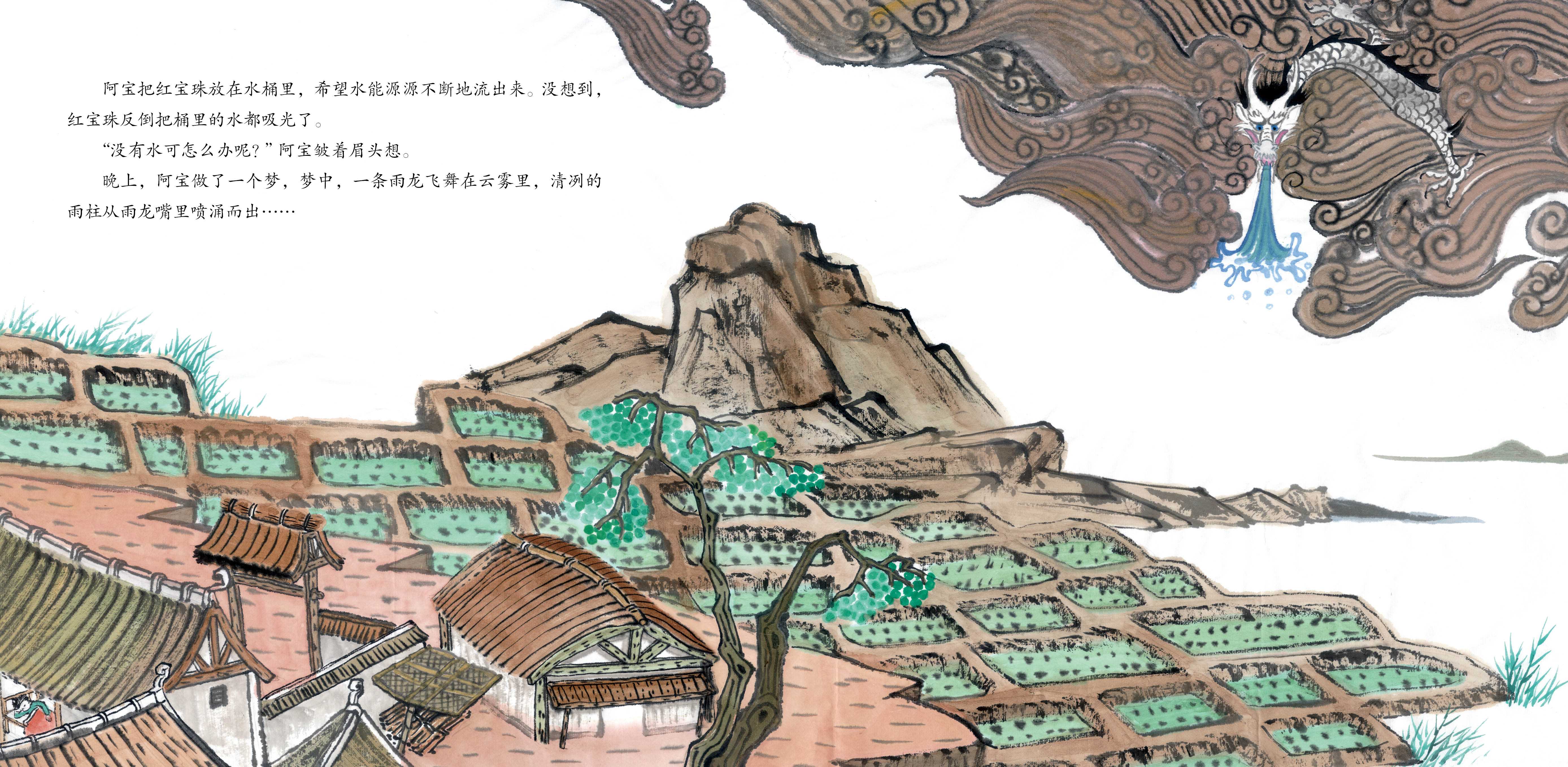 《雨龙》讲述了关于中国龙的传说,主人公阿宝化身雨龙帮助乡邻们摆脱干旱困境的故事,向孩子们传递了互助、勇敢、舍己为人等美德善行。