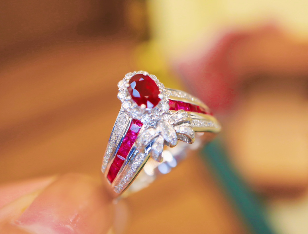 523034 鸽血红红宝石戒指 石重:0.92(0.46+0.46)ct,总重:3.53g,钻石:0.282ct/66颗,圈口:13.5号 18K白金 真金真钻石 超值价:5280