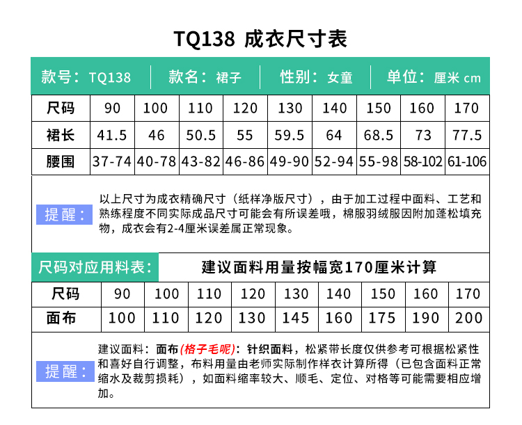 裁缝学苑TQ138女童半身裙纸样儿童格子裙毛呢裙中长款裙子样板