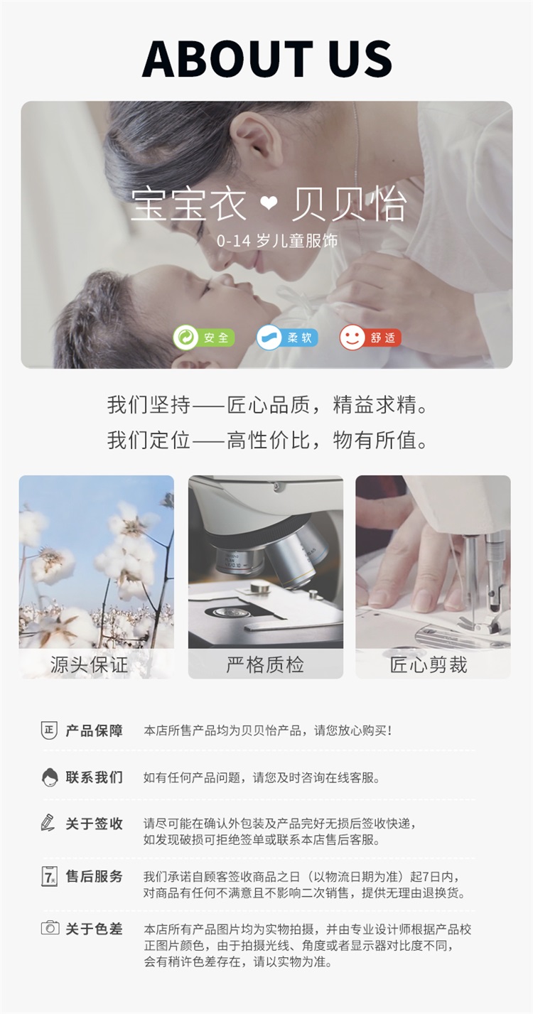 - 贝贝怡专注0-6岁婴幼儿服饰,坚持安全、柔软、舒适的产品理念,为千万中国家庭提供超高品质、安全可靠的婴幼儿服饰产品,妈妈放心,宝宝开心!