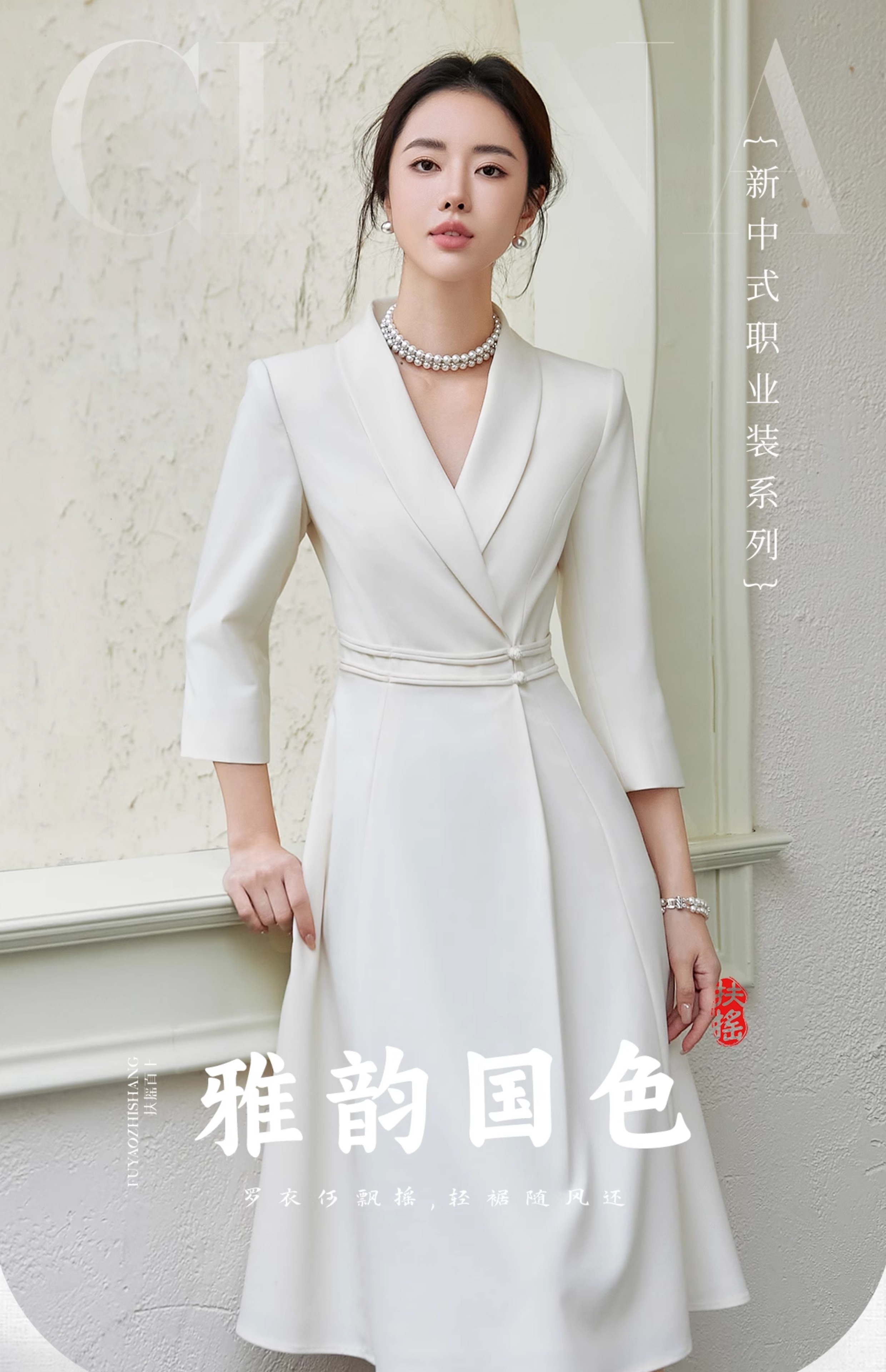 FUYAO扶摇 中华风连衣裙女修身显瘦西装裙优雅七分袖高级大摆裙夏