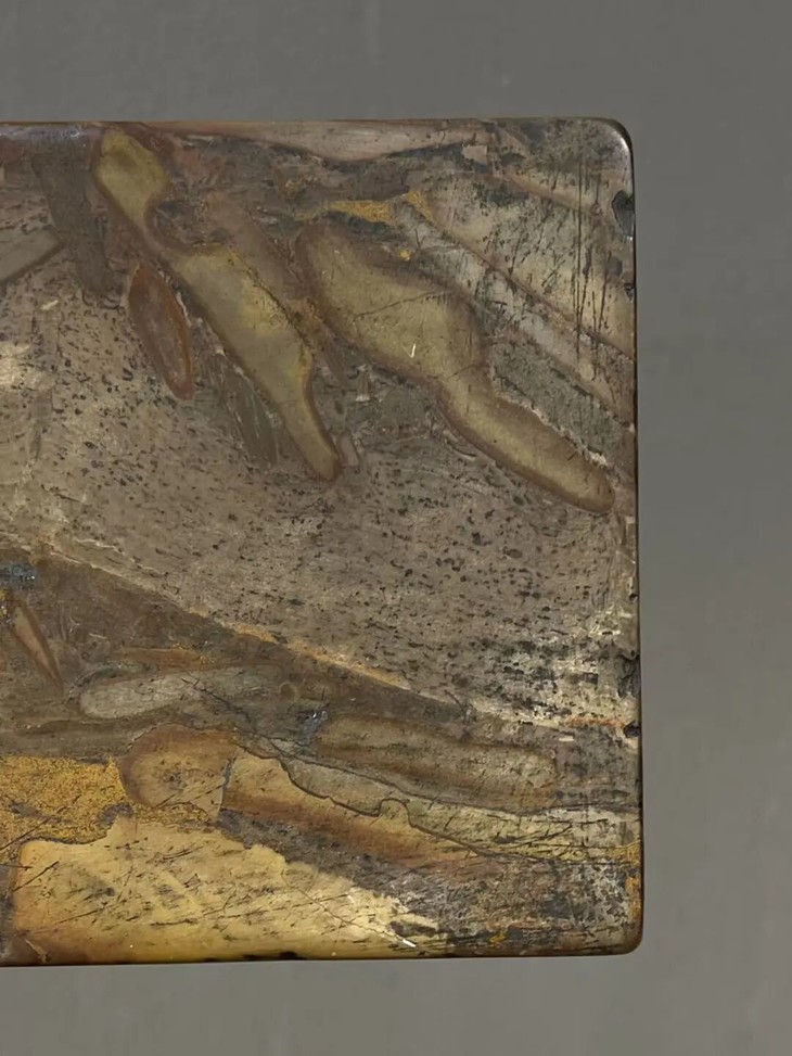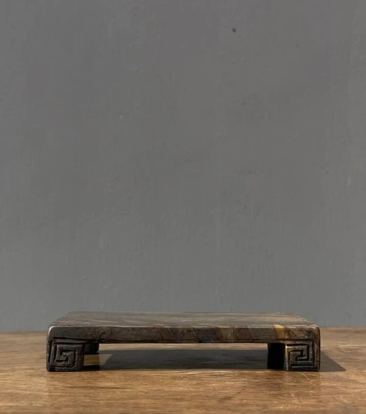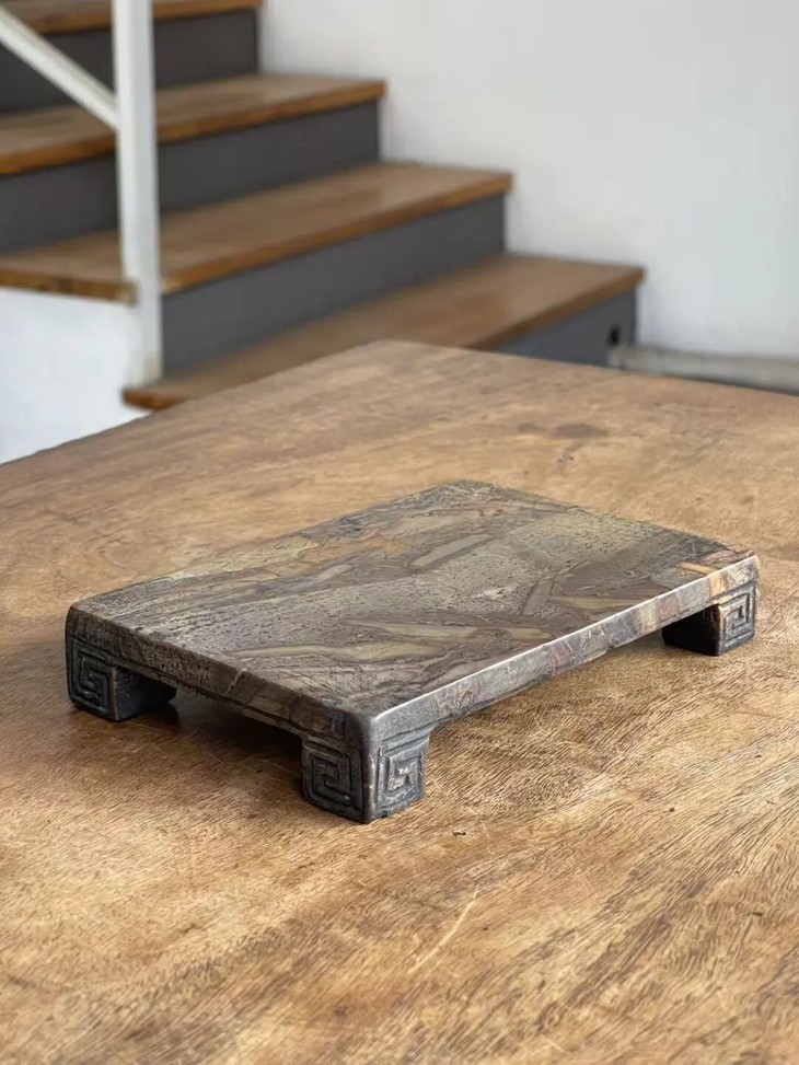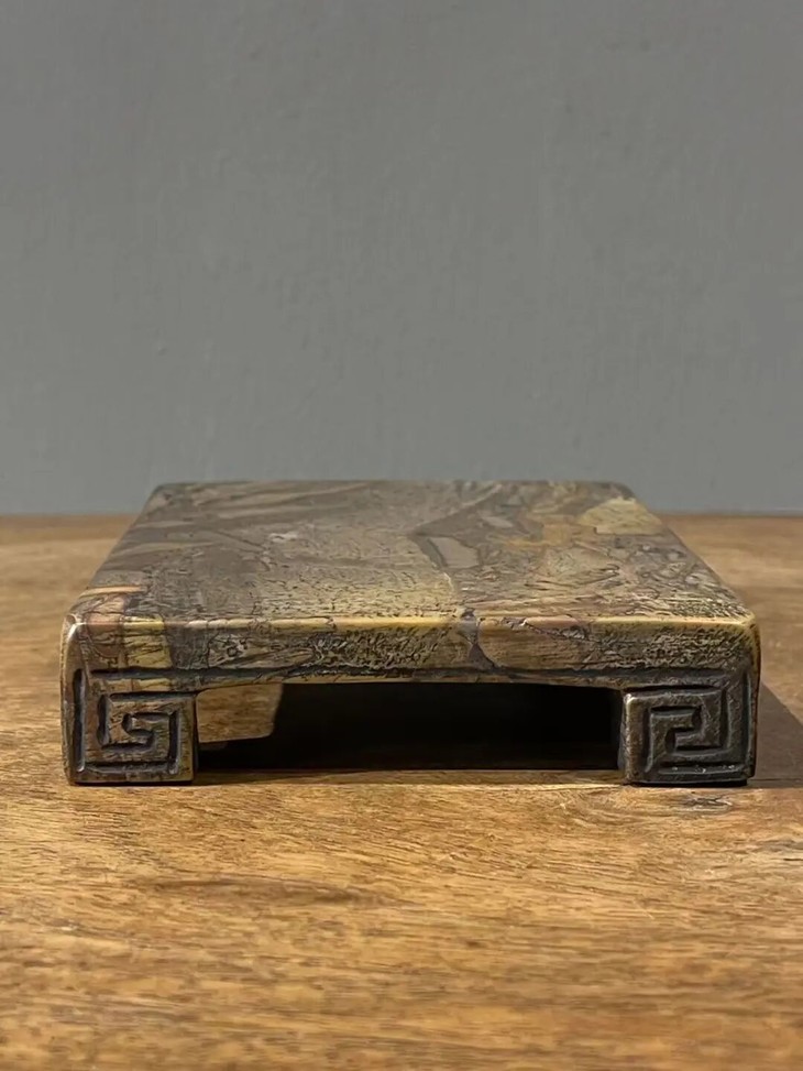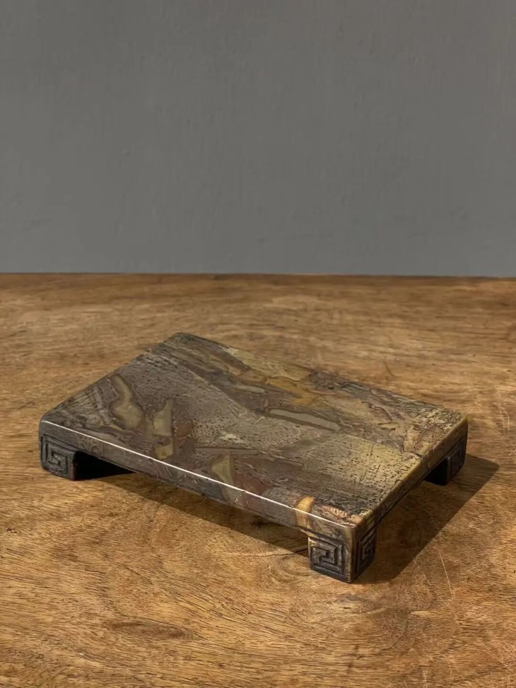 这是一只非常罕见的天然布丁石琢磨而成的赏玩与摆设器物的长方形四足台座,天然石纹清晰流畅,整块厚石板雕琢成优雅的双回纹四足长方案几形台座,质地坚硬细腻的天然布丁石长年经历代文人把玩摆设。布丁石产于甘肃省境内,外观像砾岩,是一种优质的透闪石软玉,布丁石不透明,略透光,糯如凝胶,视觉上给人一种弹性质感,纹理状若布丁而得名,明代开始为文人爱戴,常见于砚台,鼻烟壶,笔洗,与各式文房用具。
