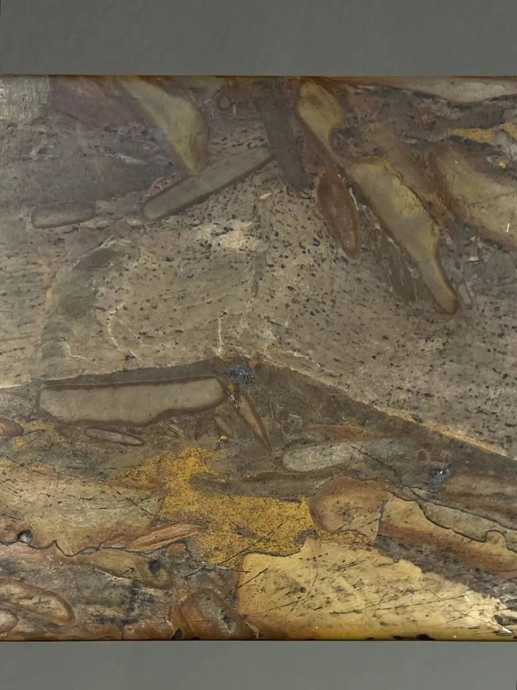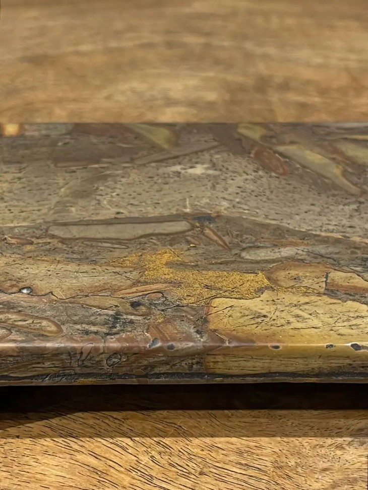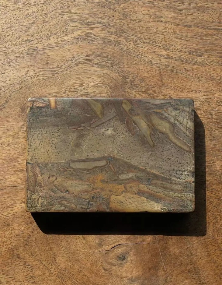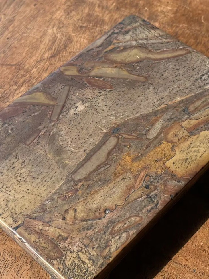 这是一只非常罕见的天然布丁石琢磨而成的赏玩与摆设器物的长方形四足台座,天然石纹清晰流畅,整块厚石板雕琢成优雅的双回纹四足长方案几形台座,质地坚硬细腻的天然布丁石长年经历代文人把玩摆设。布丁石产于甘肃省境内,外观像砾岩,是一种优质的透闪石软玉,布丁石不透明,略透光,糯如凝胶,视觉上给人一种弹性质感,纹理状若布丁而得名,明代开始为文人爱戴,常见于砚台,鼻烟壶,笔洗,与各式文房用具。