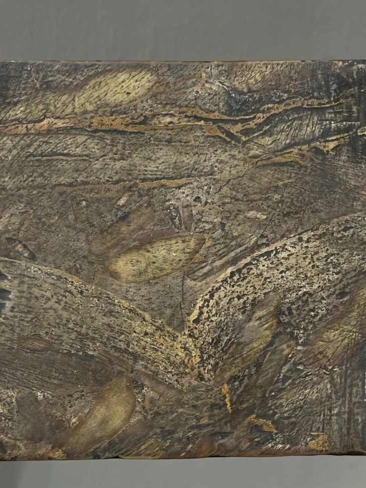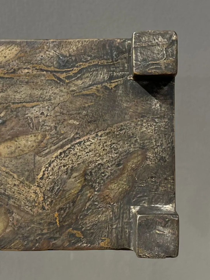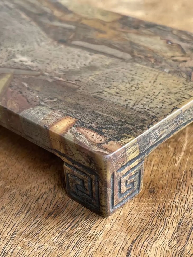 此件天然布丁石长方形四足台座之纹理浑然天成,清晰可见抽像前卫之自然纹饰,厚块原石切割琢磨成案几形四足台座,尺寸不小,比例线条优美,触感温润舒适,置于案头可为器物底座,是佛教徒藏家用为随身佛像或是器物底座,形式简约典雅,表面因长年把玩形成的包浆皮壳更加令人赏心悦目,是年代很老的台座。