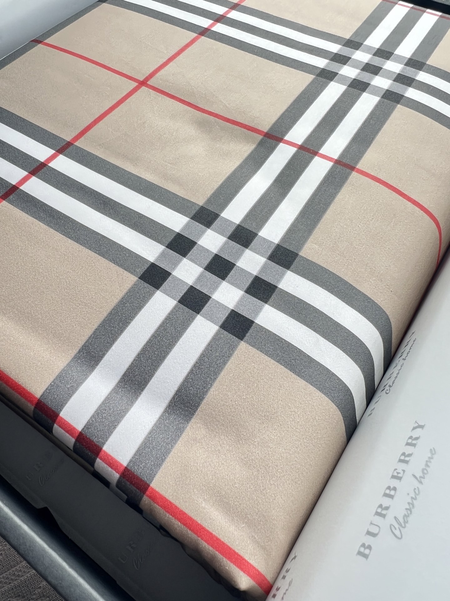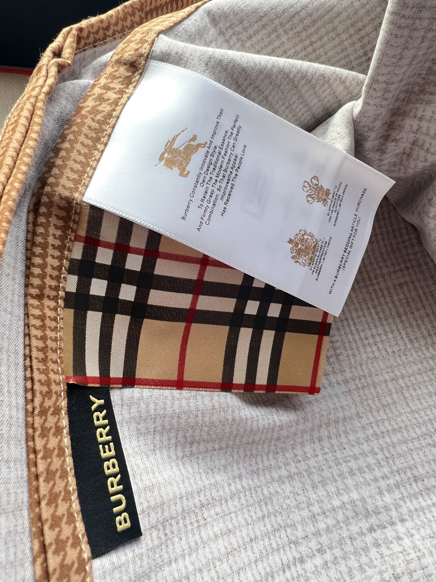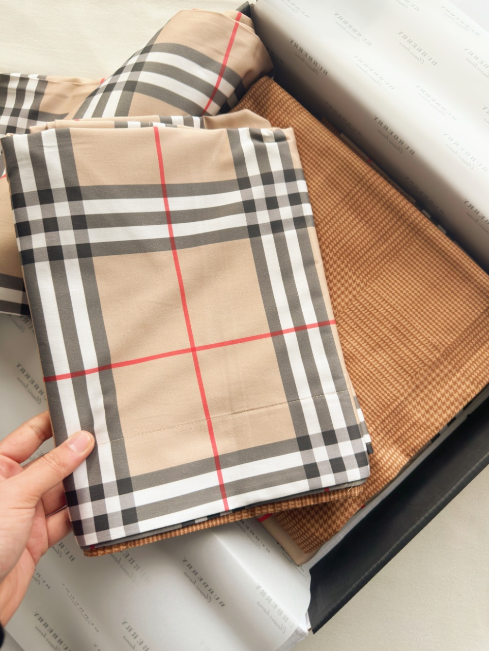 百年英伦格纹BURBERRY 家居品类终于上床品了!这款床品是与其重要供应商鲁泰纺织(供应了芭宝莉90%的衬衣面料和风衣面料)定制的,其核心面料埃及长绒棉(吉萨45特级长绒棉)源自埃及尼罗河流域核心产区,这些棉花以纤维长、细度高著称,是“棉中白金”。其纤维长度可达35mm以上(远超普通棉的25mm),细度仅1.2旦尼尔,织出的面料如肌肤般丝滑亲肤,更环保安全。埃及棉面料纤维中含有的天然中空结构,让床品兼具“夏季透气不粘腻,冬季锁温更蓬松”的双重奢享;