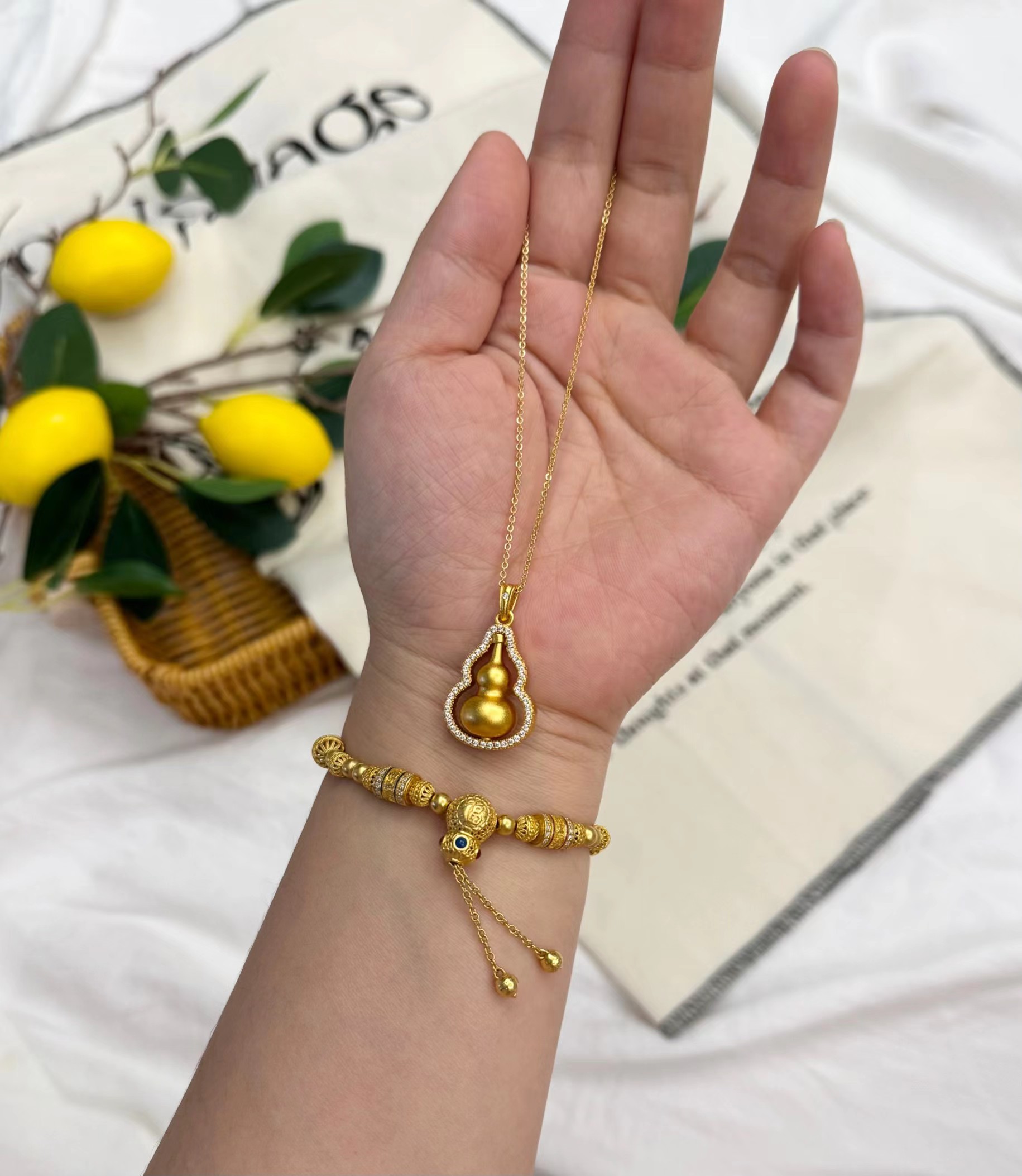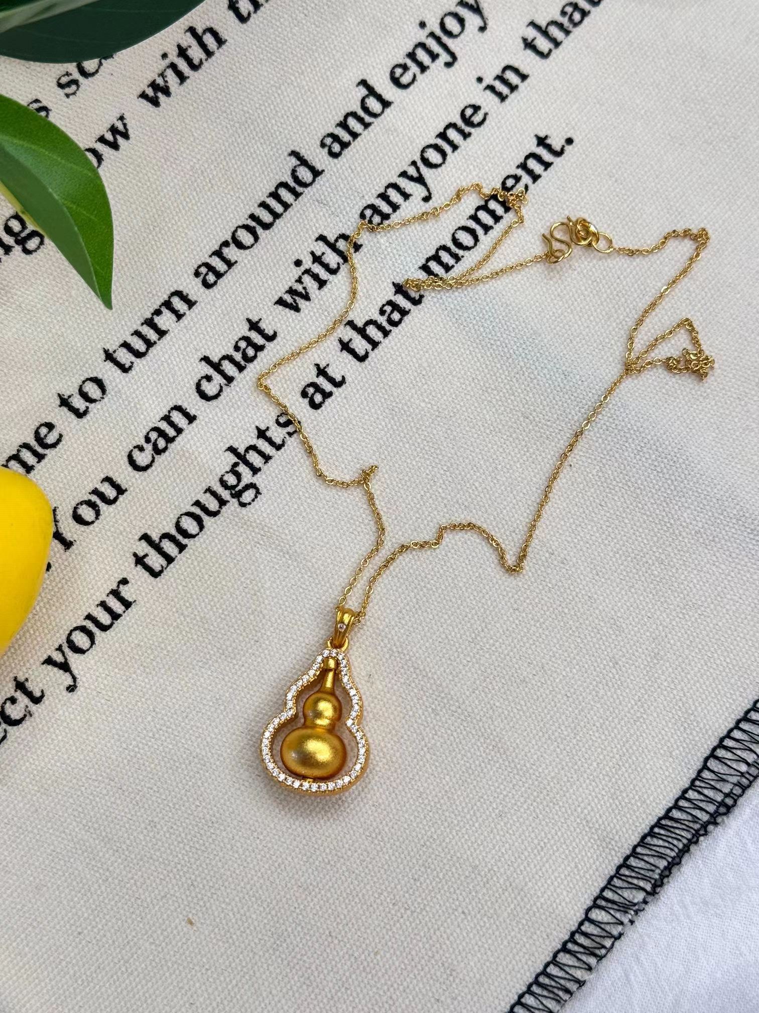 古法沙金点钻福禄葫芦项链。葫芦可旋转哦,葫芦在中国文化可是个妥妥的“吉祥物”,寓意福气,好运,长寿的代名词。“葫芦”代表着“福禄”口小肚子大,像一个聚宝盆,寓意把福气,财运逗聚拢起来,好运满满。注:佩戴请注意保养!避免汗渍,化学用品,洗澡,睡觉尽量摘下,不佩戴时记得放到密封袋里!