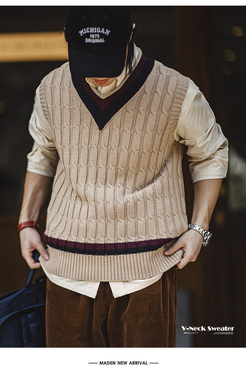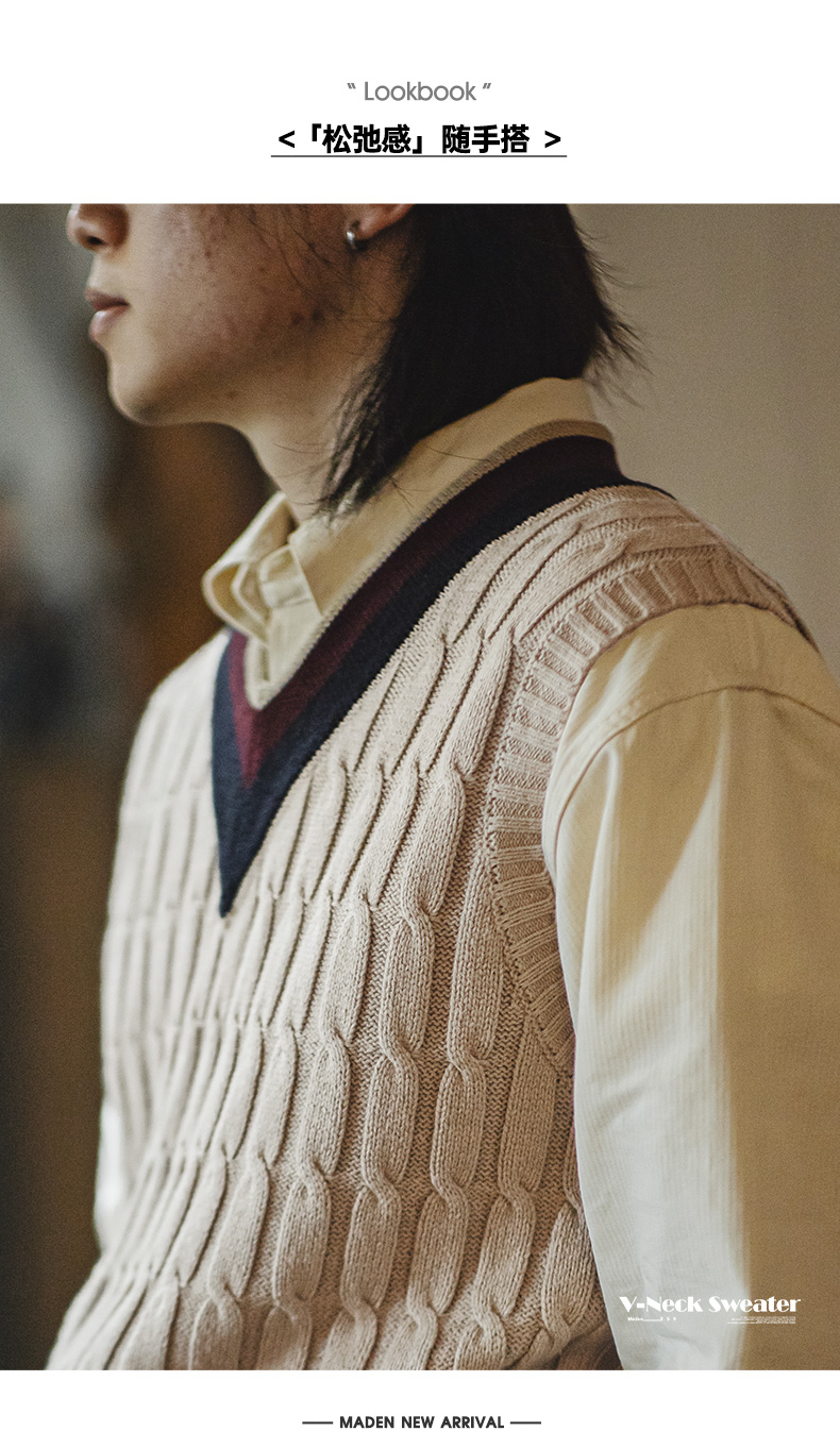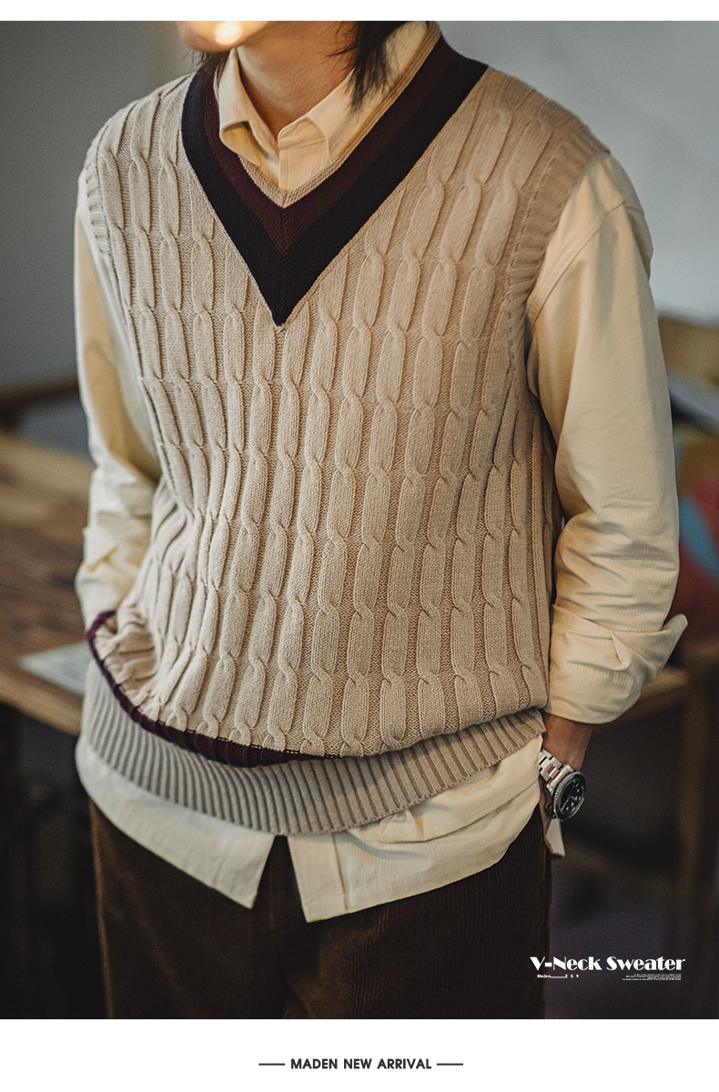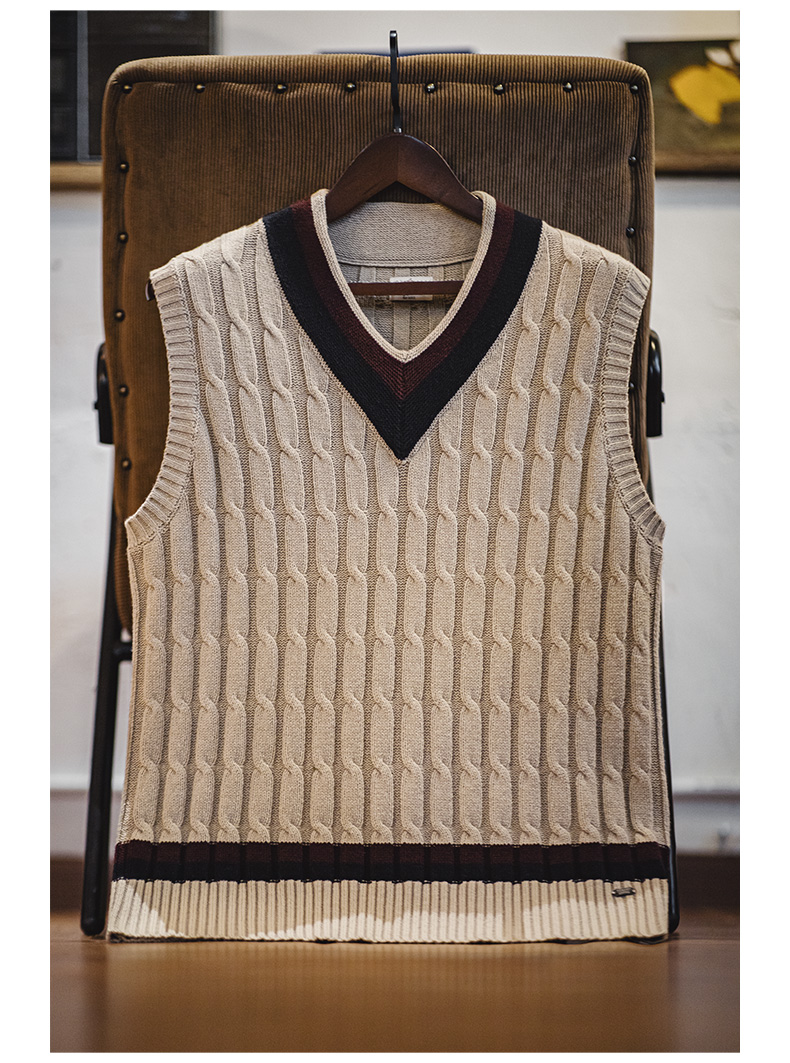工装优选美式复古IVY针织V领毛衣背心学院风撞色绞花无袖马甲男秋