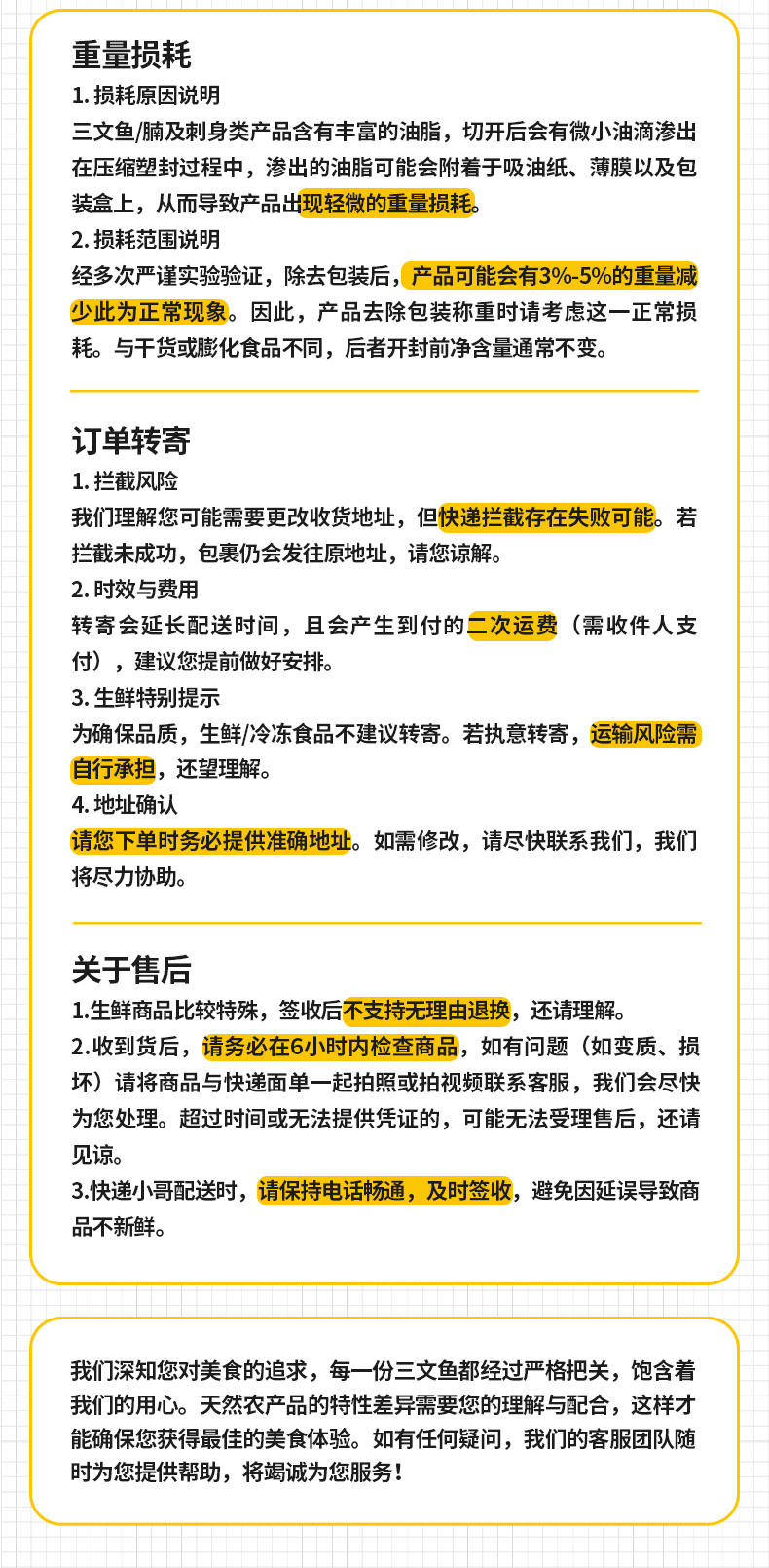 3、生鲜水果非标品众口难调,所有口感不好、品相不好、表皮轻微擦伤、地址不详、电话错误、乡镇地址、超区都不在售后范围。