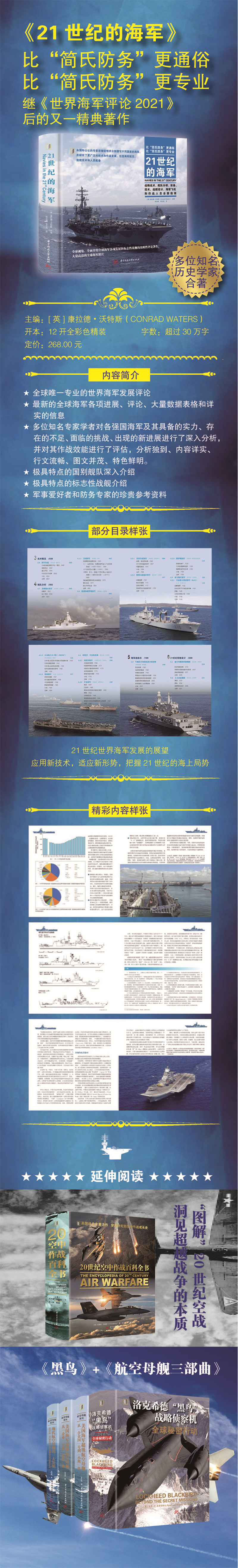 海军在现代世界中存在的目的是什么?需要什么类型的军舰?本书探讨了自冷战结束四分之一世纪以来海军在技术和作战方面的发展,从而对这些问题给出了答案。书中阐述了21世纪海军发展的总体政治和经济背景,评估了从第一次海湾战争到俄罗斯吞并克里米亚的重大海军行动,考察了主要舰队的目标和构成的变化,描述了主要战舰类型的重要设计进展,并研究了更广泛的技术和作战发展,包括海军航空,造船技术和人员配备。本书由国际公认的专家分别撰写,作为一本简明扼要的单卷图书,其中概述了当代海军如何发展以应对今天的挑战。无论是对国防专业人士还是感兴趣的爱好者,这本书都是无以伦比的。